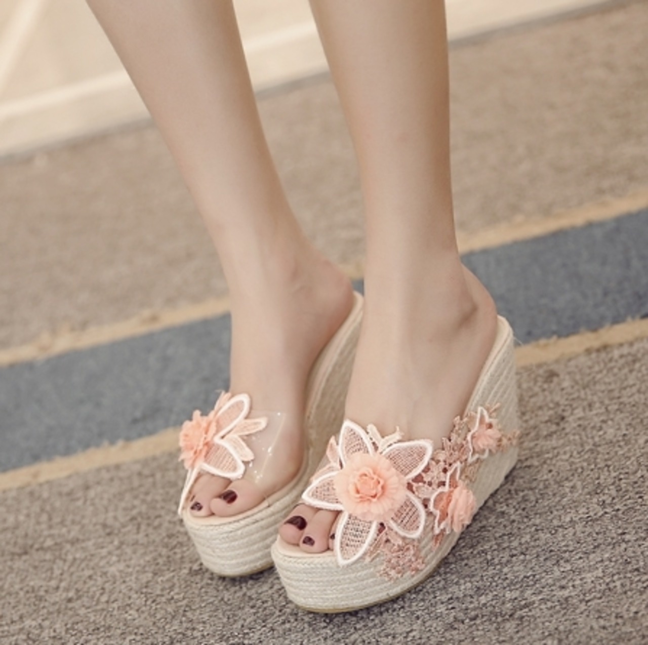 立体感のあるお花のモチーフが可愛いプラットフォームサンダルです。