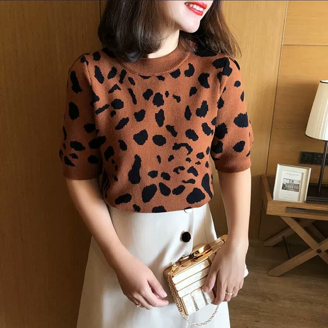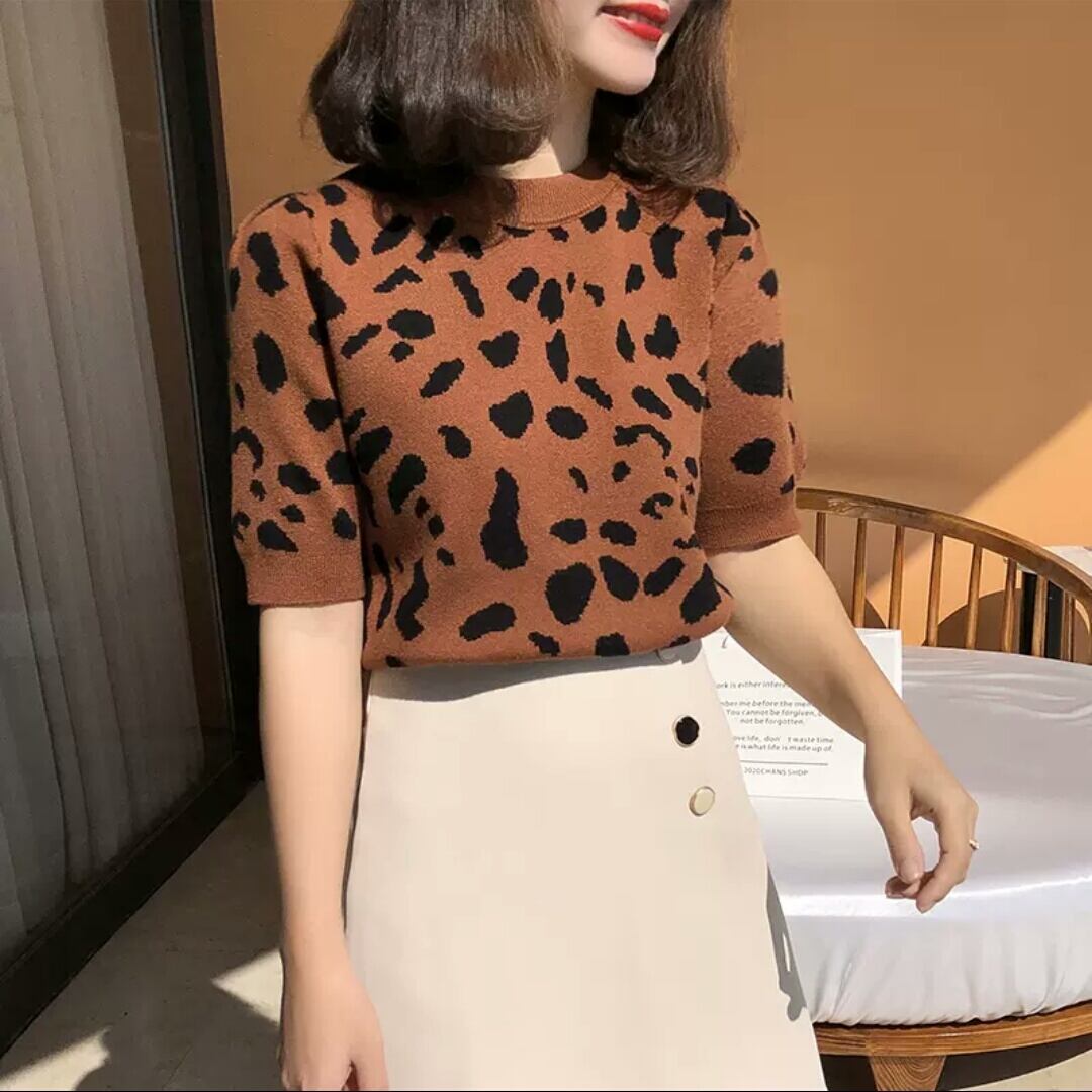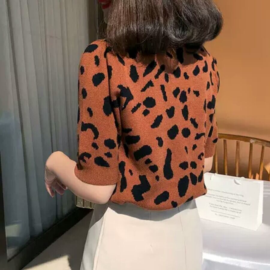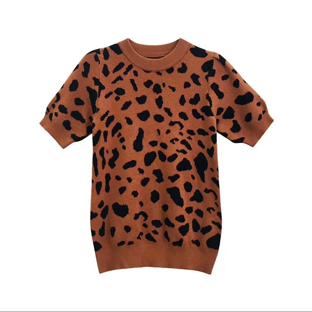 全2色 レオパード柄 ヒョウ柄 半袖 ニット セーター プルオーバー ラウンドネック 大人 カジュアル キレイめ 可愛い お出かけ お買い物 デート 女子会 春 秋 通学 学生 通勤 韓国ファッション
