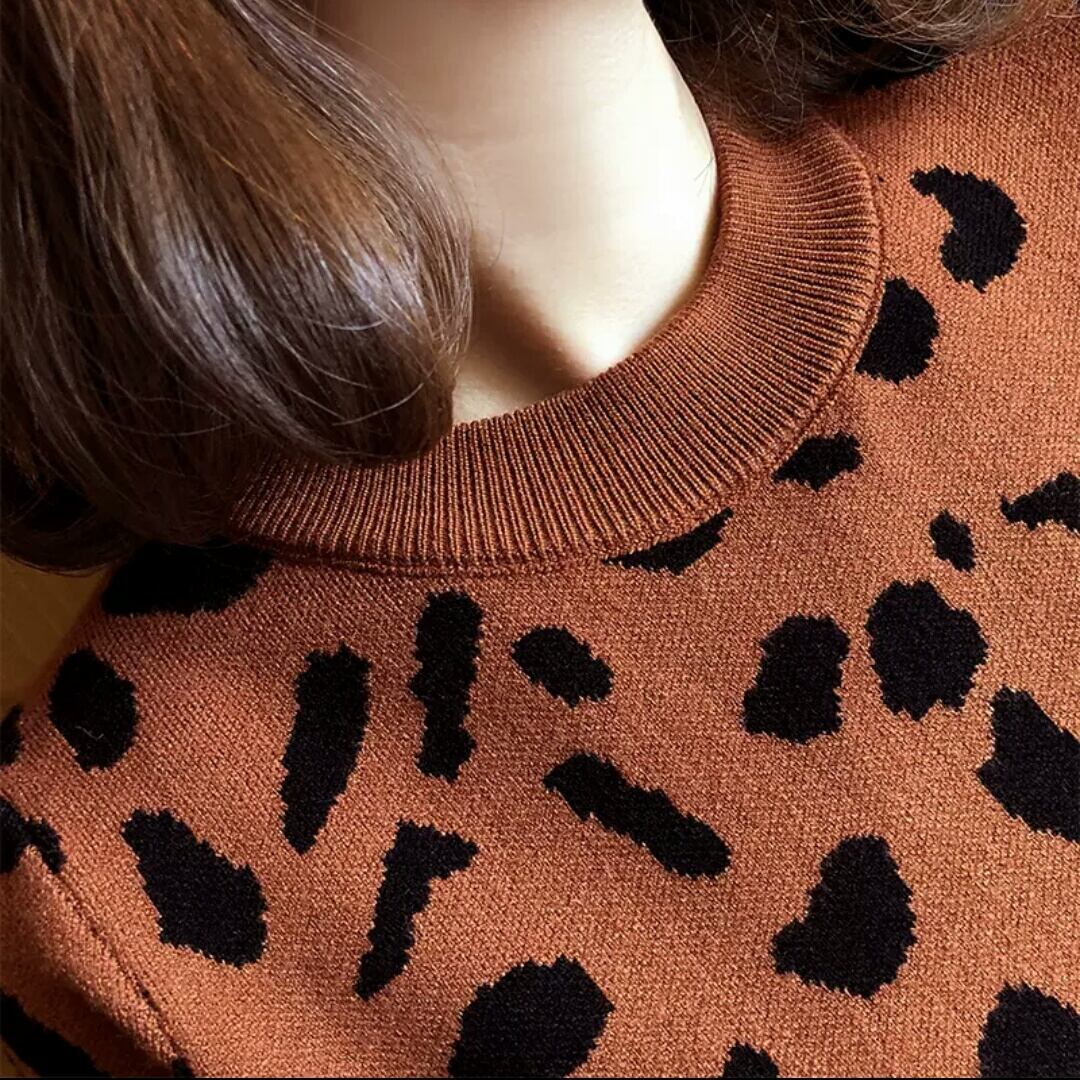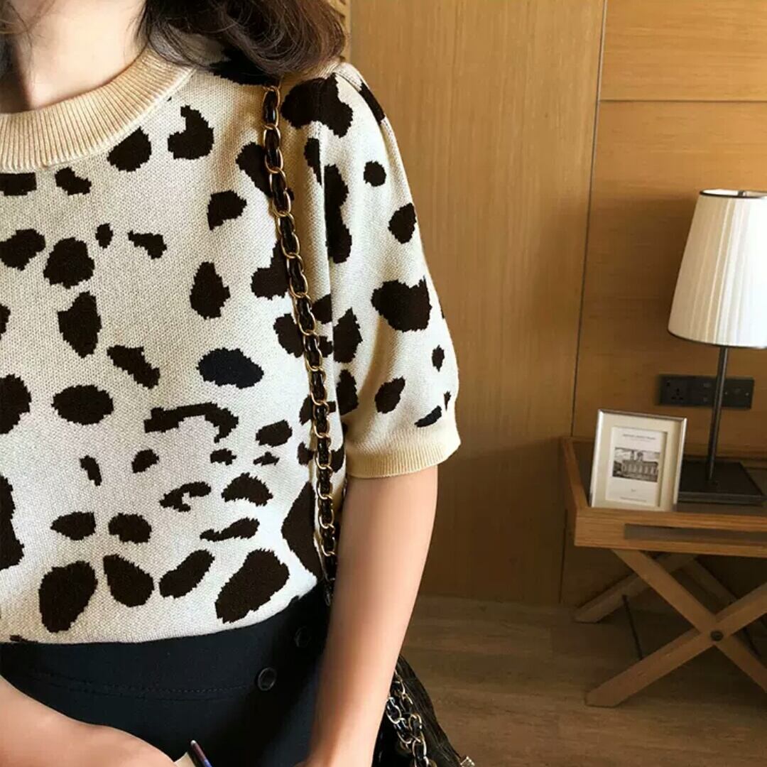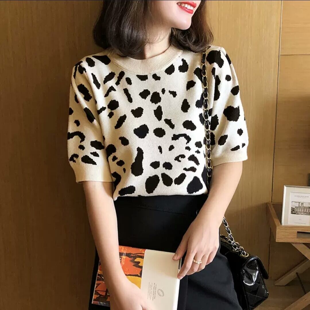 全2色 レオパード柄 ヒョウ柄 半袖 ニット セーター プルオーバー ラウンドネック 大人 カジュアル キレイめ 可愛い お出かけ お買い物 デート 女子会 春 秋 通学 学生 通勤 韓国ファッション