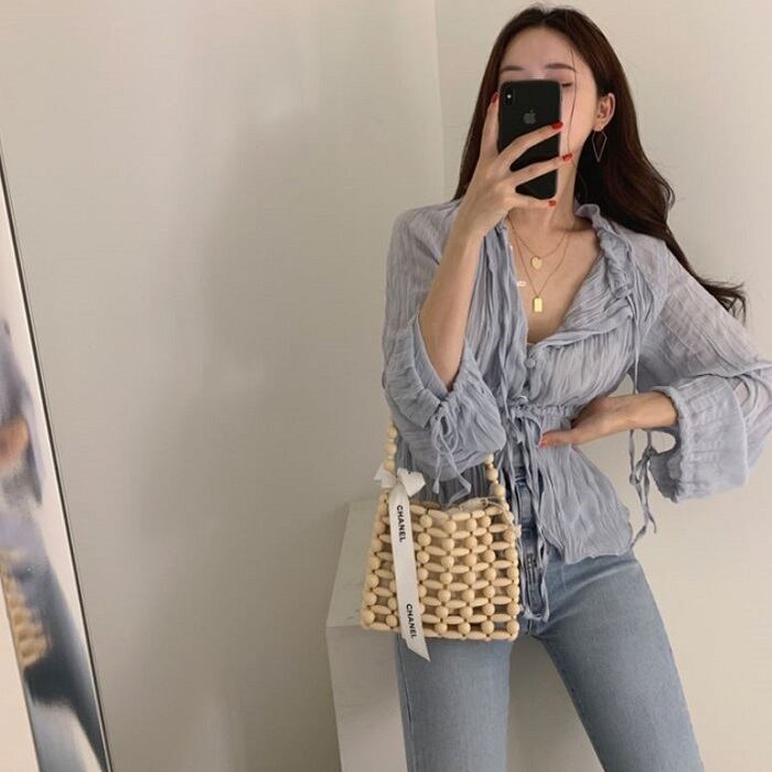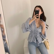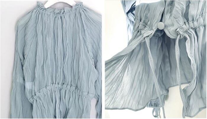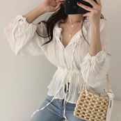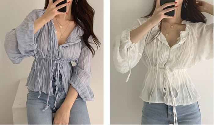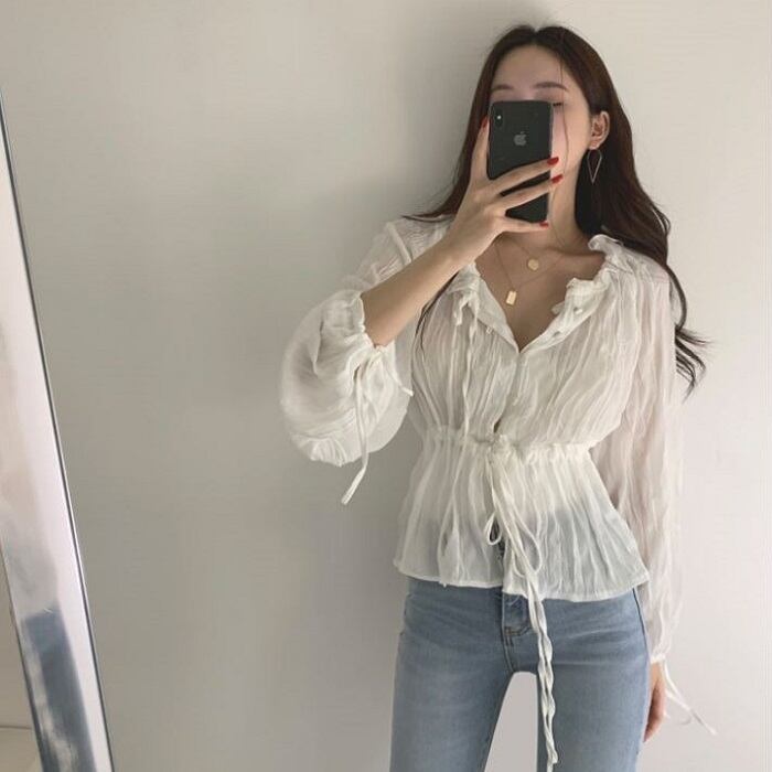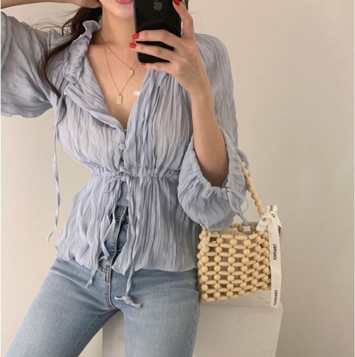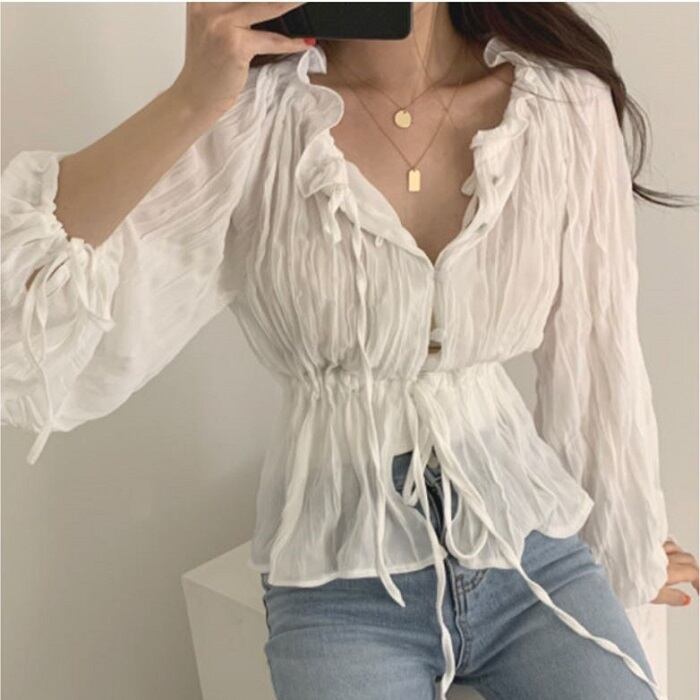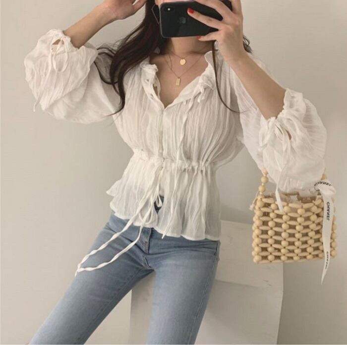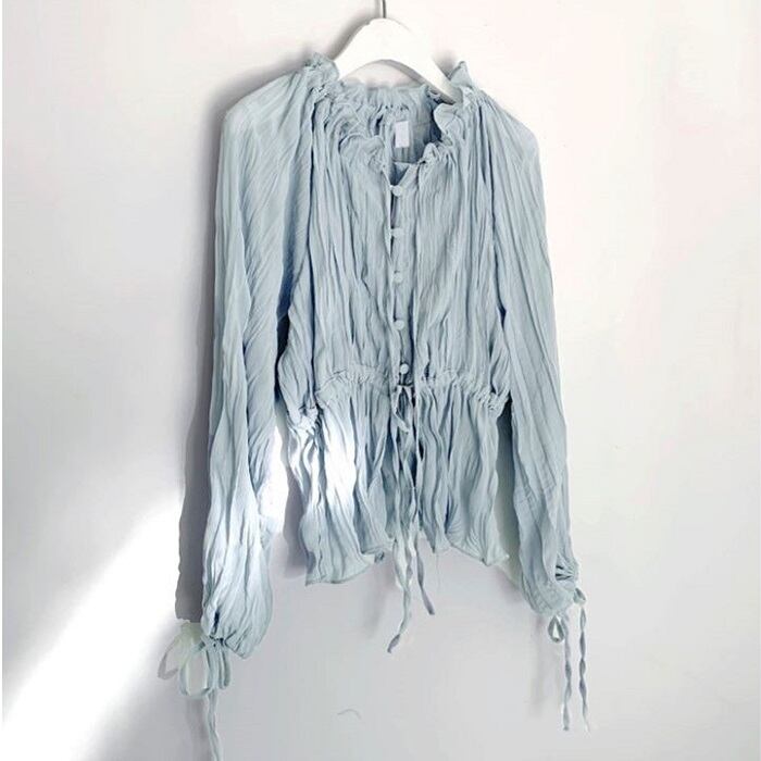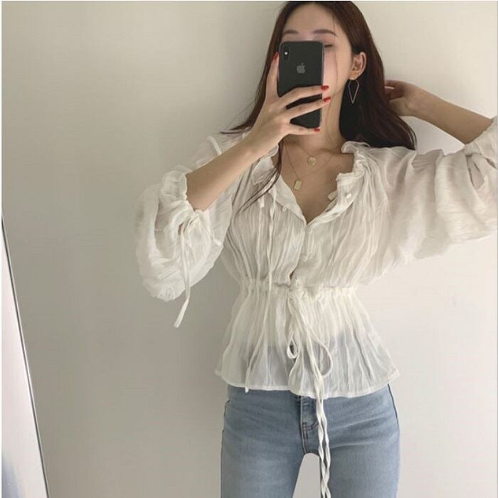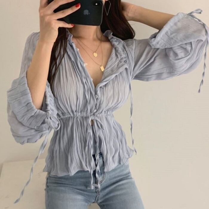 全2色 ブラウス シャツ プリーツシャツ Vネック 長袖 ウエストリボン 透け感 きれいめ カジュアル お出かけ カジュアル デイリー ブルー ホワイト