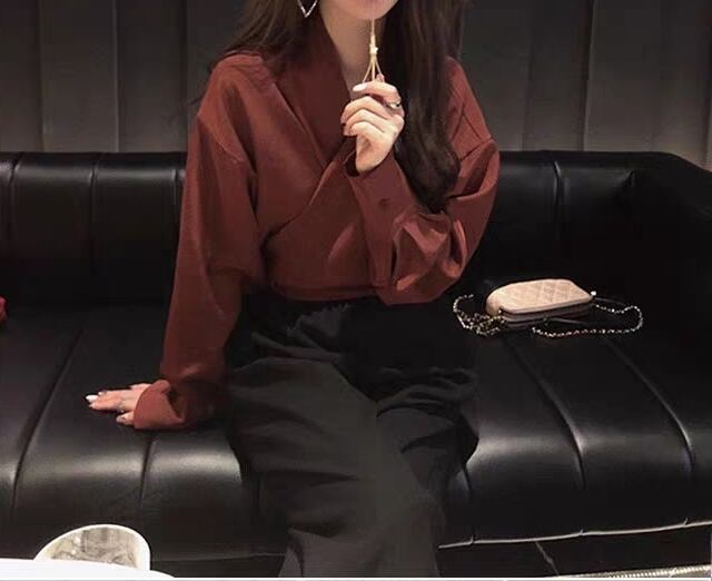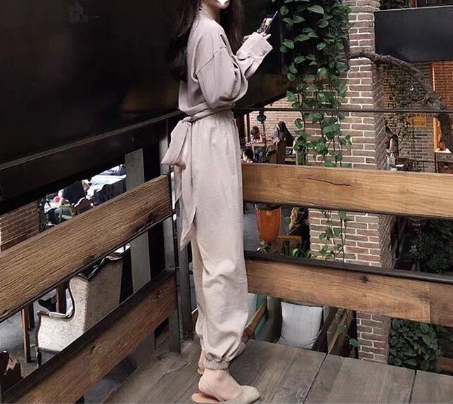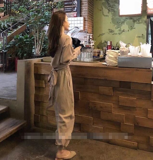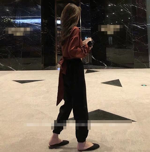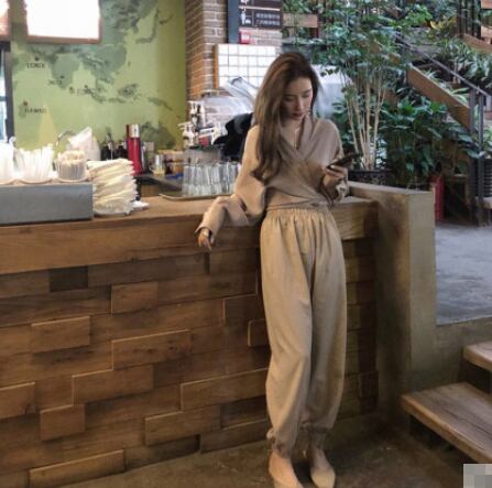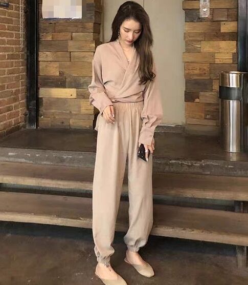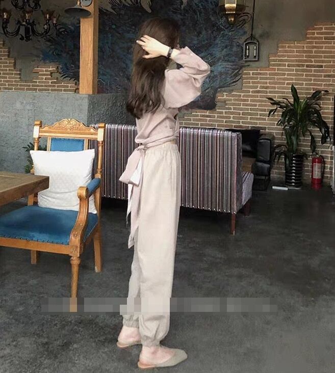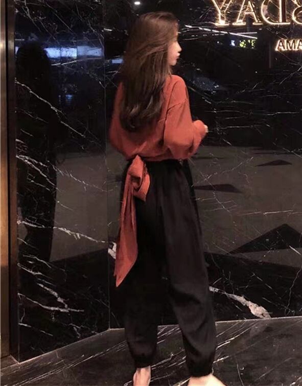 全2色 セットアップ ツーピース バックリボン 2点セット トップス ブラウス パンツ ゆったり カシュクールネック 長袖 ロングスリーブ ハイウエスト テパードパンツ バイカラー カジュアル 春 夏