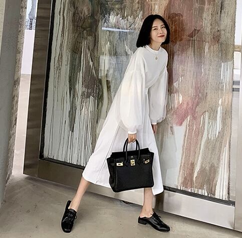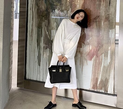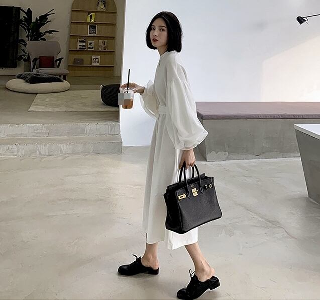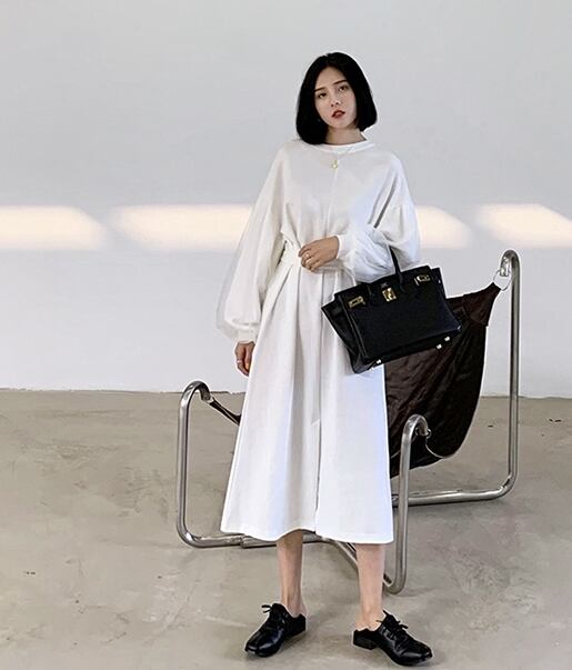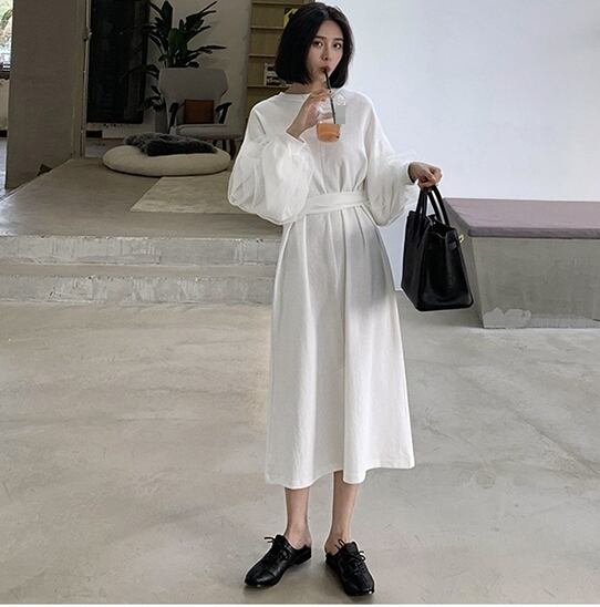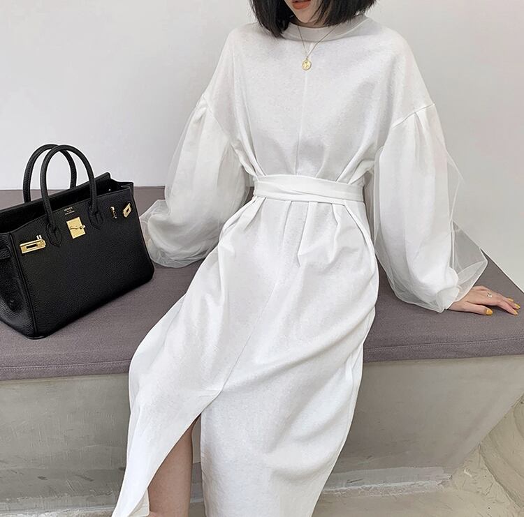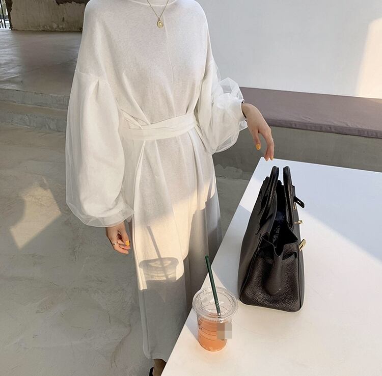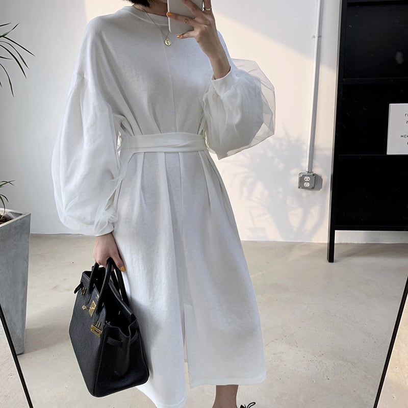 ワンピース ロング丈 ランタンスリーブ 袖コンシャス ウエストマーク フロントスリット 長袖 大人可愛い ラウンドネック 上品 大人 カジュアル デート きれいめ ゆったり レディー 春