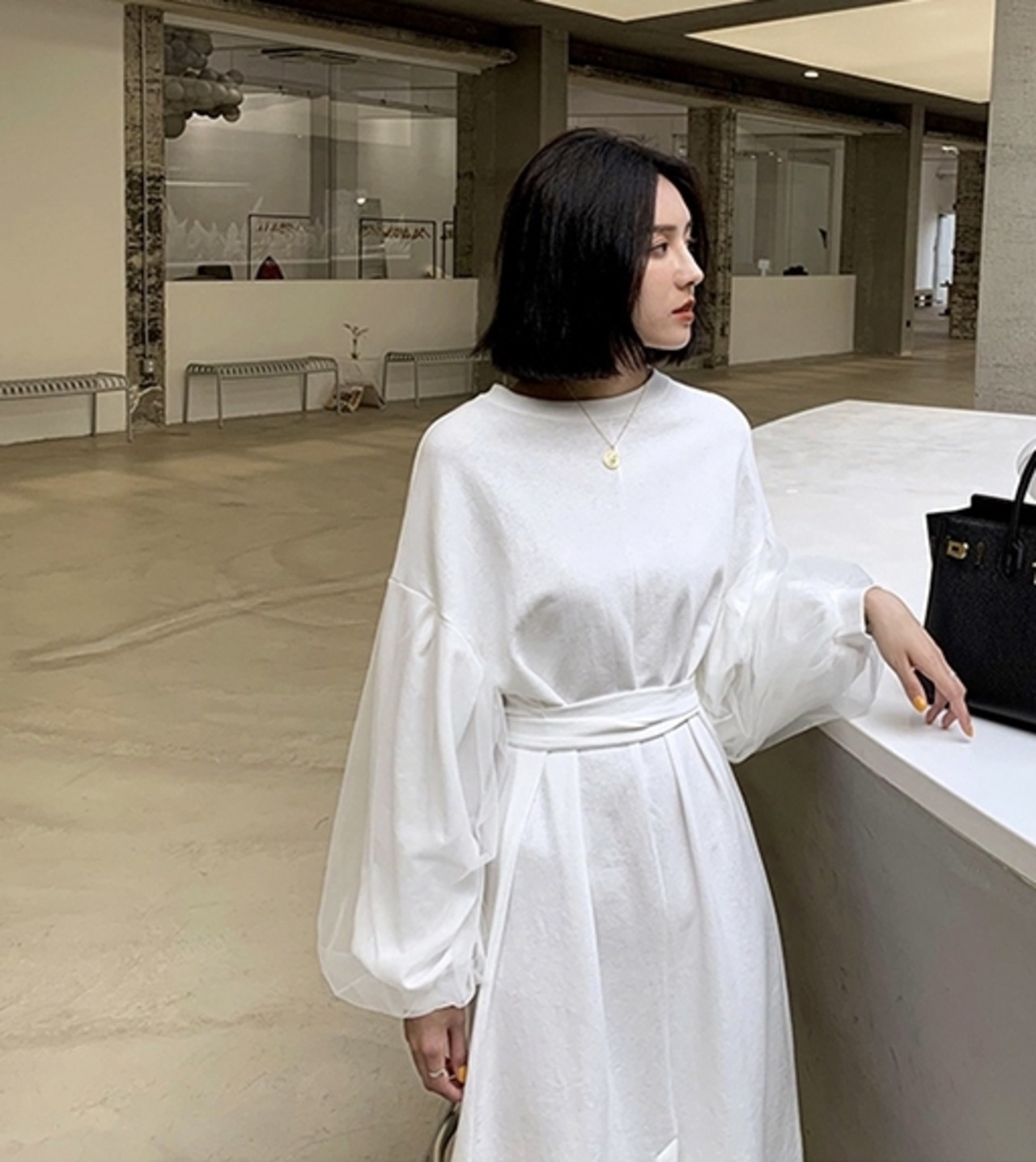 ランタンスリーブが上品で大人可愛い印象のワンピースです。