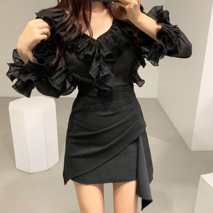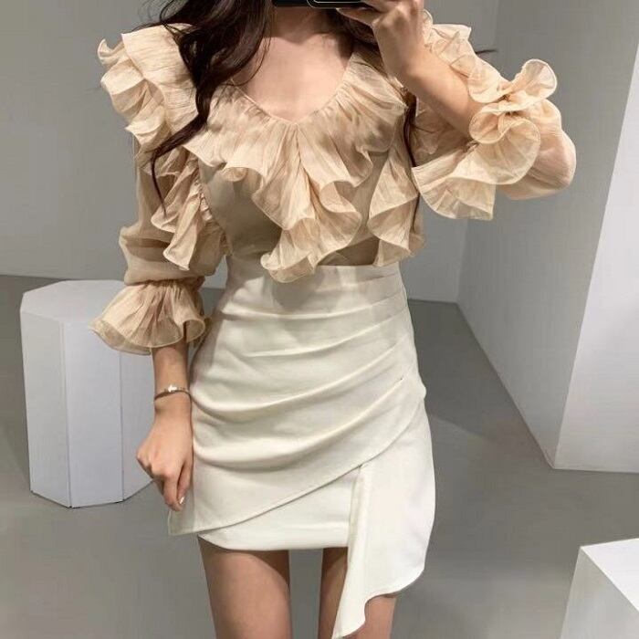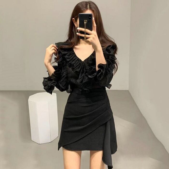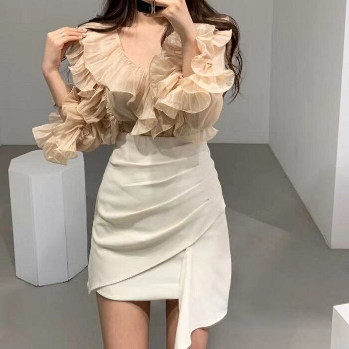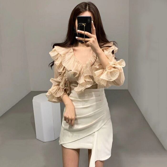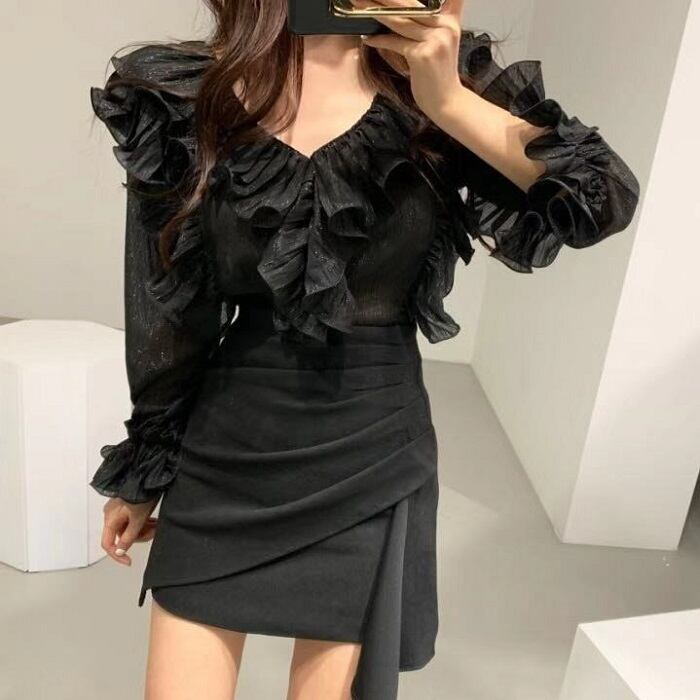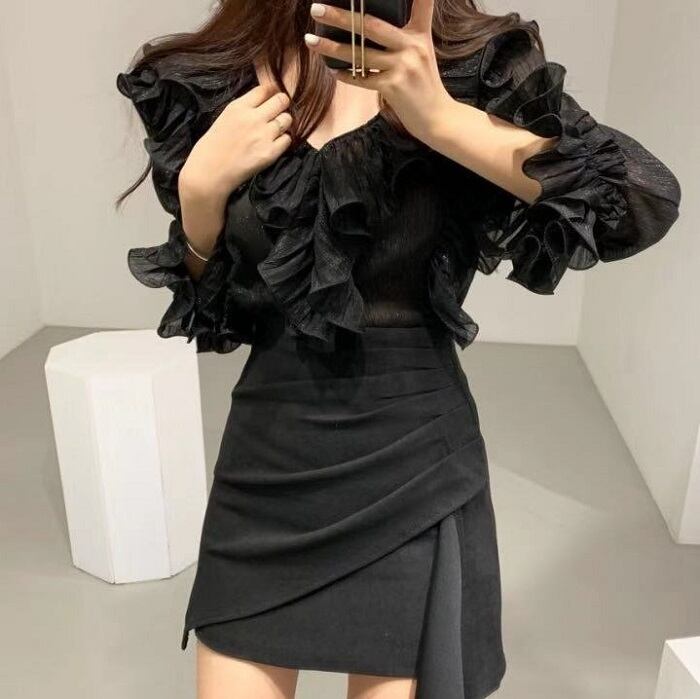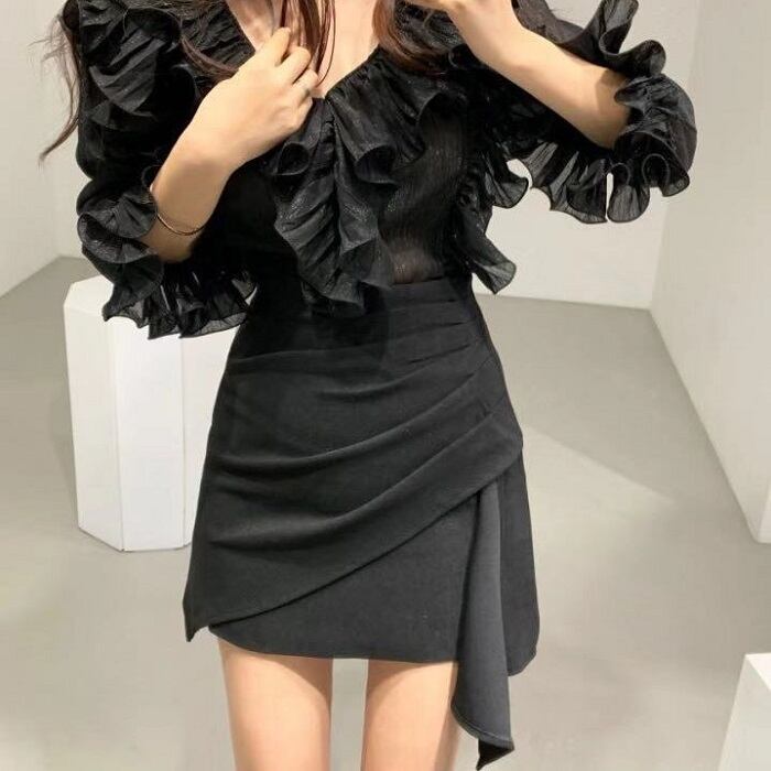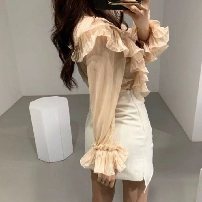 全2色 ブラウス フリル ボリューム袖 Vネック ミニスカート プリーツ ハイウエスト きれいめ フェミニン カジュアル パーティ アプリコット ブラック