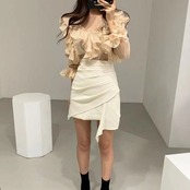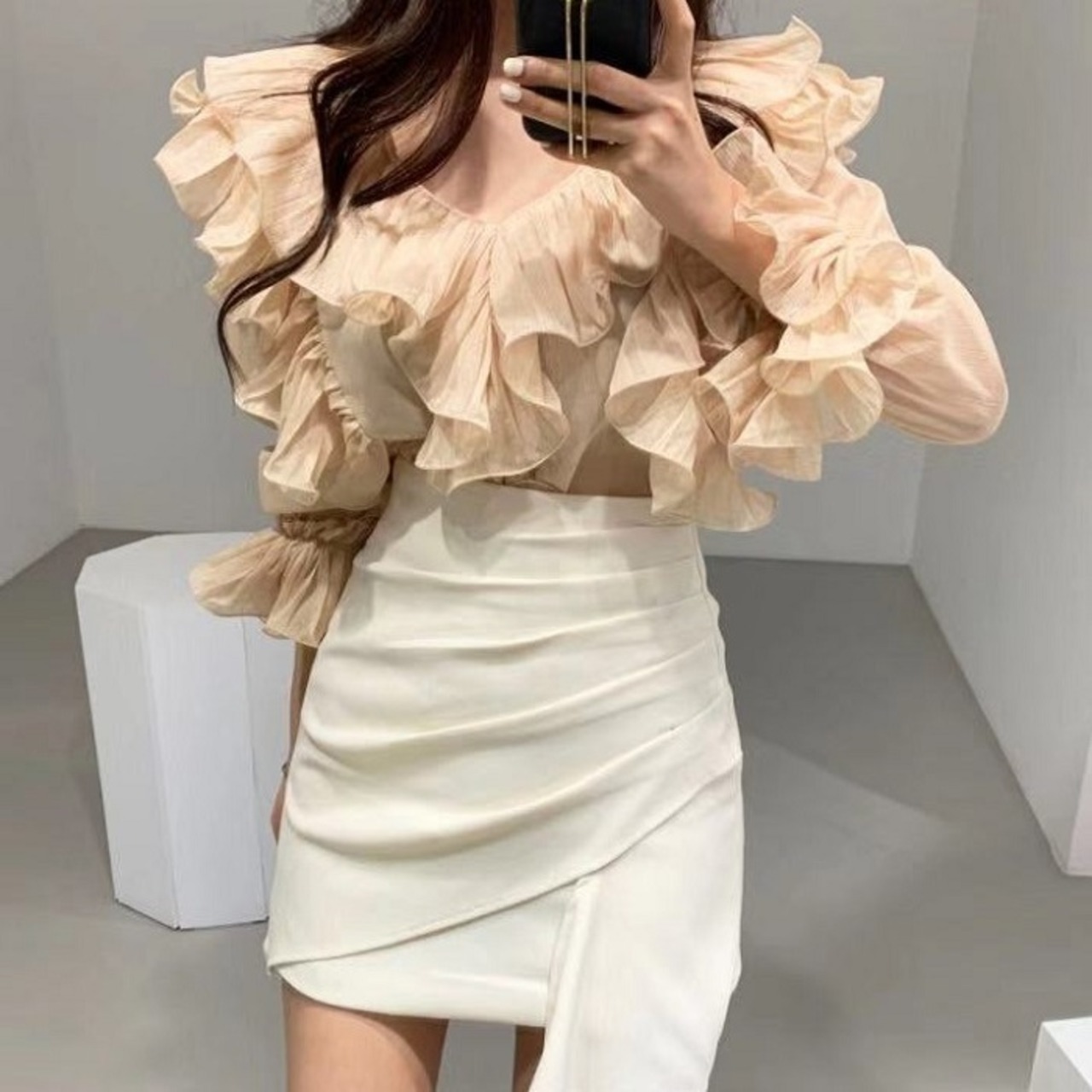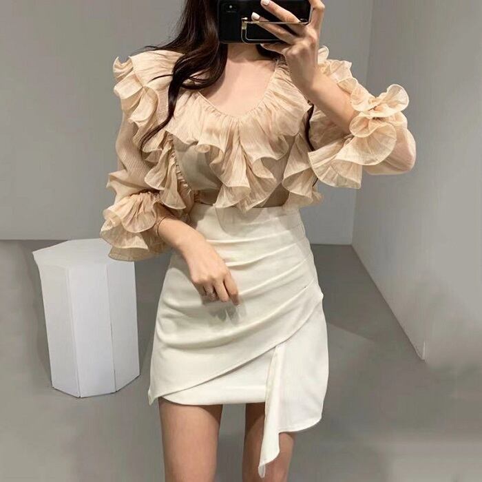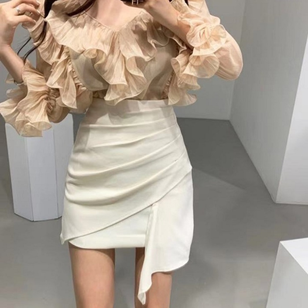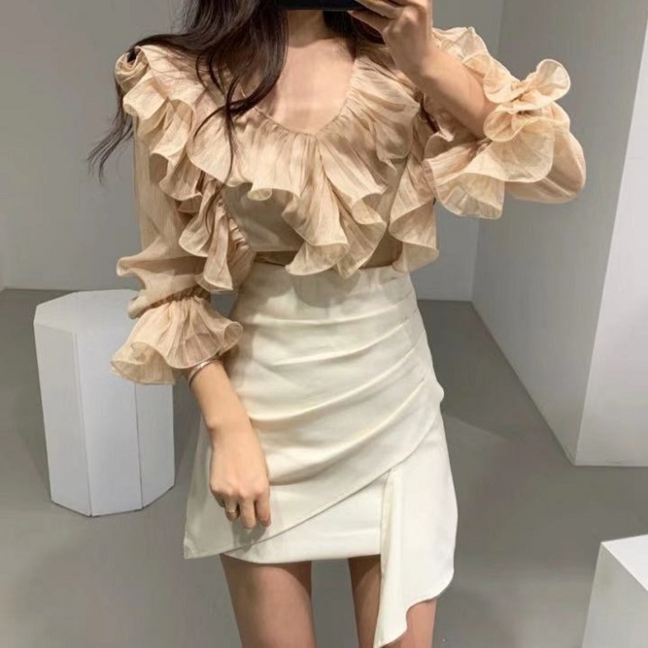 全2色 ブラウス フリル ボリューム袖 Vネック ミニスカート プリーツ ハイウエスト きれいめ フェミニン カジュアル パーティ アプリコット ブラック
