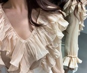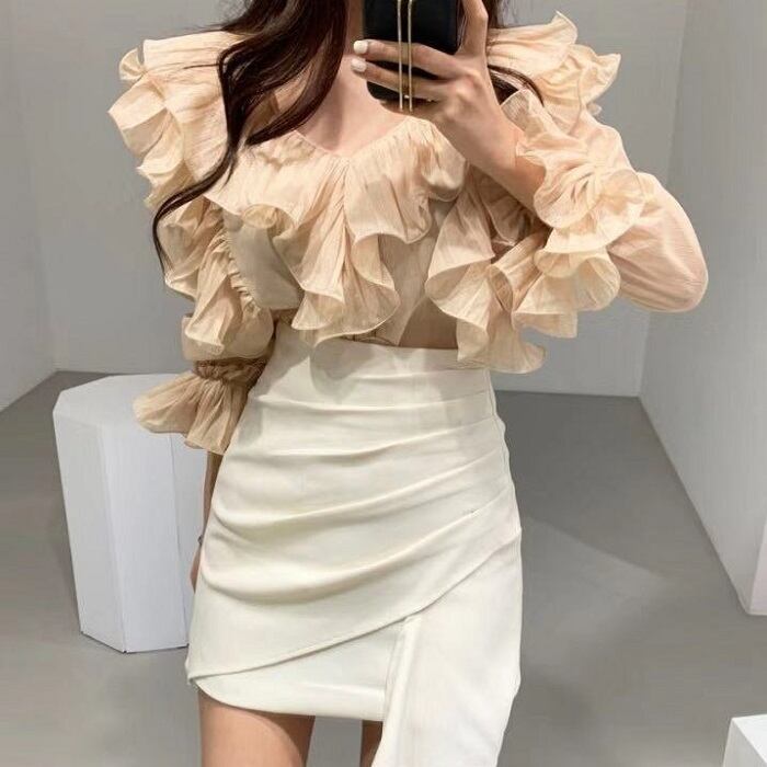大きめに開いたVネックにボリュームのあるフリルがエレガントなブラウス。