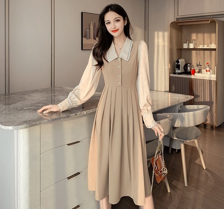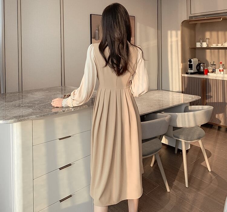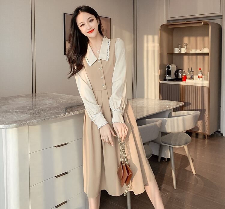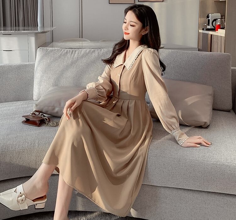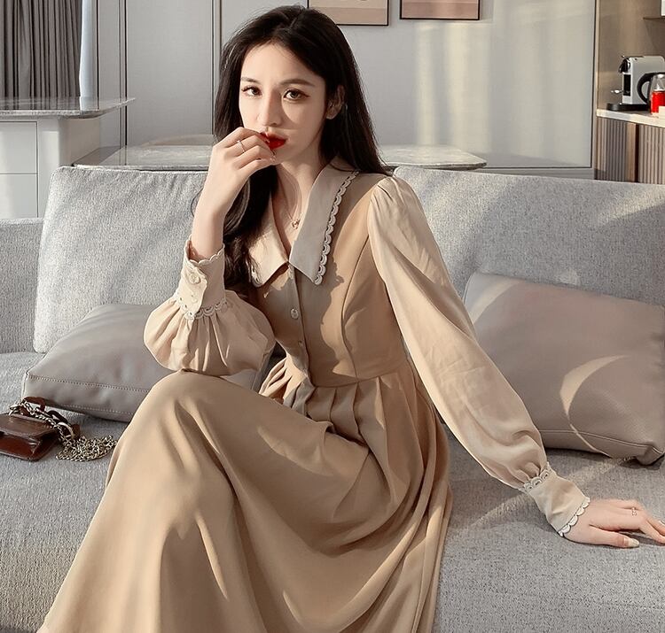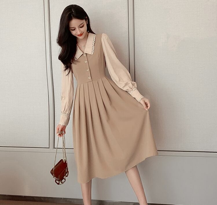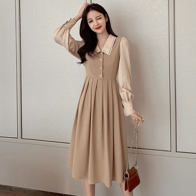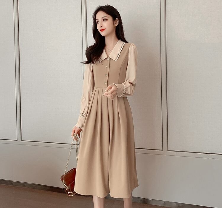 ワンピース ミモレ丈 長袖 パフスリーブ フロントボタン フレア バイカラー トレンチ レトロ カジュアル きれいめ 上品 大人可愛い 韓国ファッション Vネック 春 夏