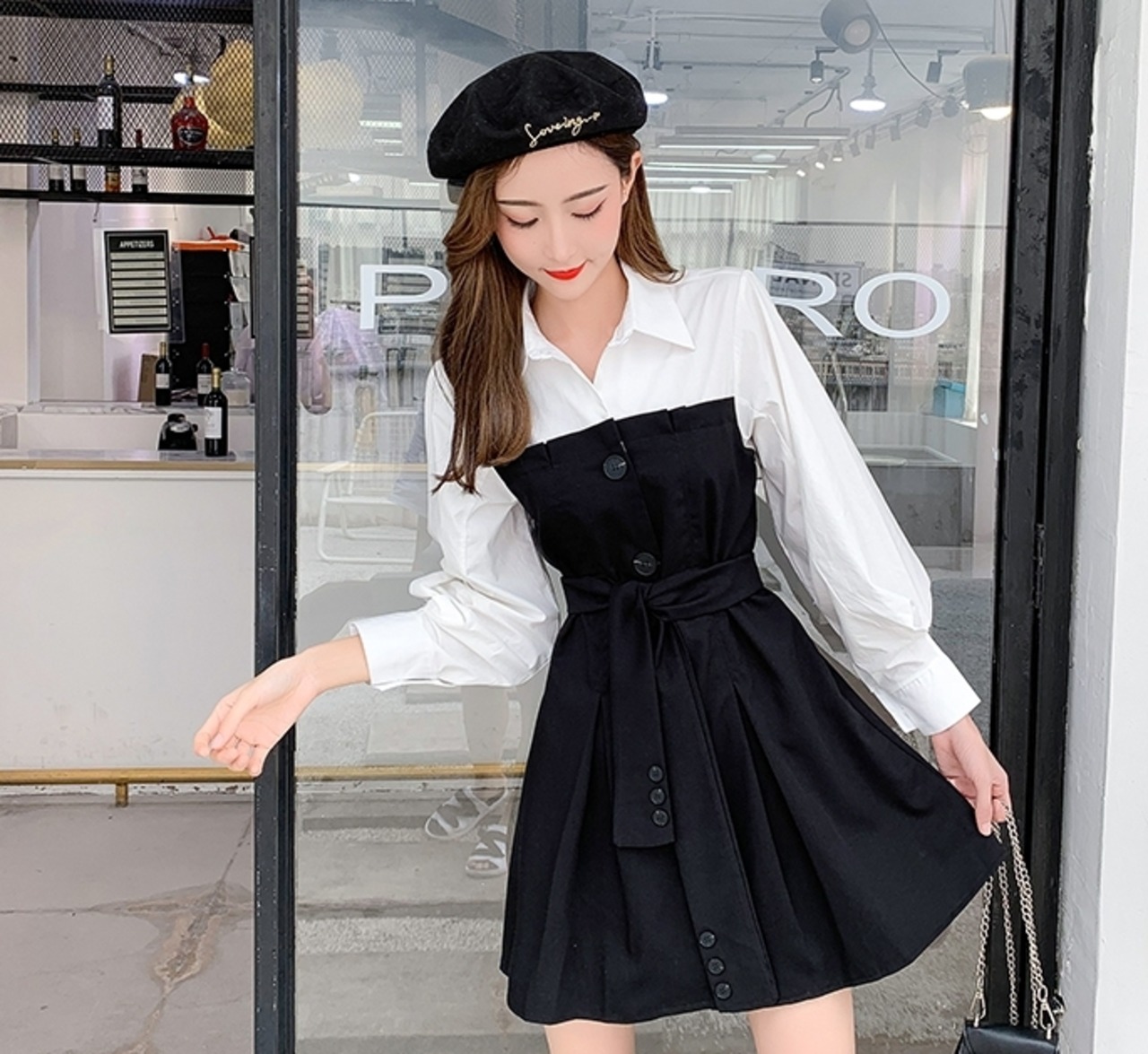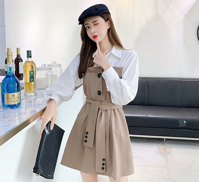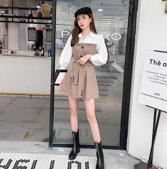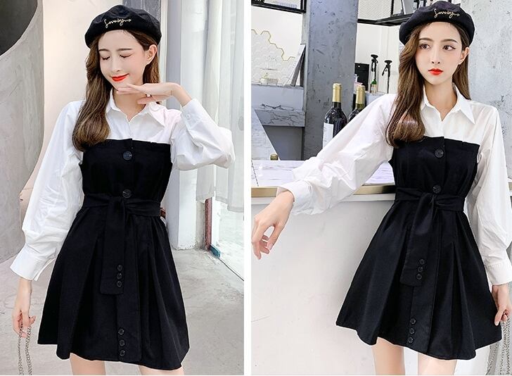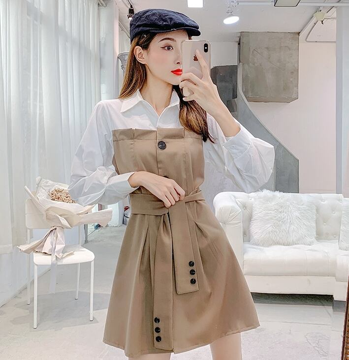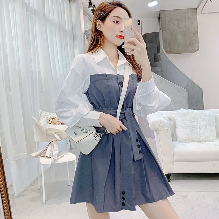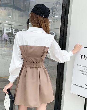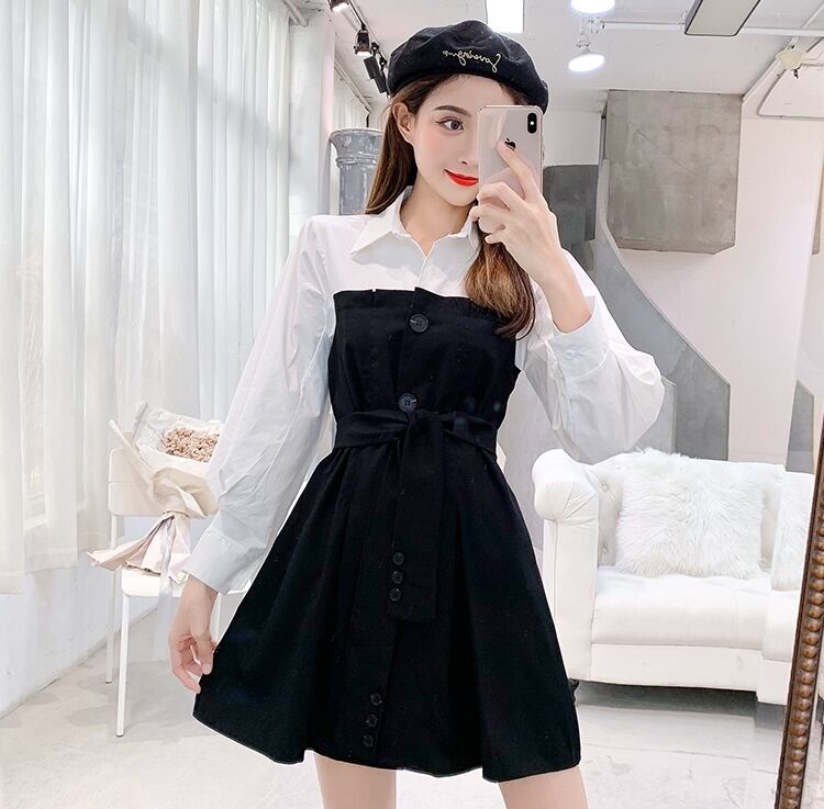全3色 ワンピース フロントボタン フェイクツーピース レイヤード風 ウエストリボン パフスリーブ フレア ミニ丈 長袖 バイカラー カジュアル きれいめ ユニーク 春 夏