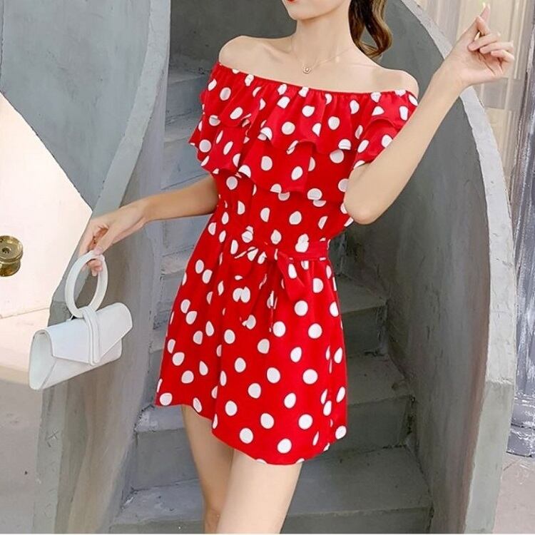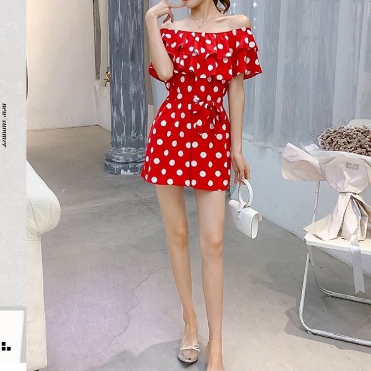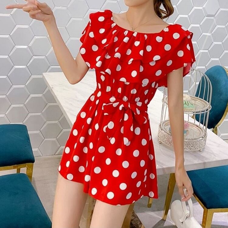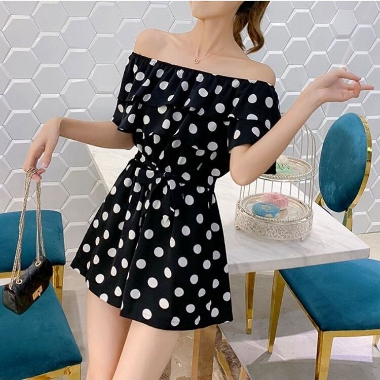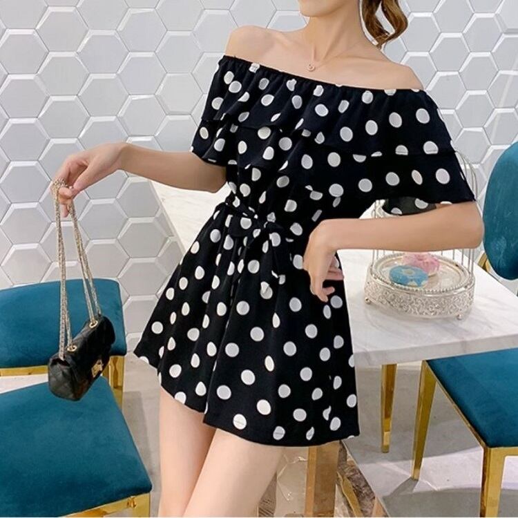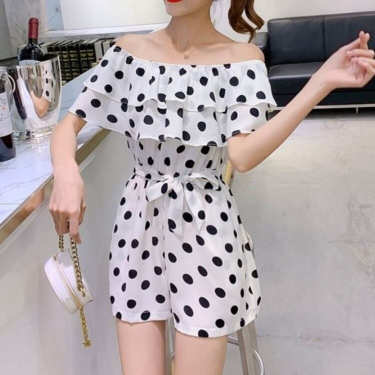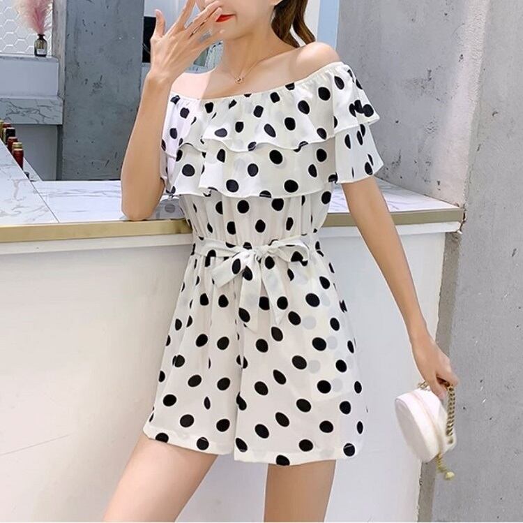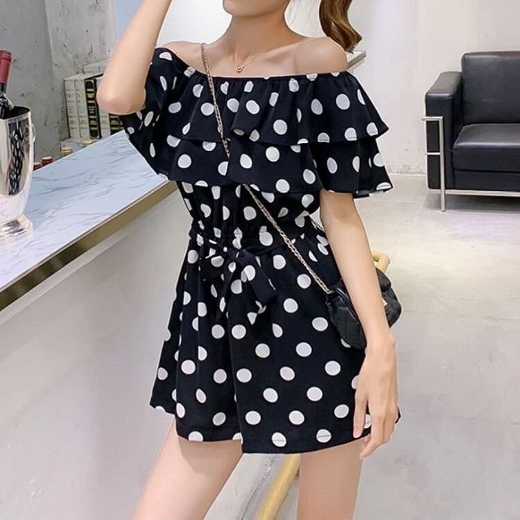 全3色 オールインワン ジャンプスーツ ショートパンツ ミニ丈 ドット柄 ラウンドネック オフショルダー フリル 半袖 ウエストリボン きれいめ カジュアル フェミニン お出かけ デート