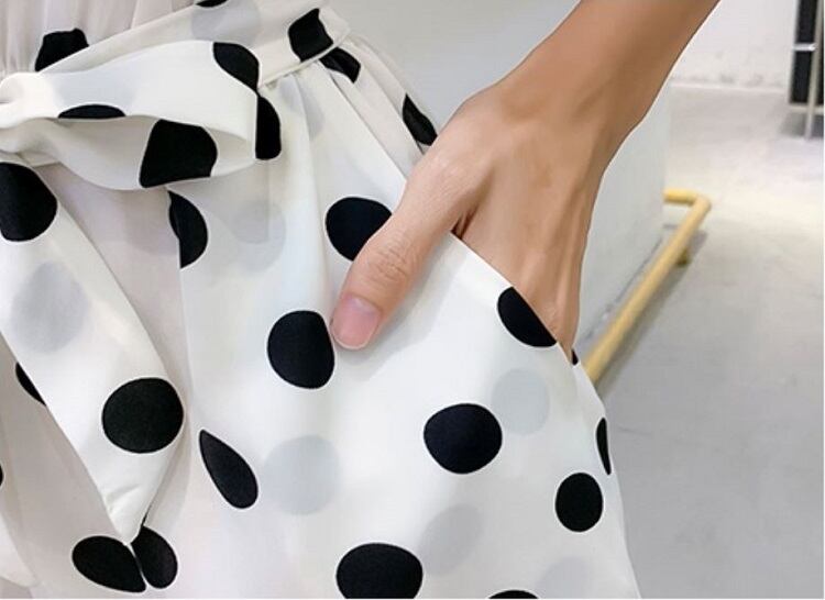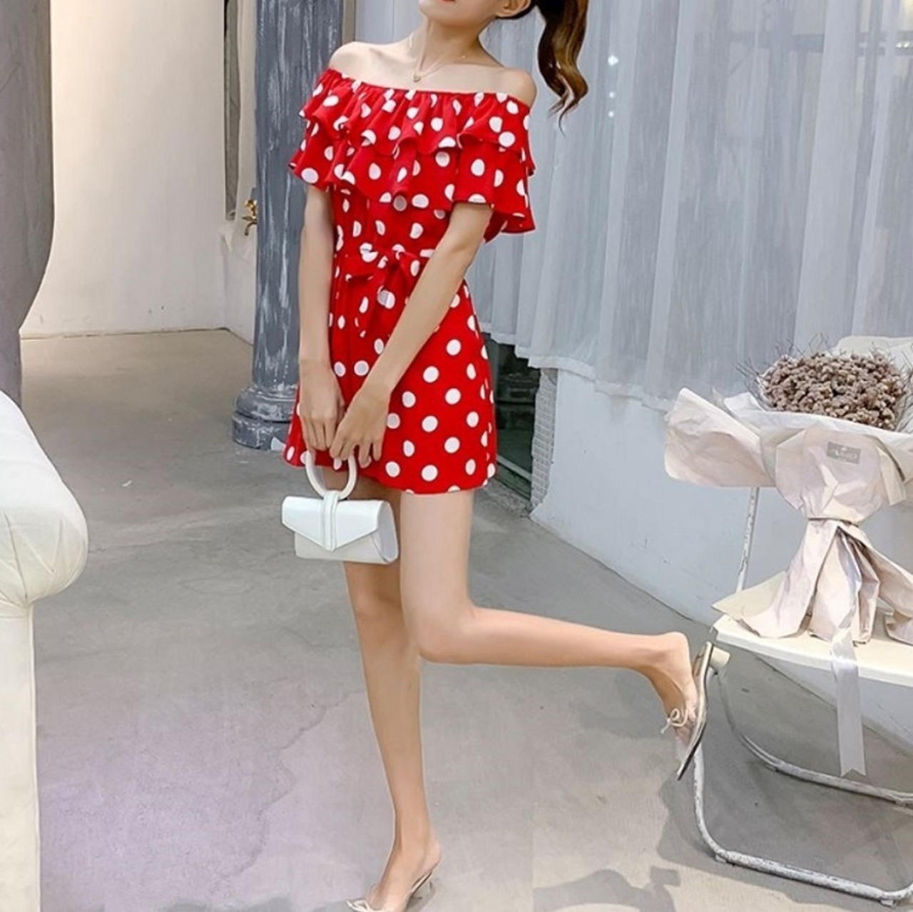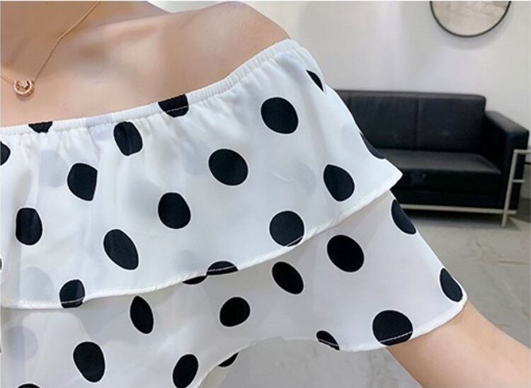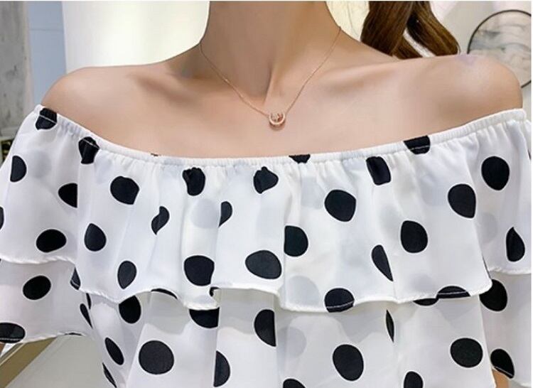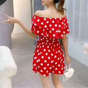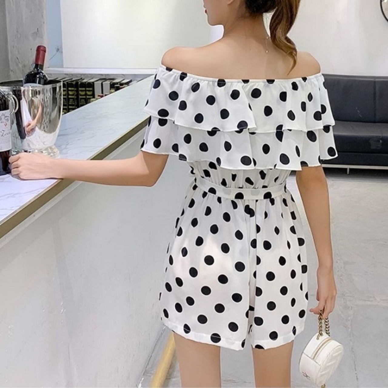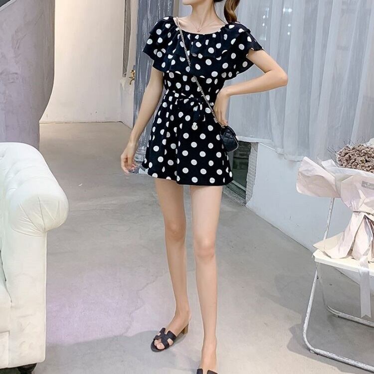 全3色 オールインワン ジャンプスーツ ショートパンツ ミニ丈 ドット柄 ラウンドネック オフショルダー フリル 半袖 ウエストリボン きれいめ カジュアル フェミニン お出かけ デート