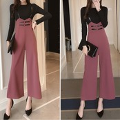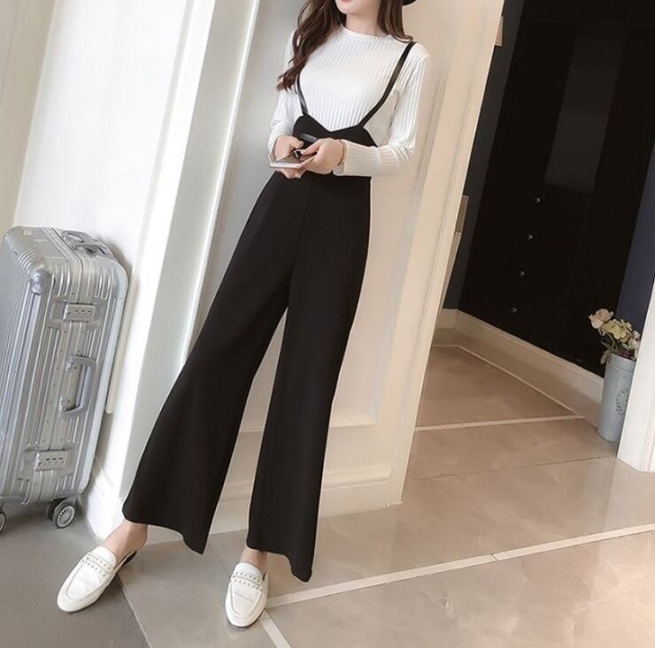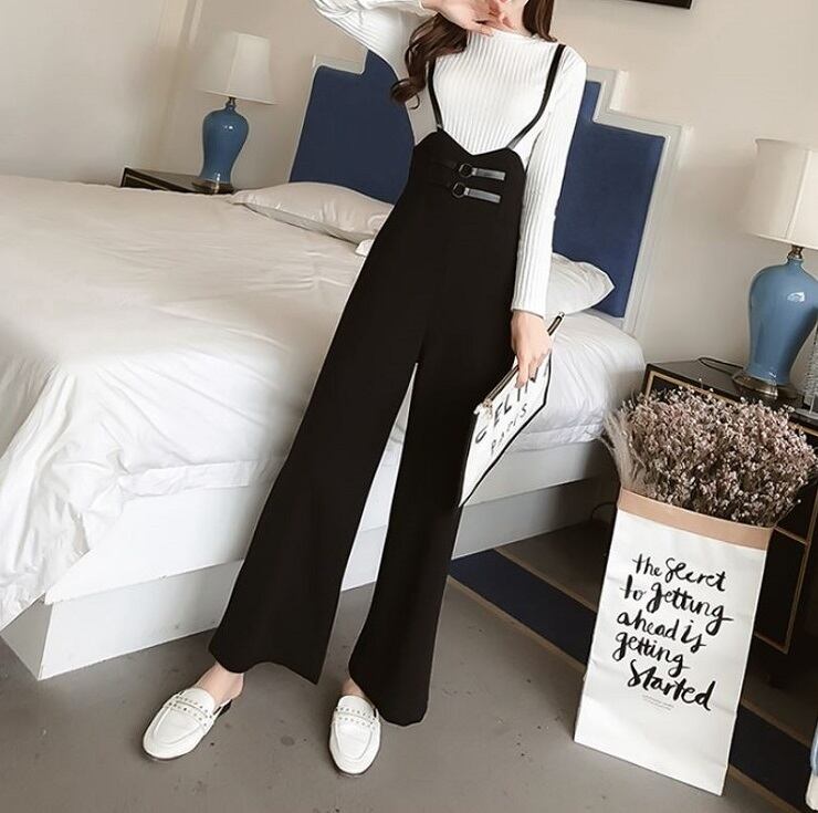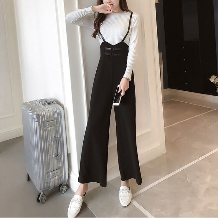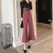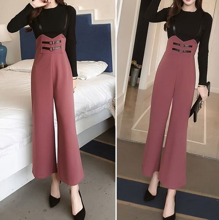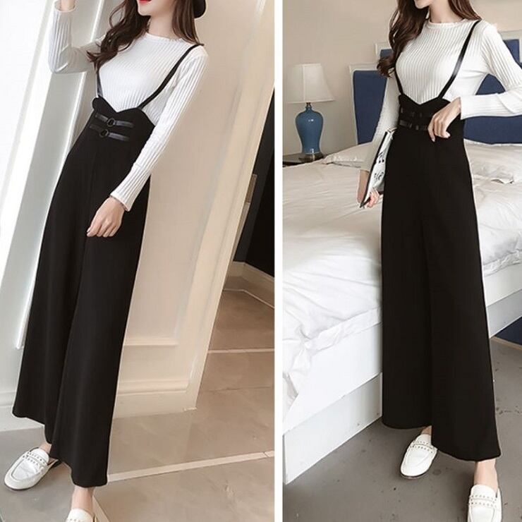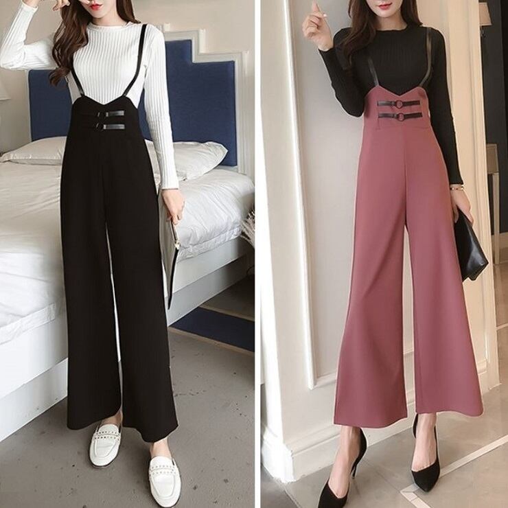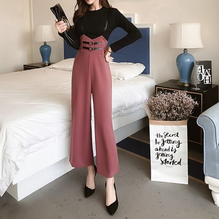 全2色 ワイドパンツ 9分丈 アンクル丈 ストラップ サスペンダー ハイウエスト スリム きれいめ 無地 カジュアル お出かけ デート ブラック ピンク