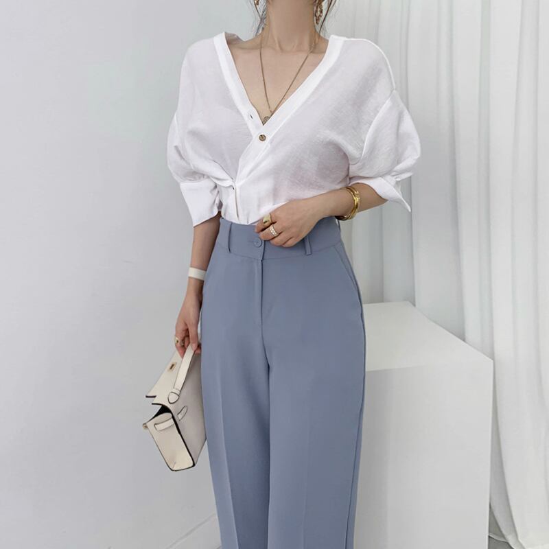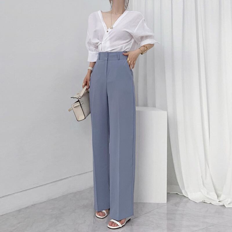 全2色 ワイドパンツ スラックス ハイウエスト 無地 ゆったり きれいめ オフィス お出かけ デート ブルー ブラック