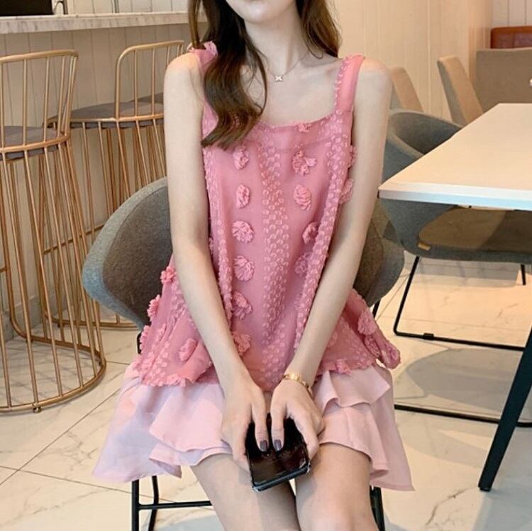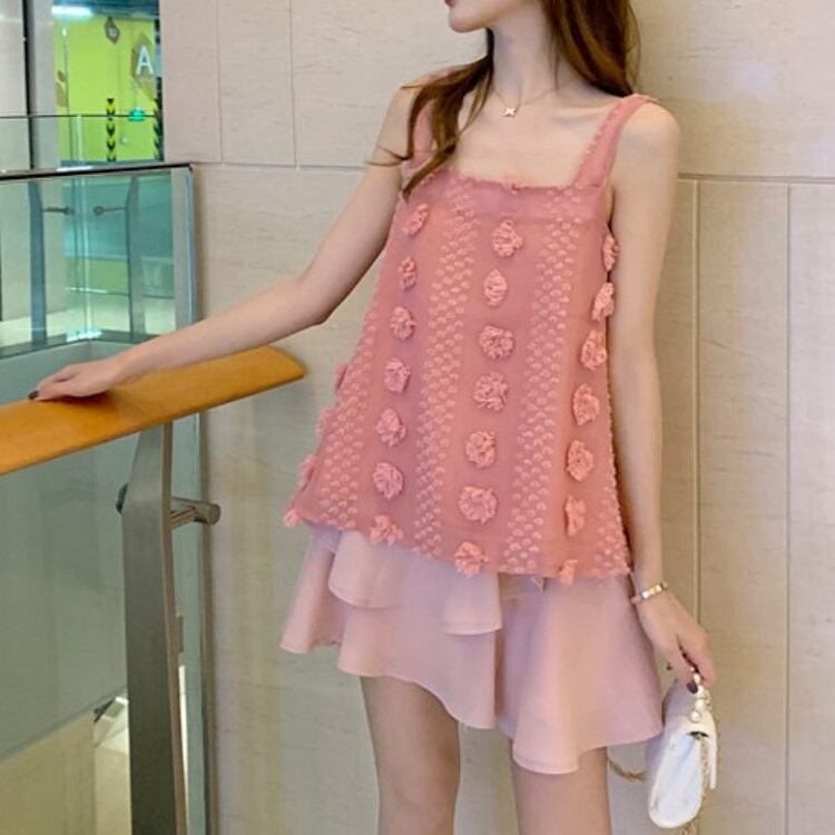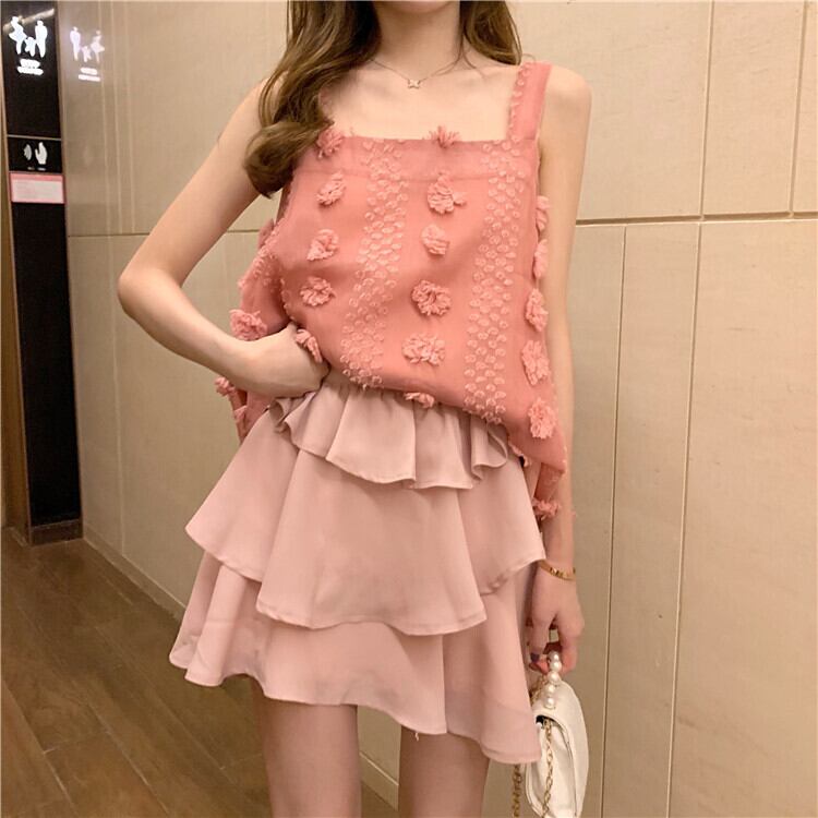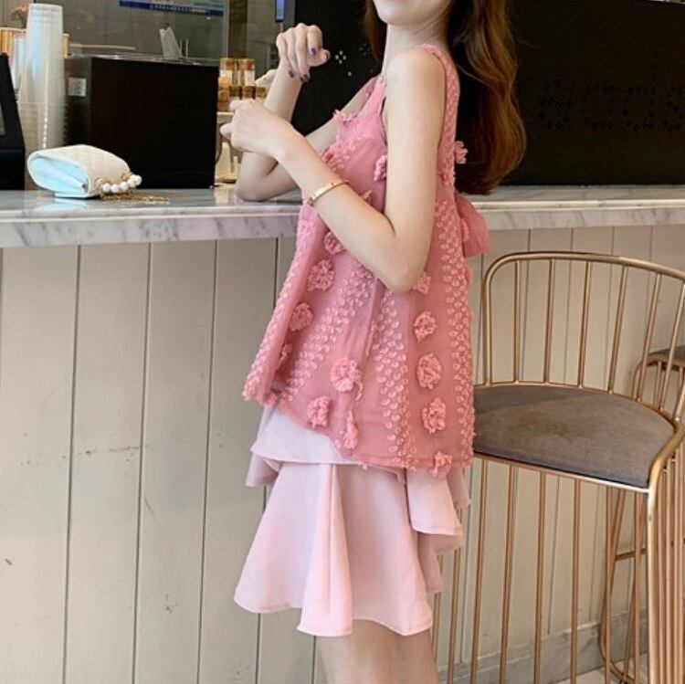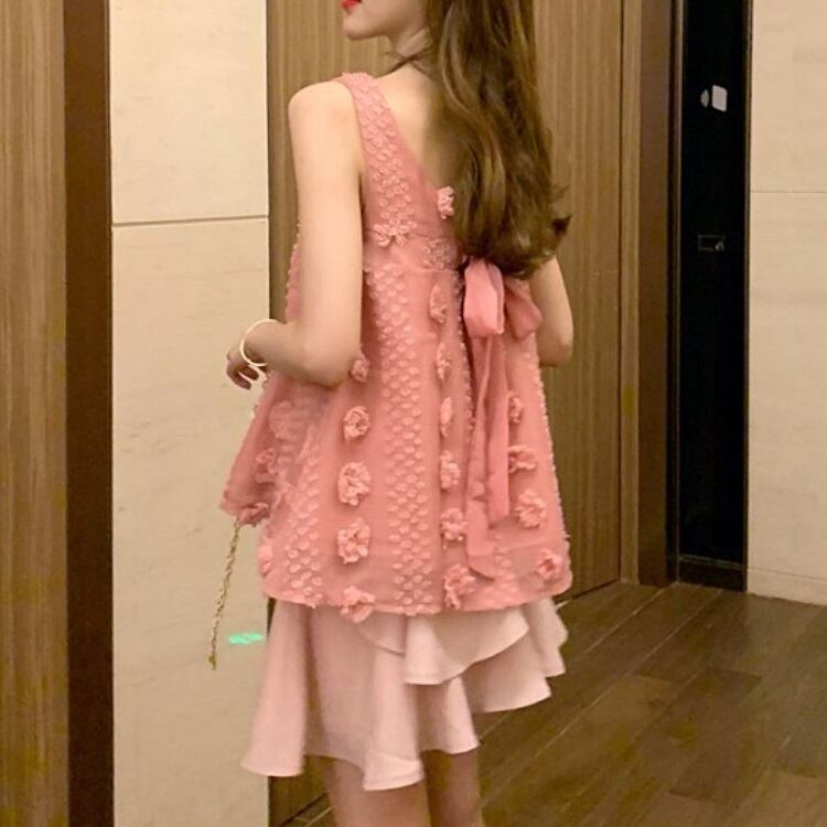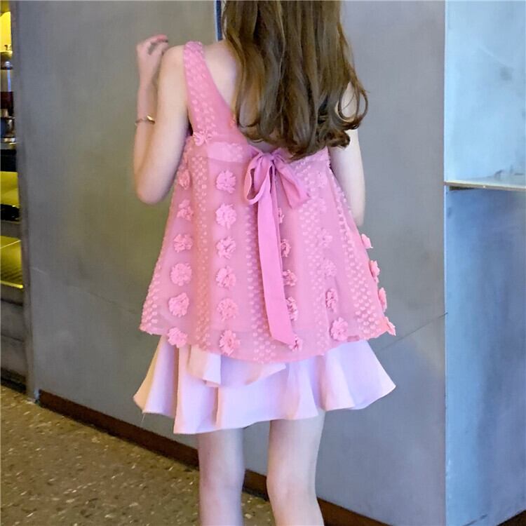 セットアップ ツーピース タンクトップ チュニック スクエアネック リボン シフォンスカート ミニ丈 フェミニン お出かけ カジュアル 夏 ピンク