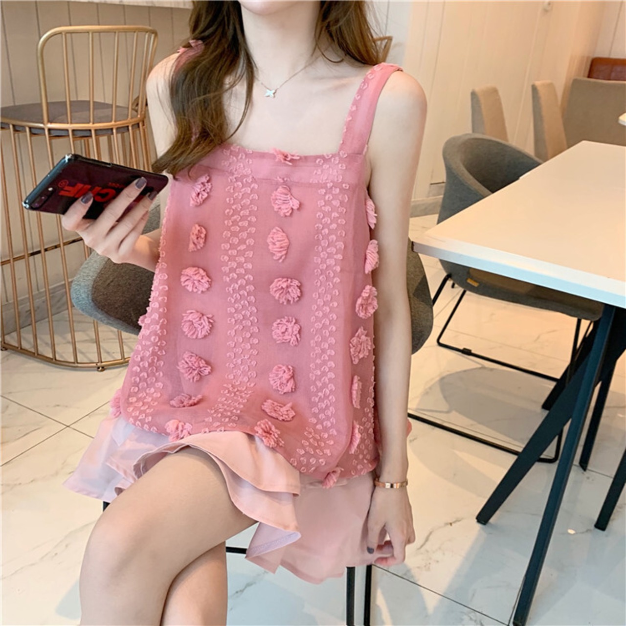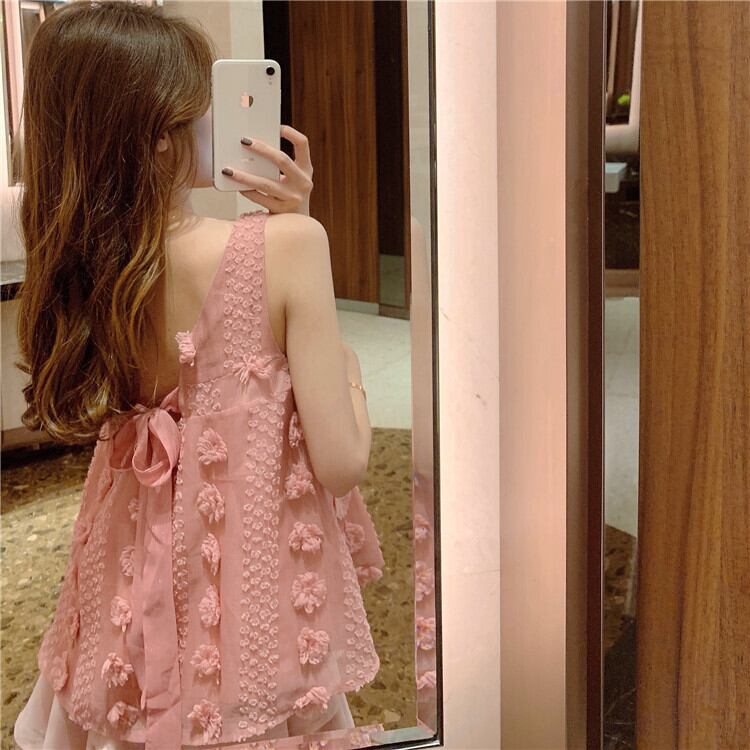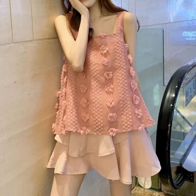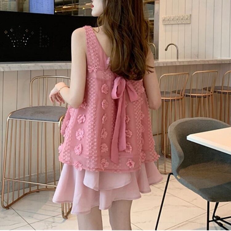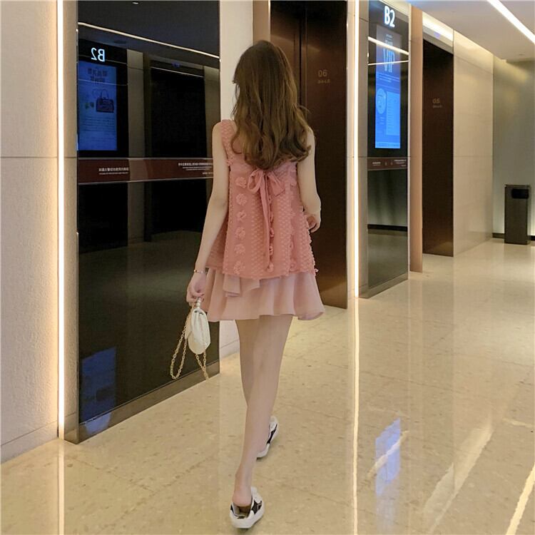 セットアップ ツーピース タンクトップ チュニック スクエアネック リボン シフォンスカート ミニ丈 フェミニン お出かけ カジュアル 夏 ピンク