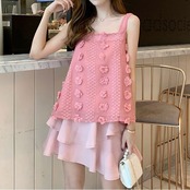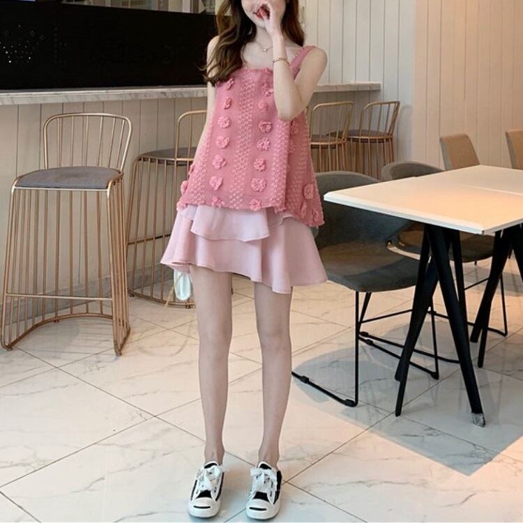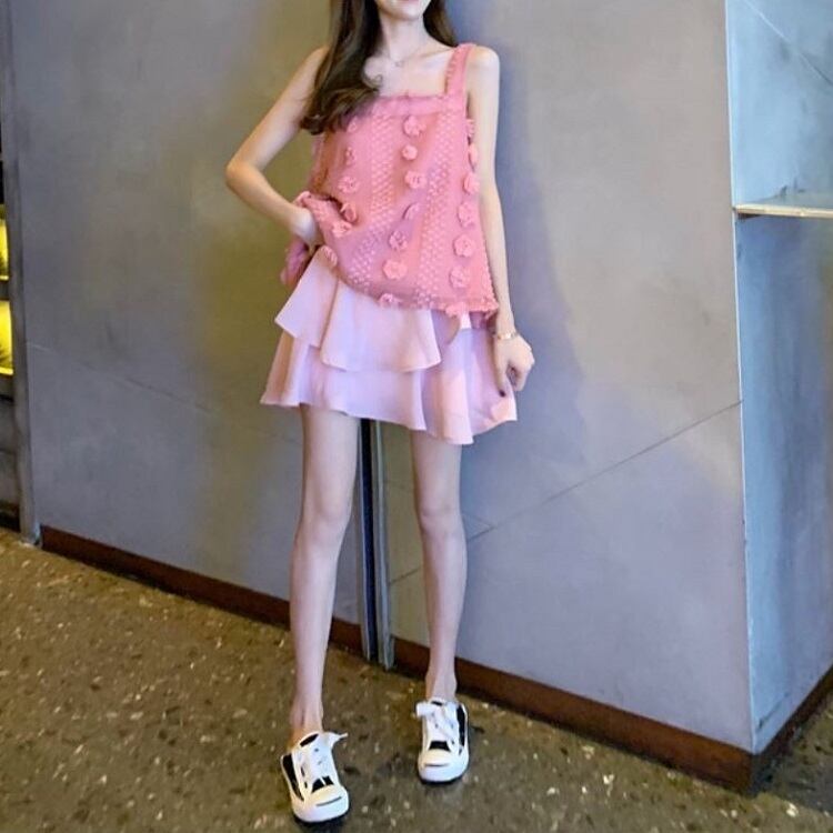 チュニック丈のタンクトップとシフォンミニスカートの上下セット。