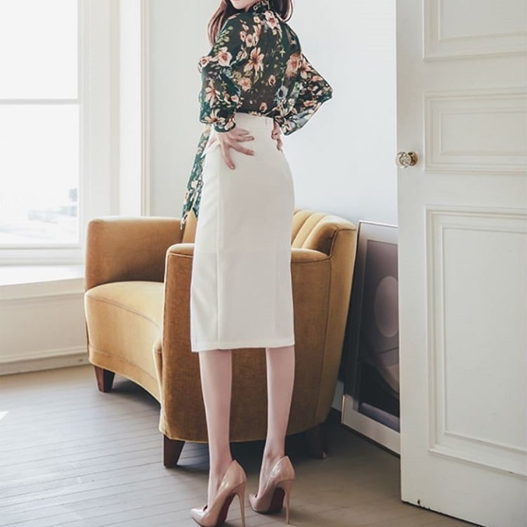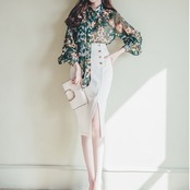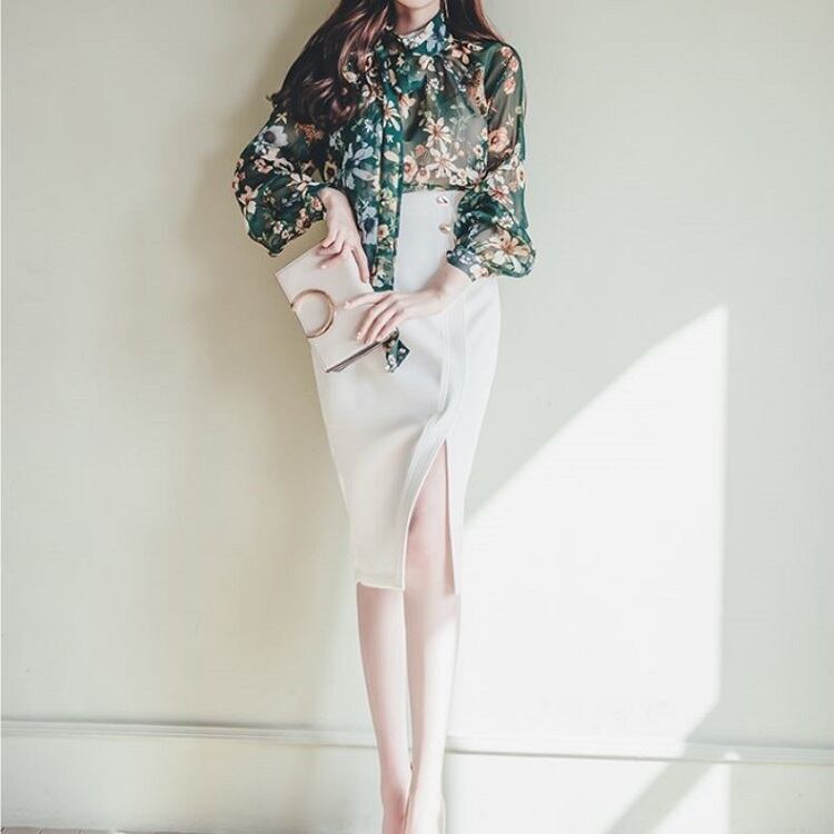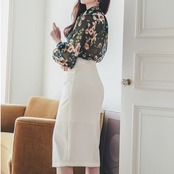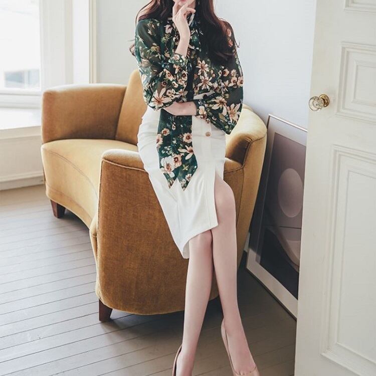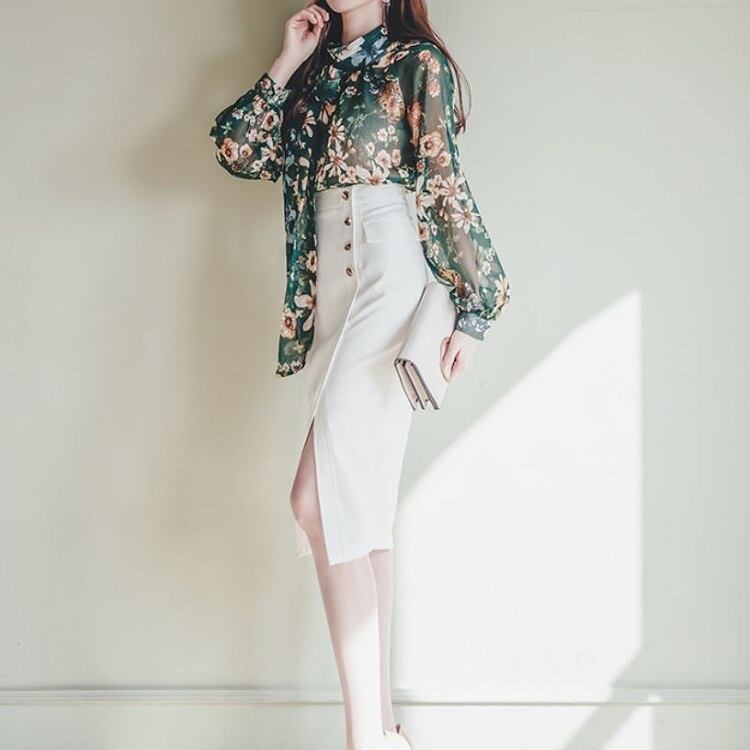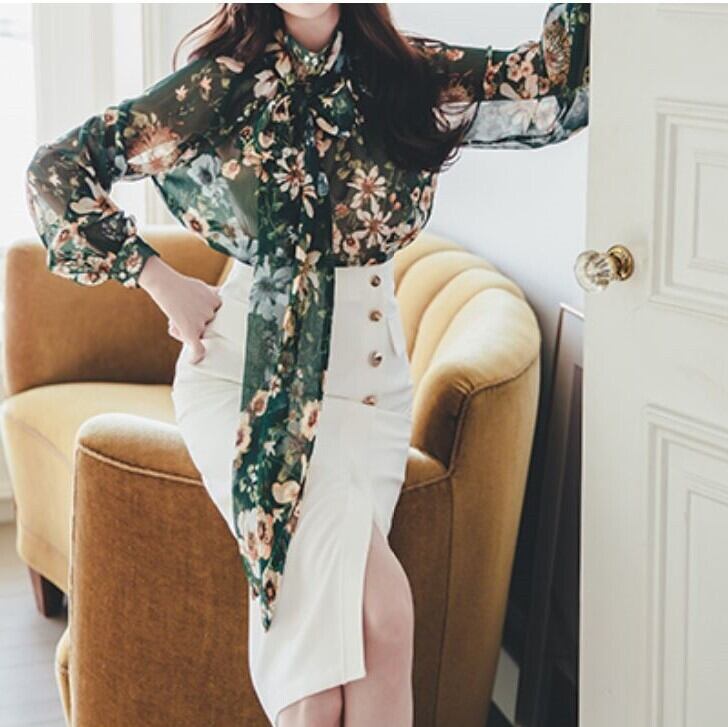 透け感のあるシフォンがエレガントな印象の花柄ブラウス。
