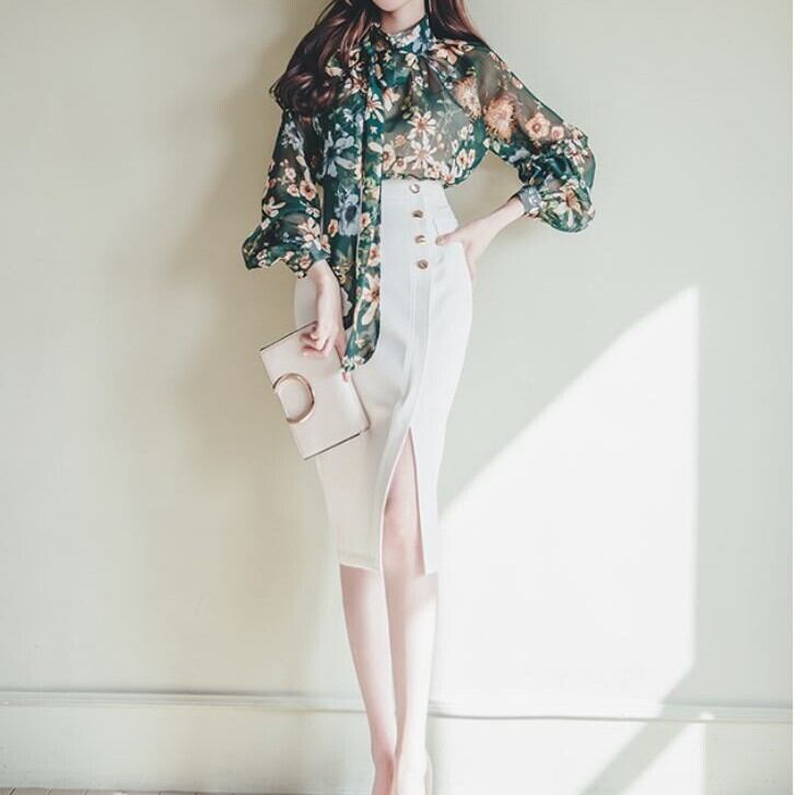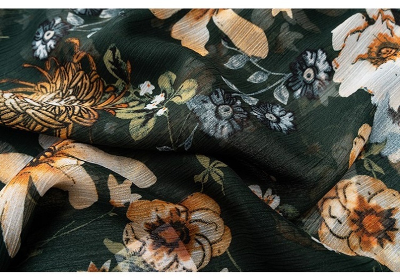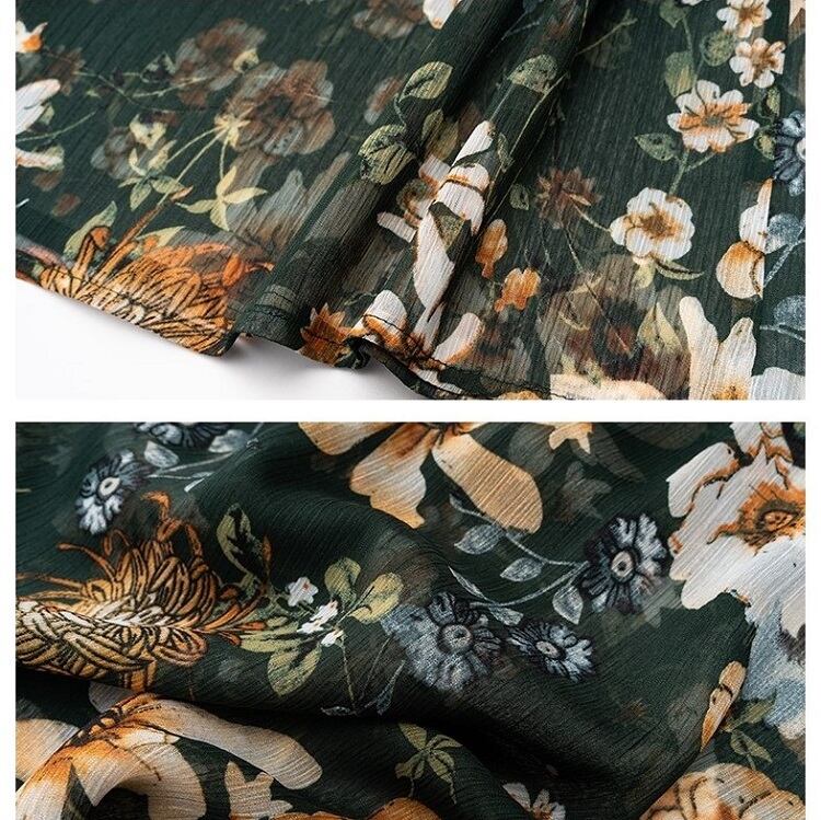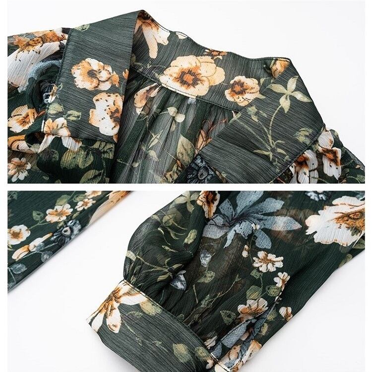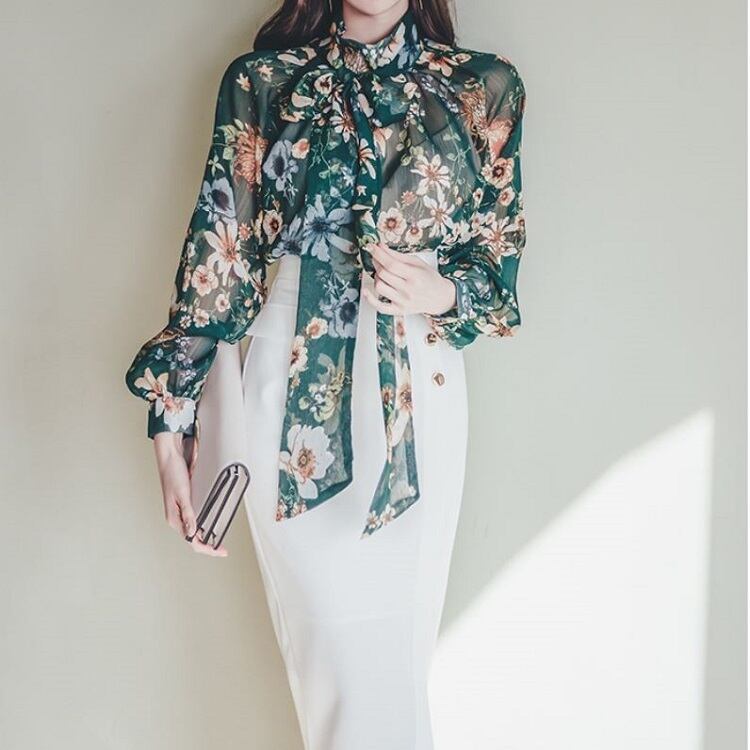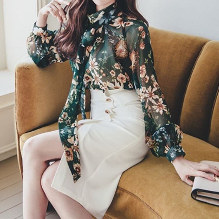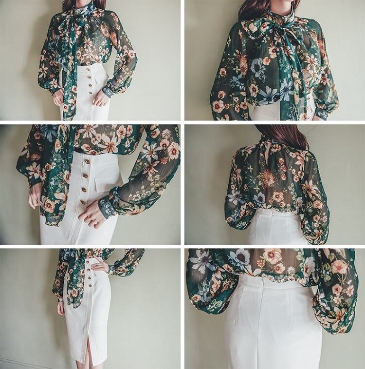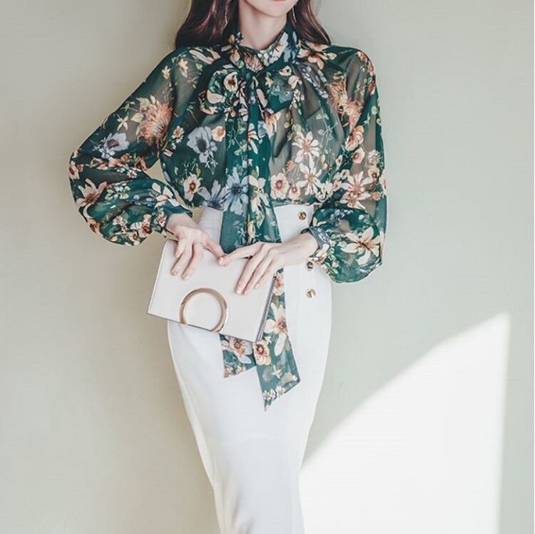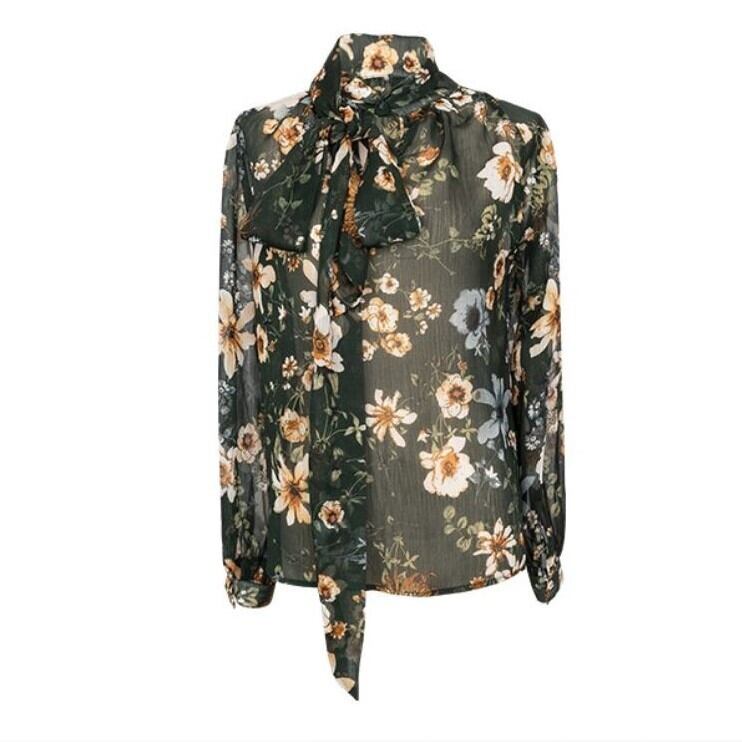 シフォンブラウス ボウタイ 長袖 花柄 透け感 レトロ カジュアル お出かけ デート オフィス お呼ばれ ゆったり グリーン