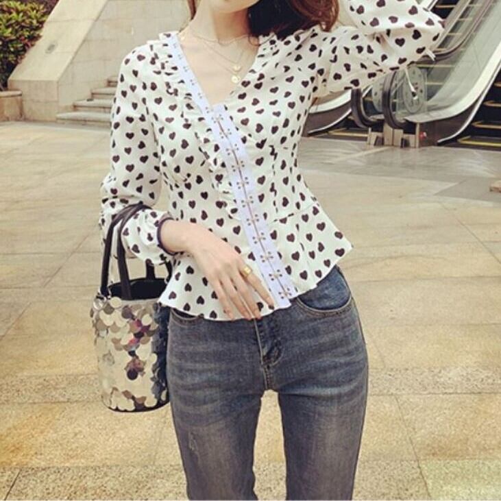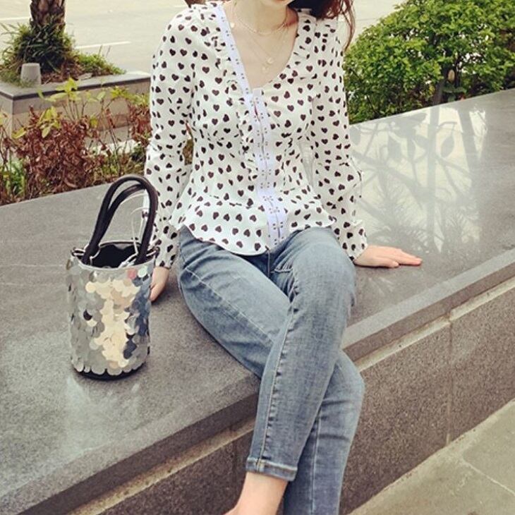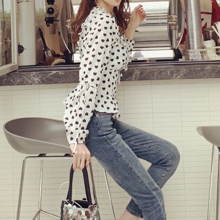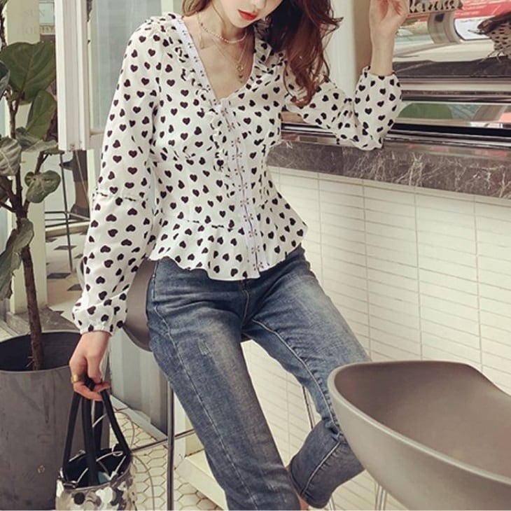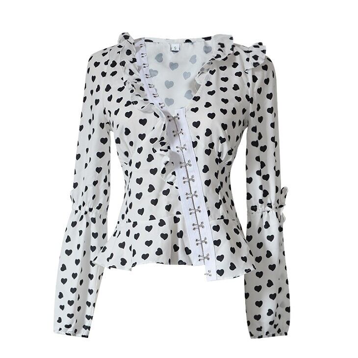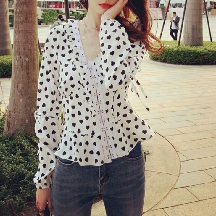 オーバーブラウス ハート柄 長袖 Vネック スリム レトロ カジュアル ガーリー お出かけ デート ホワイト