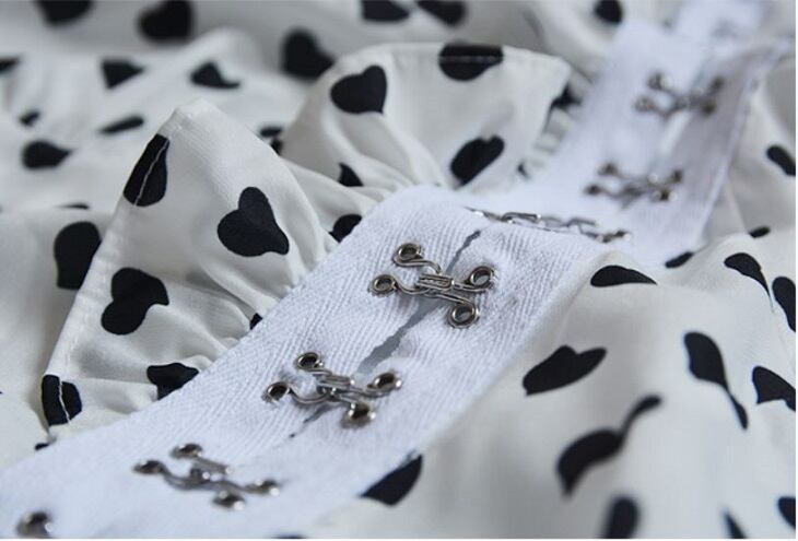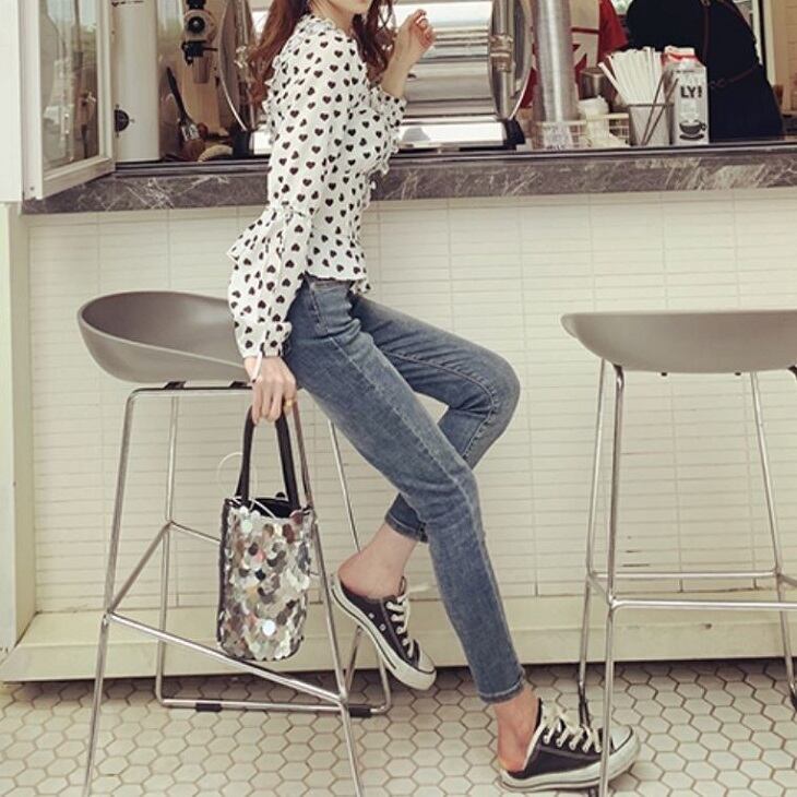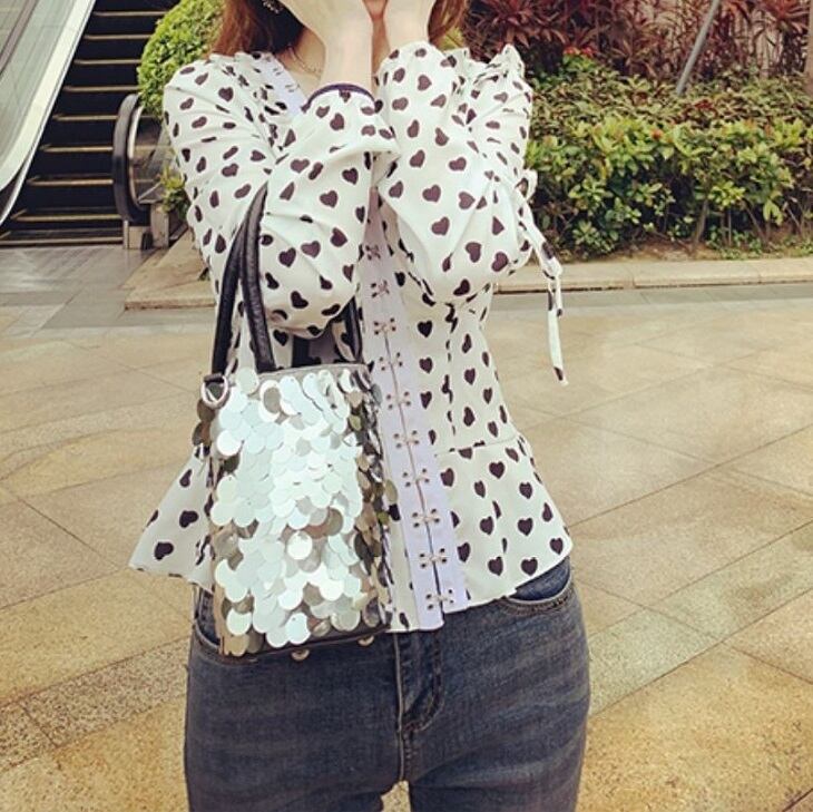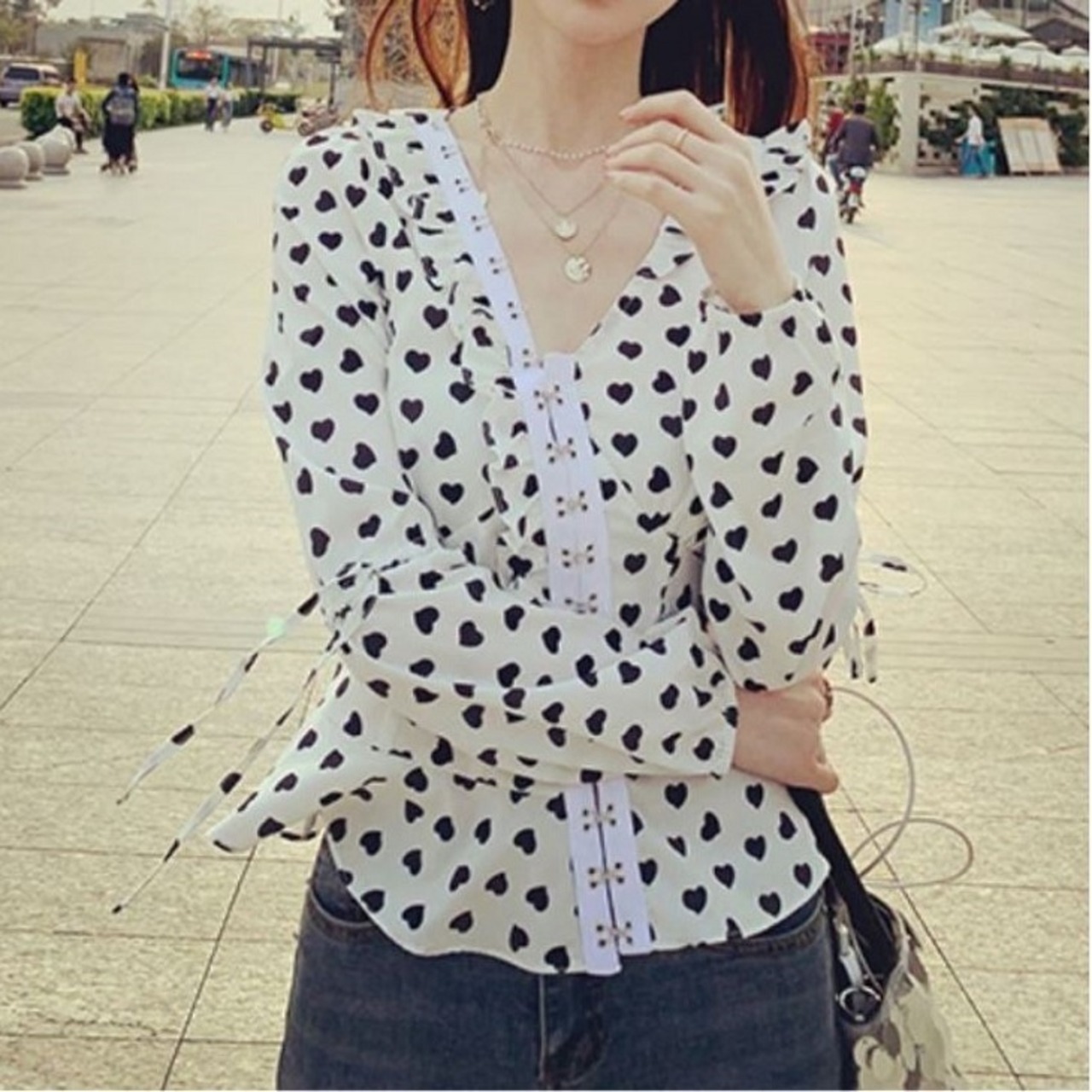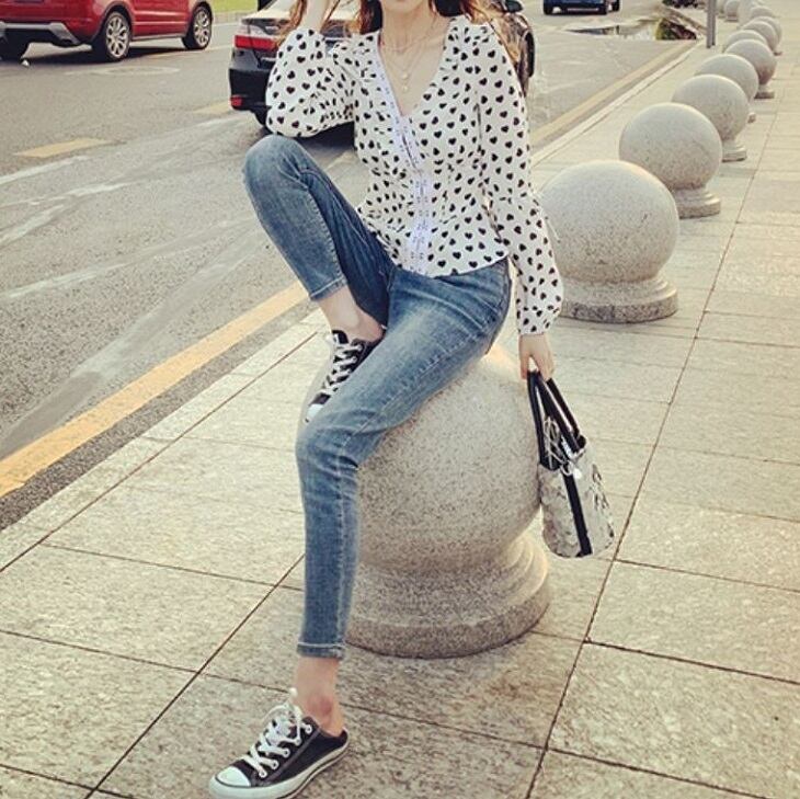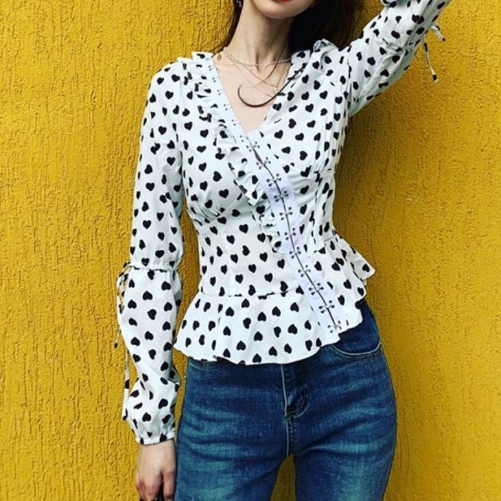 オーバーブラウス ハート柄 長袖 Vネック スリム レトロ カジュアル ガーリー お出かけ デート ホワイト