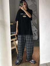 パンツ ワイドパンツ チェック柄 ゆったり クール ハイウエスト ウエストゴム ストレート カジュアル デイリー ラフ お出かけ 春 夏