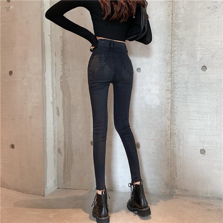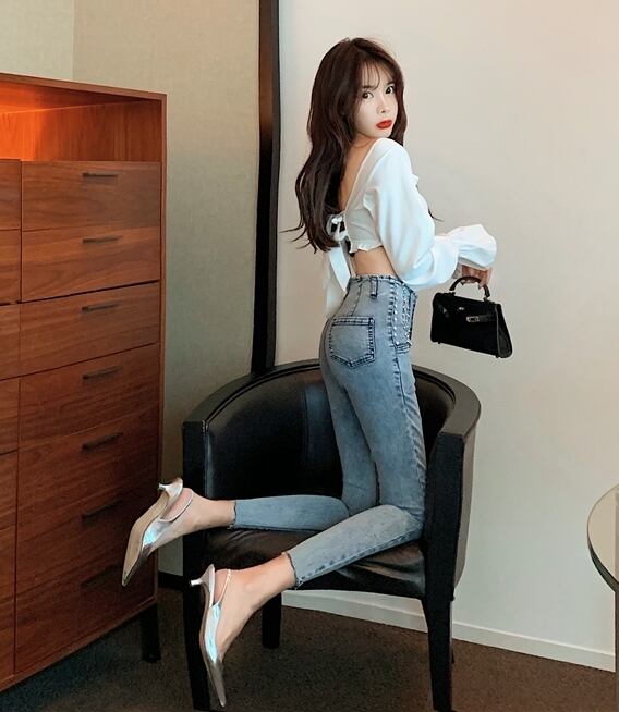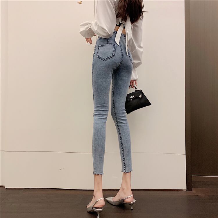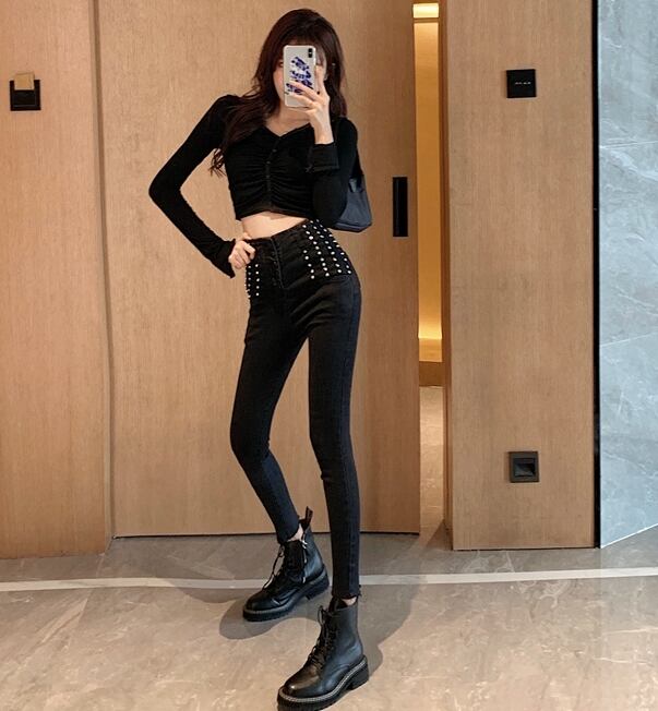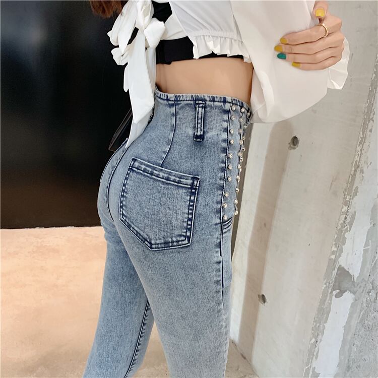 全2色 パンツ ボトムス ハイウエスト スタッズ デニムパンツ フィット スリム 8分丈 スキニー ユニーク ケミカル ガーリー カジュアル 韓国ファッション きれいめ 春 夏