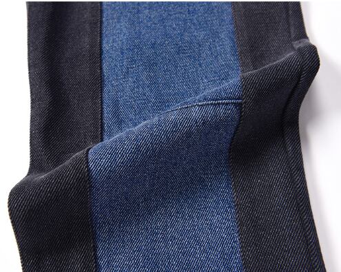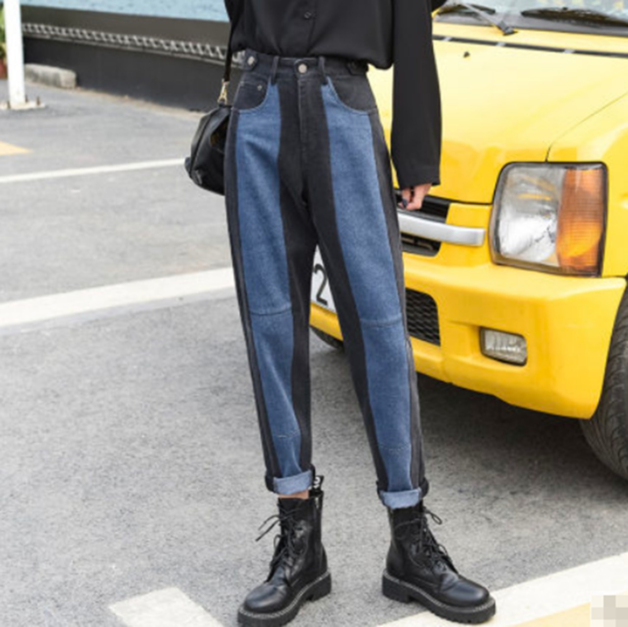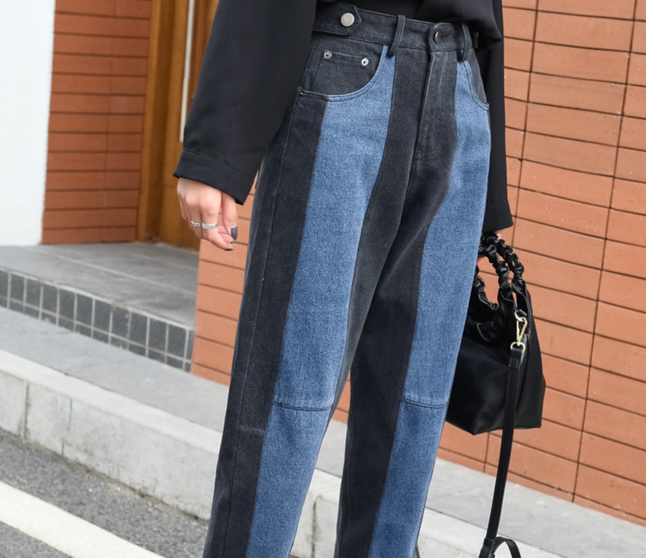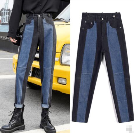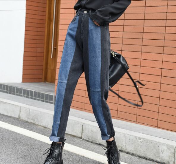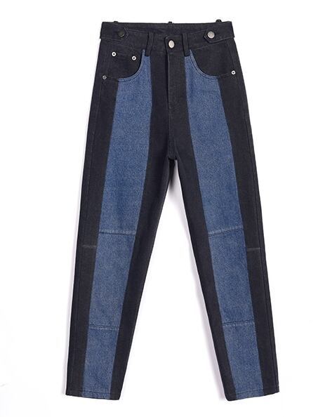 ジーンズ バイカラー デニムパンツ ボトムス アンクル丈 ロールアップ ハイウエスト ゆったりめ テーパードパンツ カジュアル おしゃれ ユニーク ストライプ 春 夏