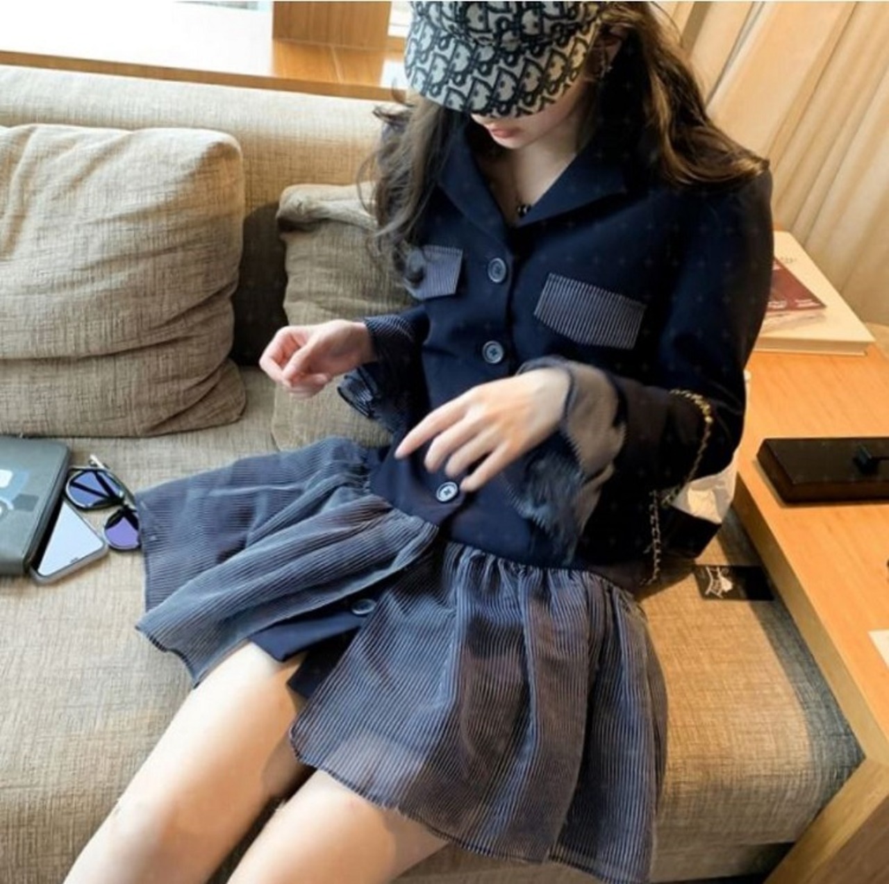 ふんわりシルエットのミニスカートが脚を細く綺麗に見せてくれます。