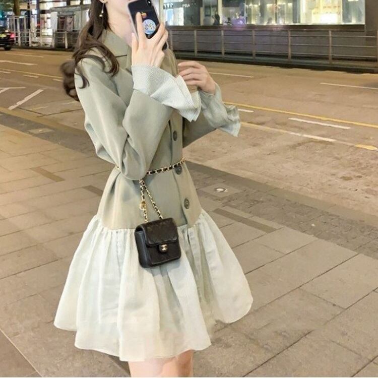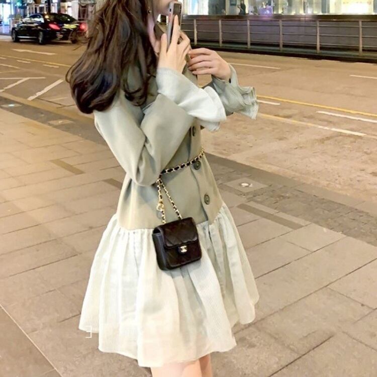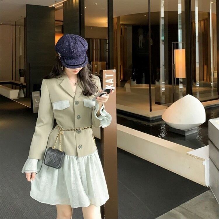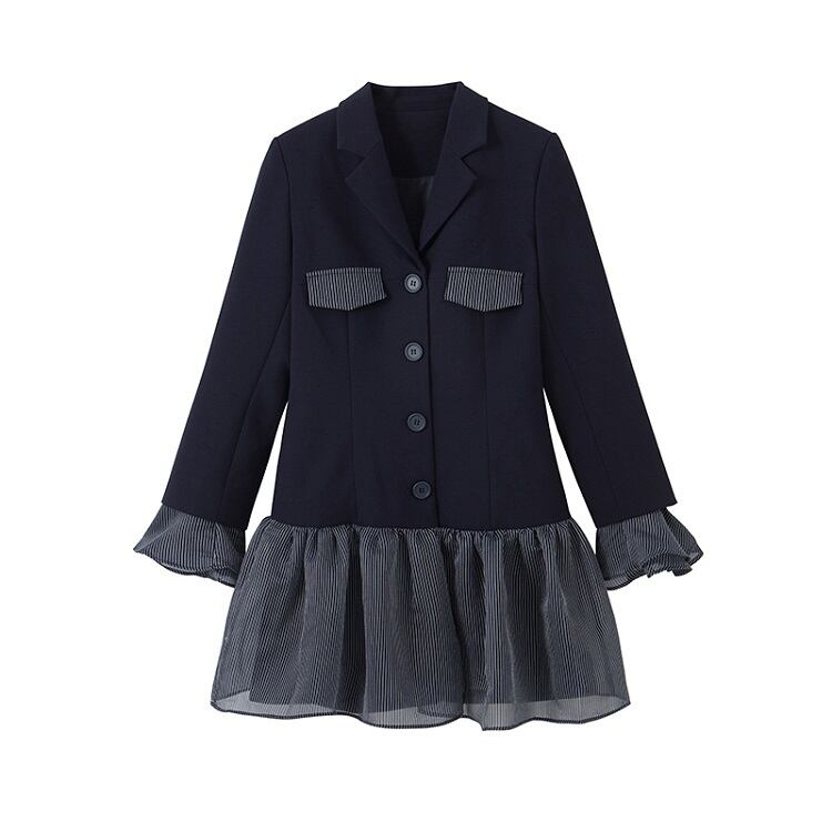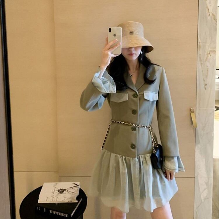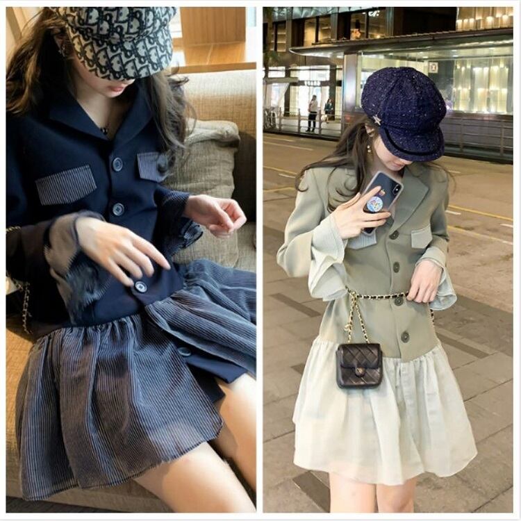 テーラードジャケットとレーススカートがドッキングしたワンピース。