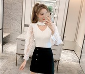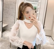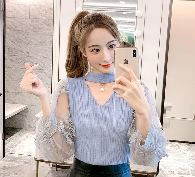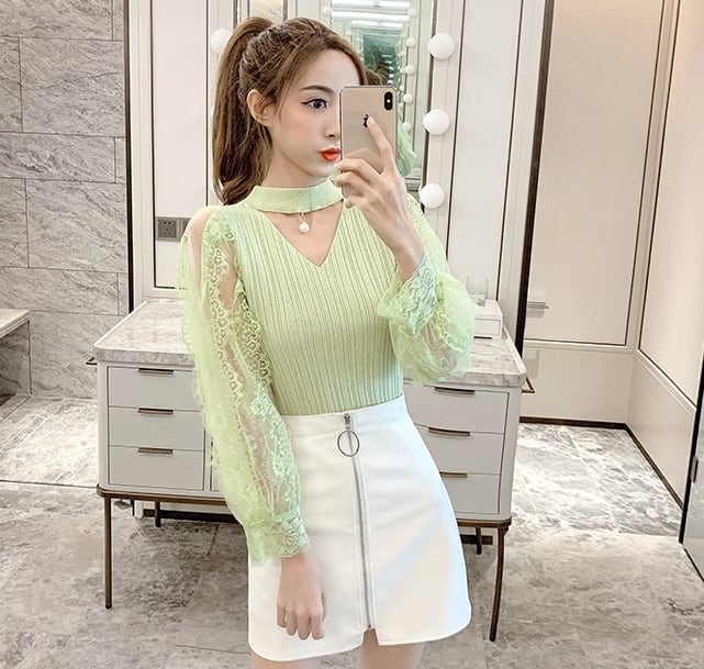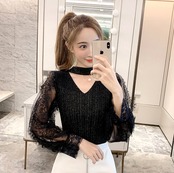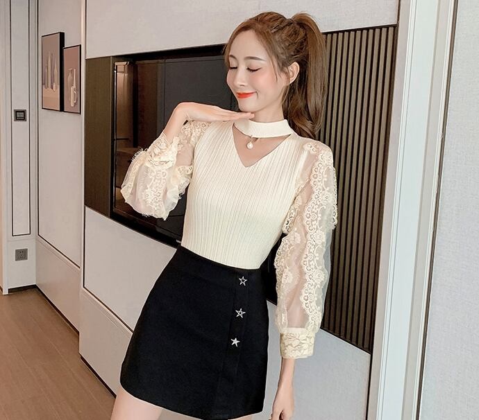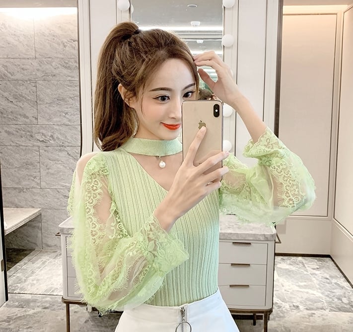 全5色 トップス ブラウス ハイネック レース Vネック 袖コンシャス シースルー パール 長袖 きれいめ 可愛い 上品 大人可愛い カジュアル デート 女子会 韓国ファッション 春 夏