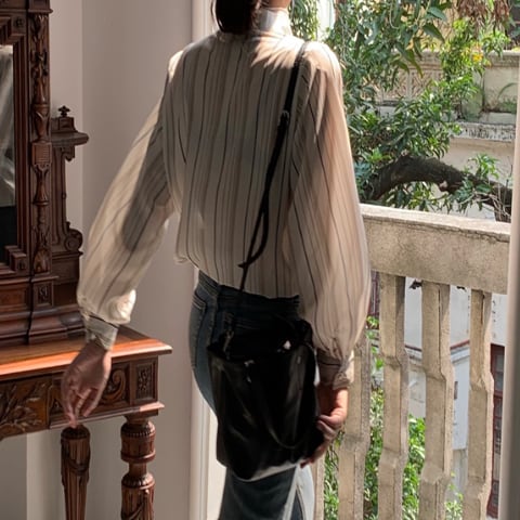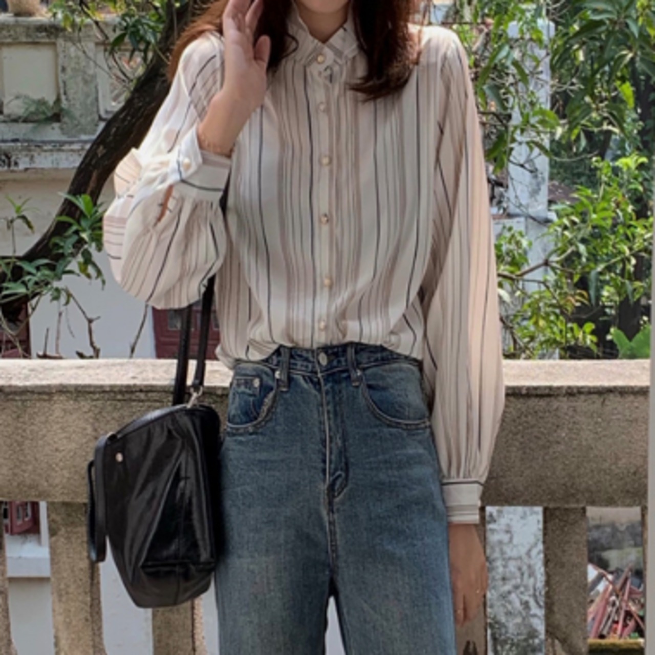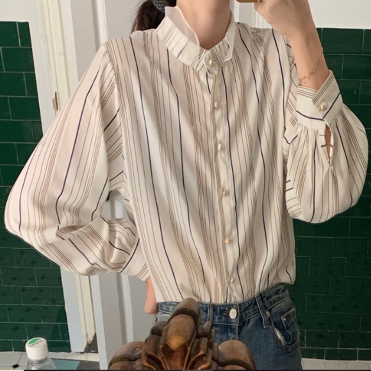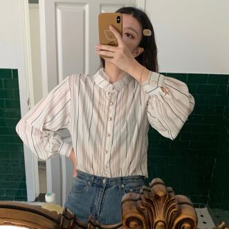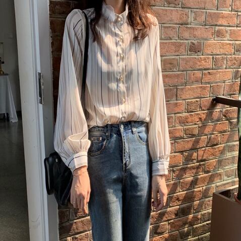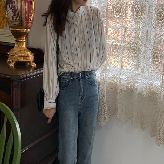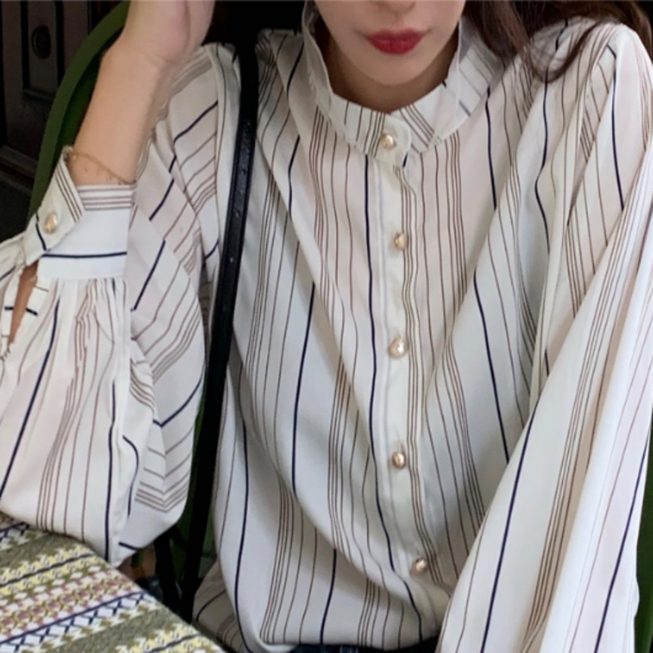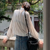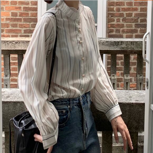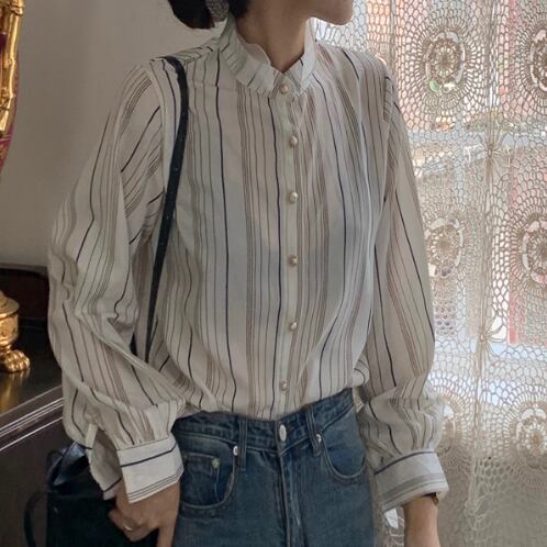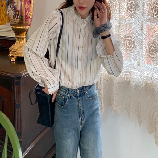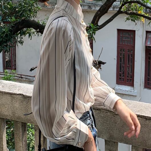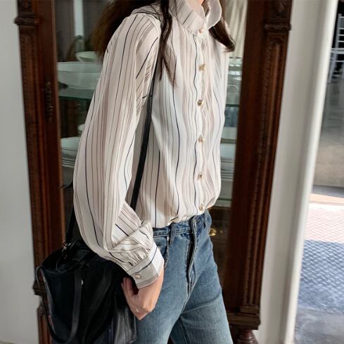 ラグジュアリー ストライプシャツ 襟付き 長袖 春秋 薄手 ストライプ シャツ 大人かわいい お出掛け 上品 デート