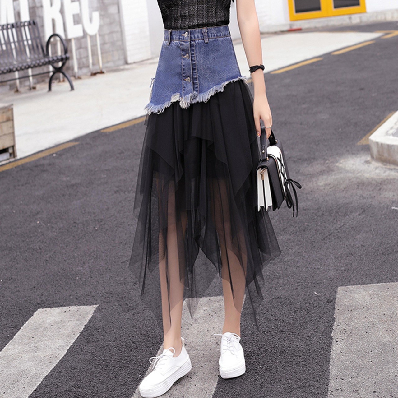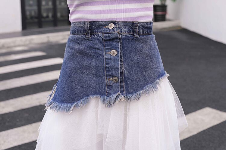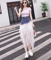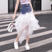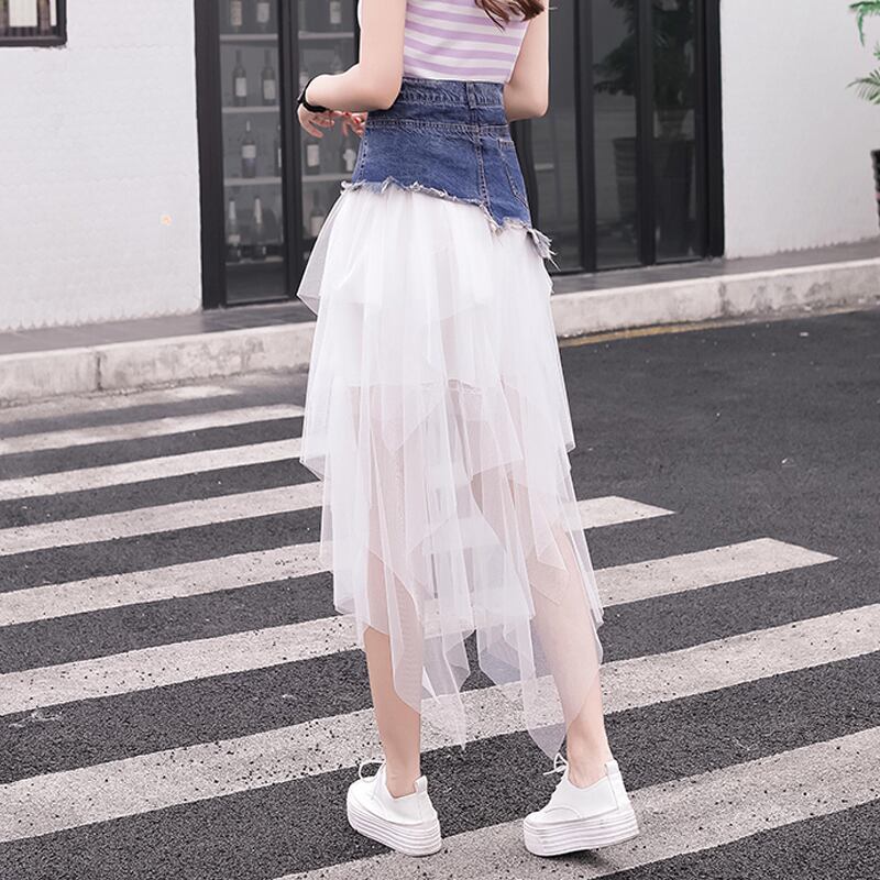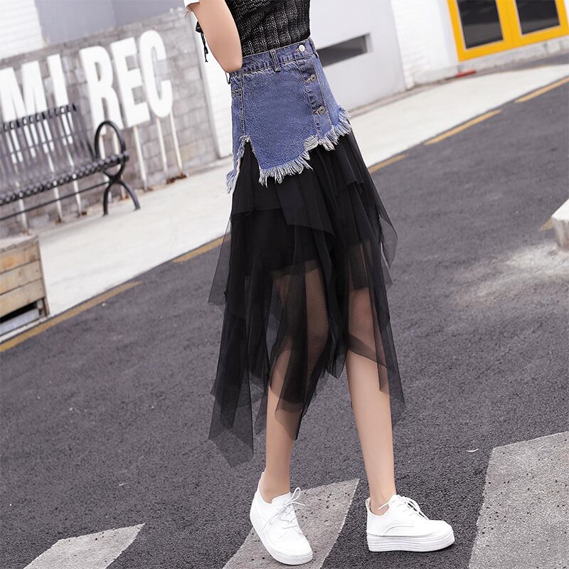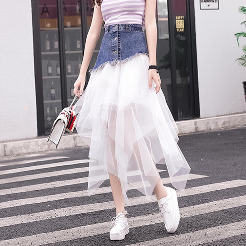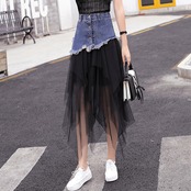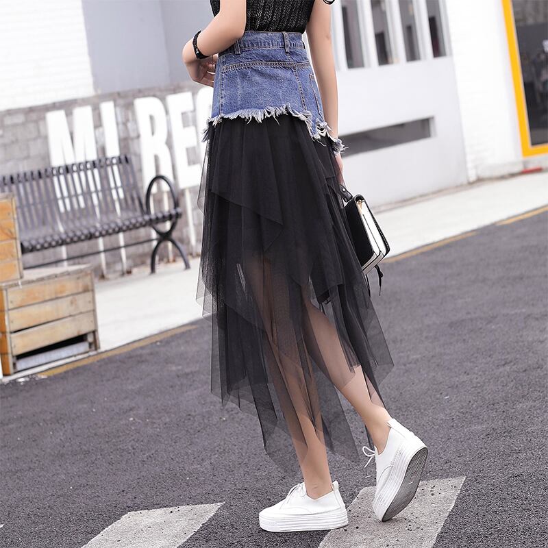 全2色 スカート ボトムス チュール シースルー ロング丈 アシンメトリー ティアード フリル デニム切り替え ミックス ハイウエスト 個性的 ガーリー 可愛い ユニーク カジュアル きれいめ 春 夏