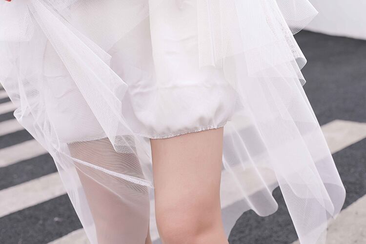 デニム切り替えから広がるチュールフリルが可愛く、女性らしさを演出しています。