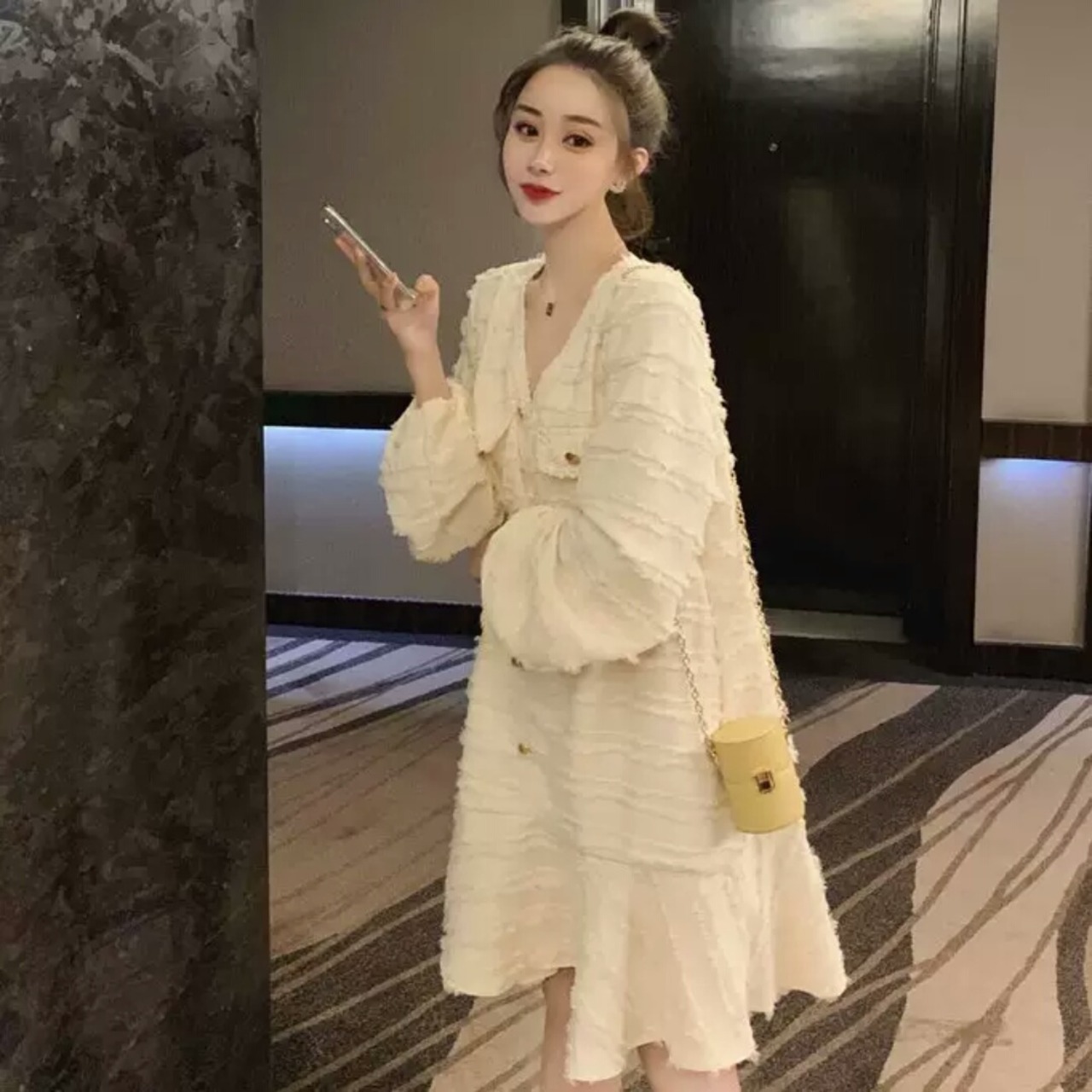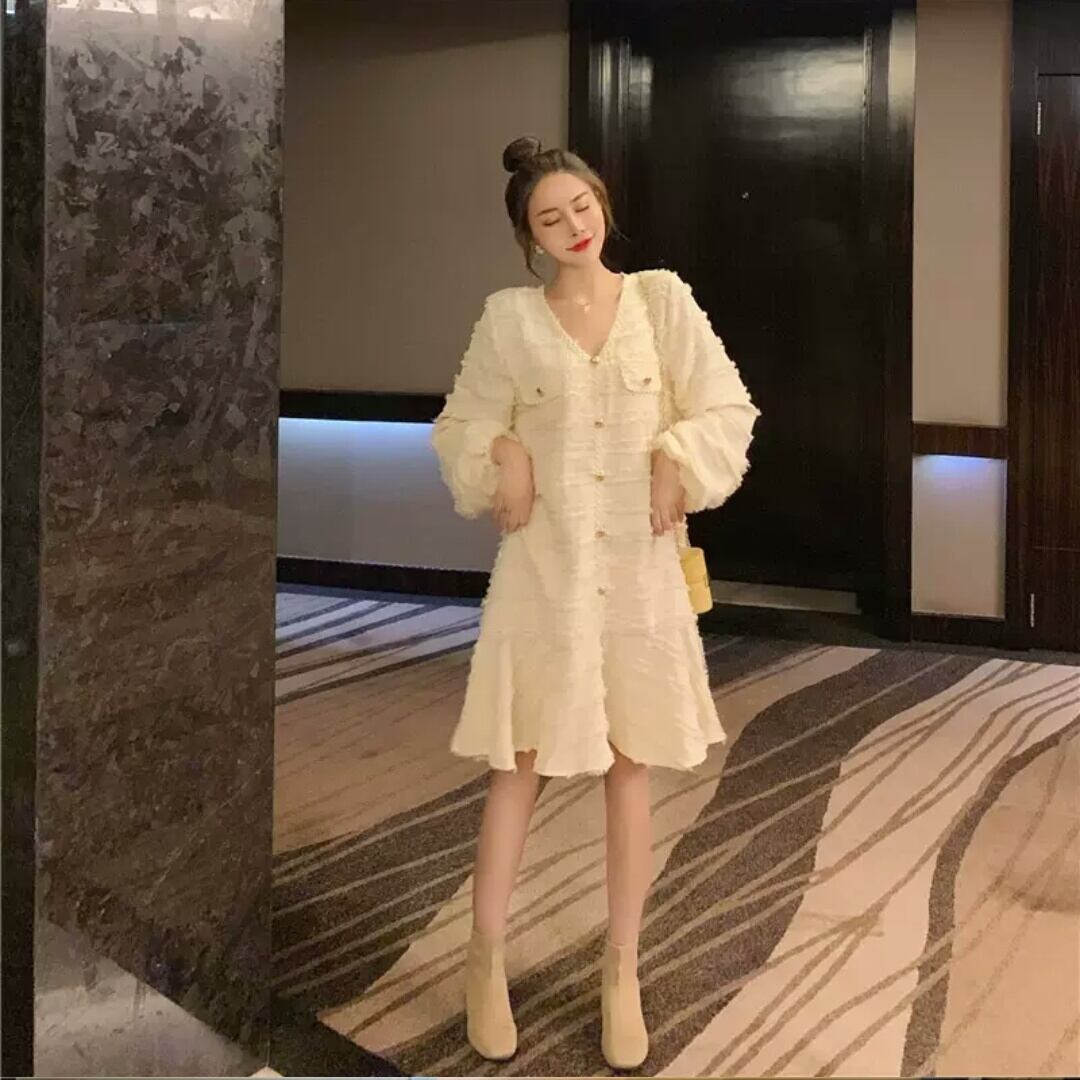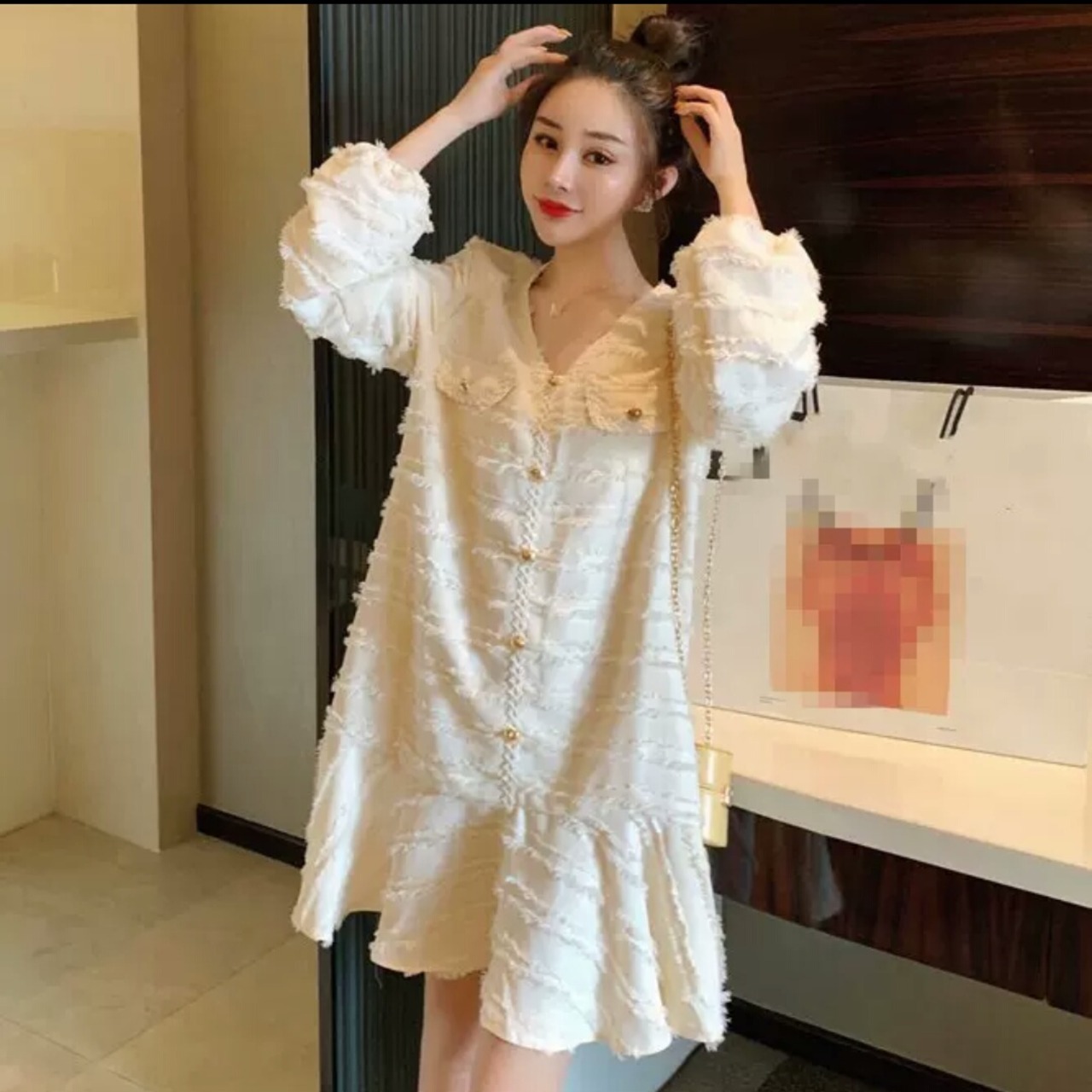 Vネック フリル ワンピース ショート丈 ミニ丈 長袖 大人 カジュアル キレイめ 可愛い 清楚 お出かけ お買い物 デート 女子会 春 夏 通学 学生 通勤 韓国ファッション