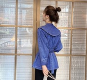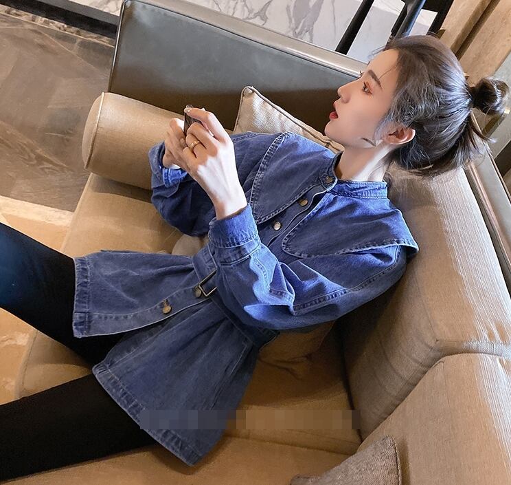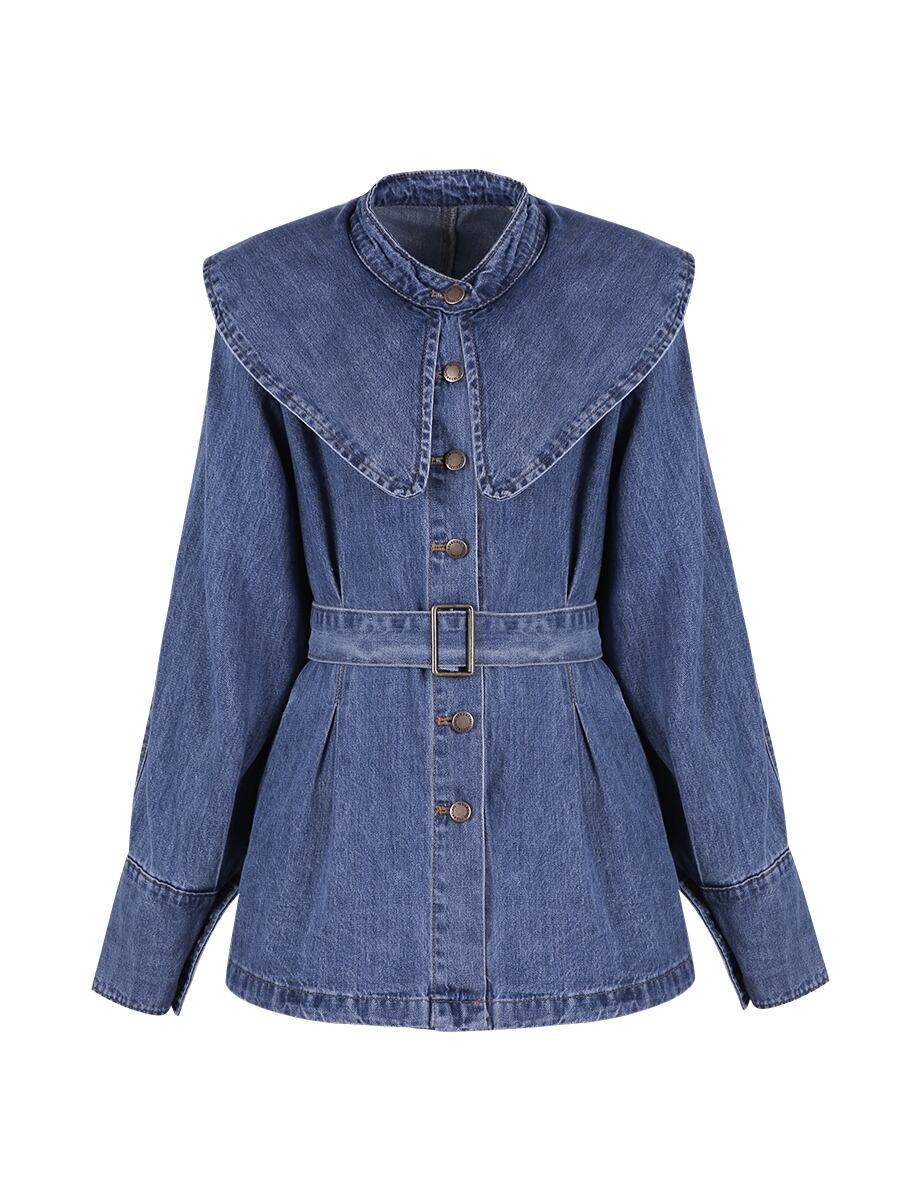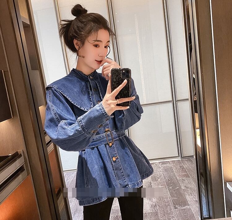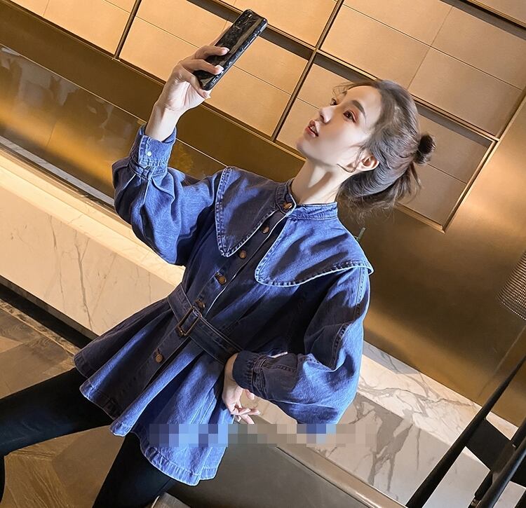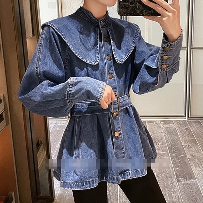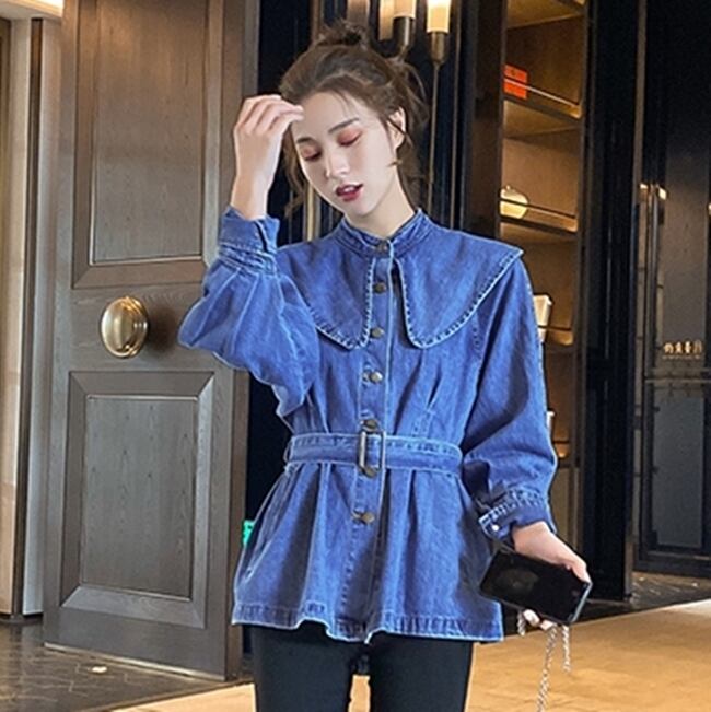 トップス デニムシャツ フロントボタン ウエストベルト 長袖 ジャケット ジーンズ カジュアル パフスリーブ ペプラムシルエット 大人 デート 春