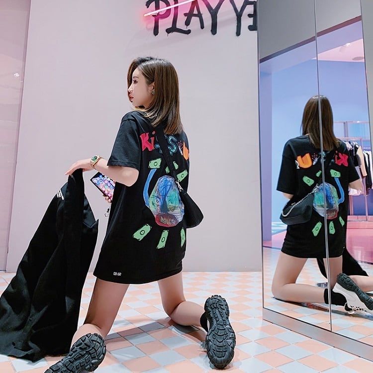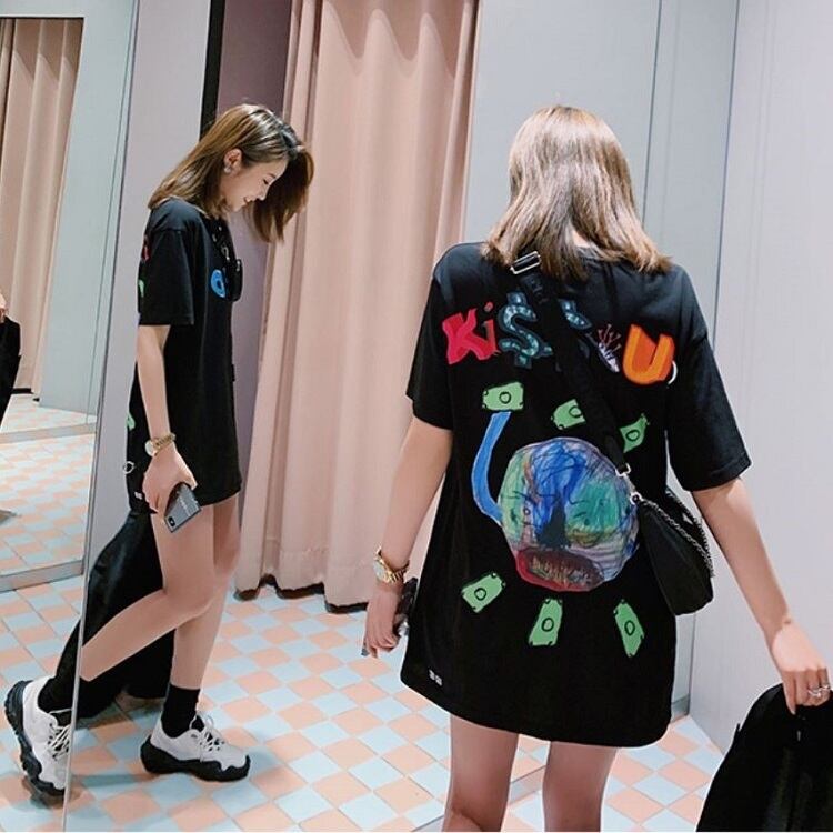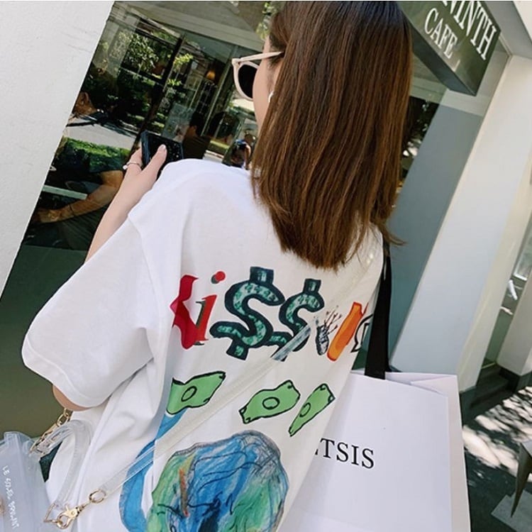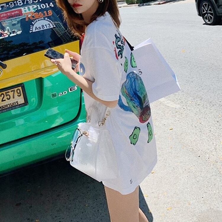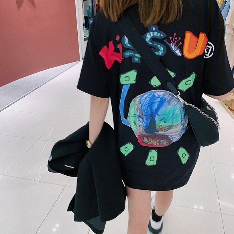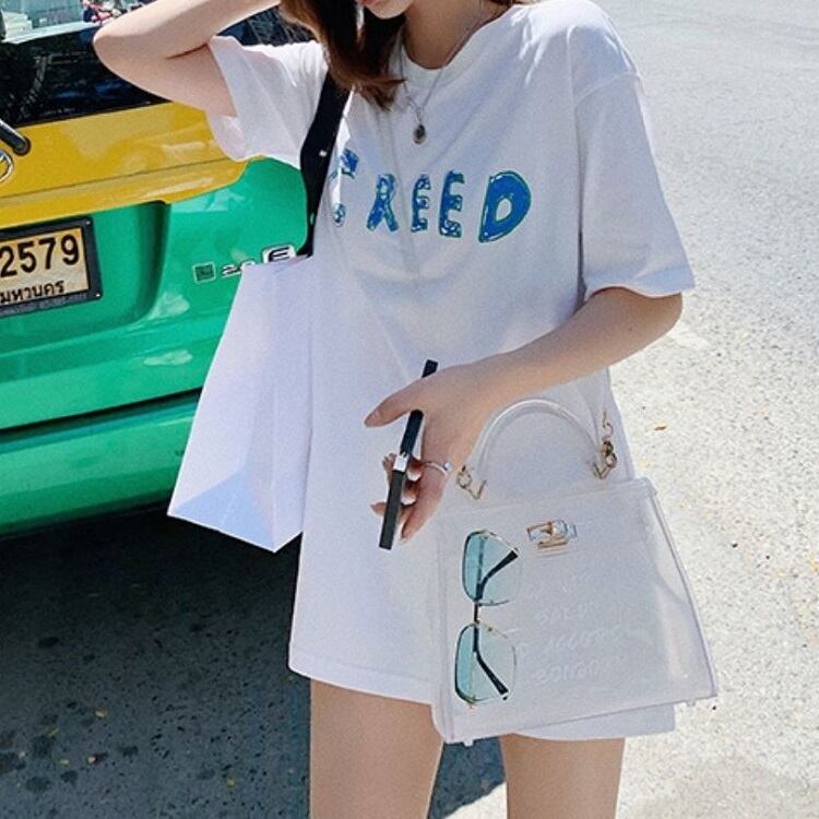 全2色 Tシャツ 半袖 バックプリント ミドル丈 ラウンドネック プルオーバー ロゴ カジュアル お出かけ レジャー デイリー 普段着 ホワイト ブラック