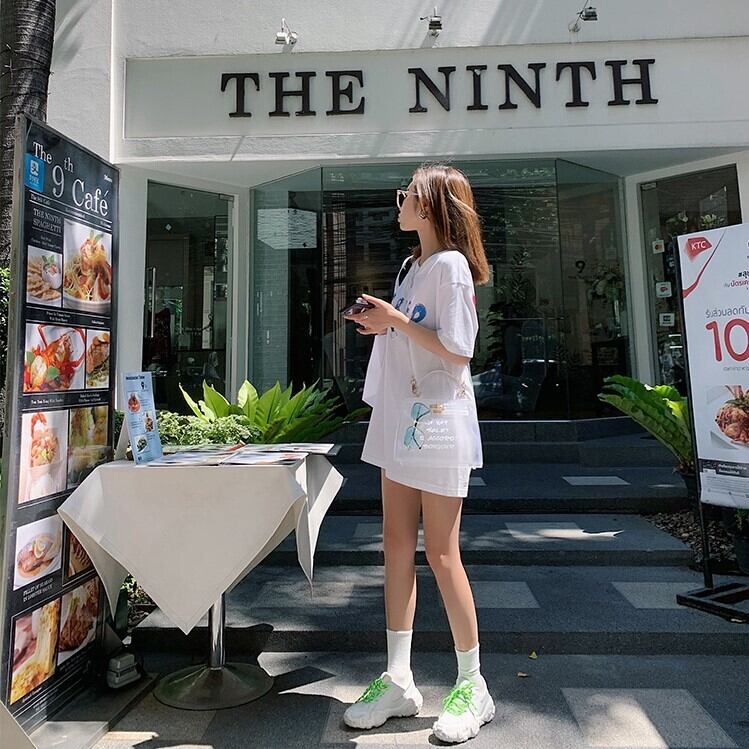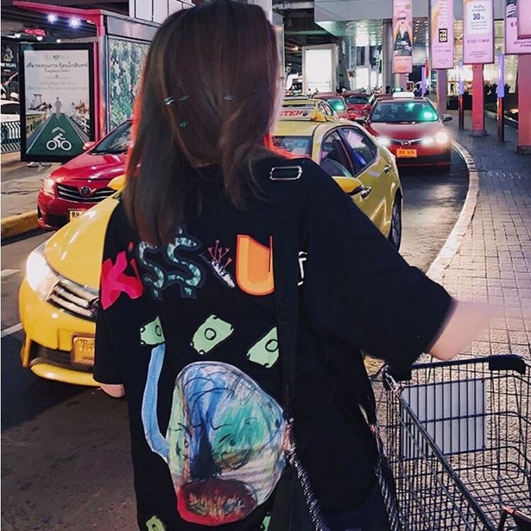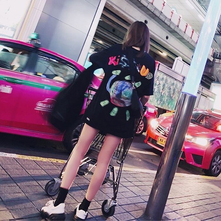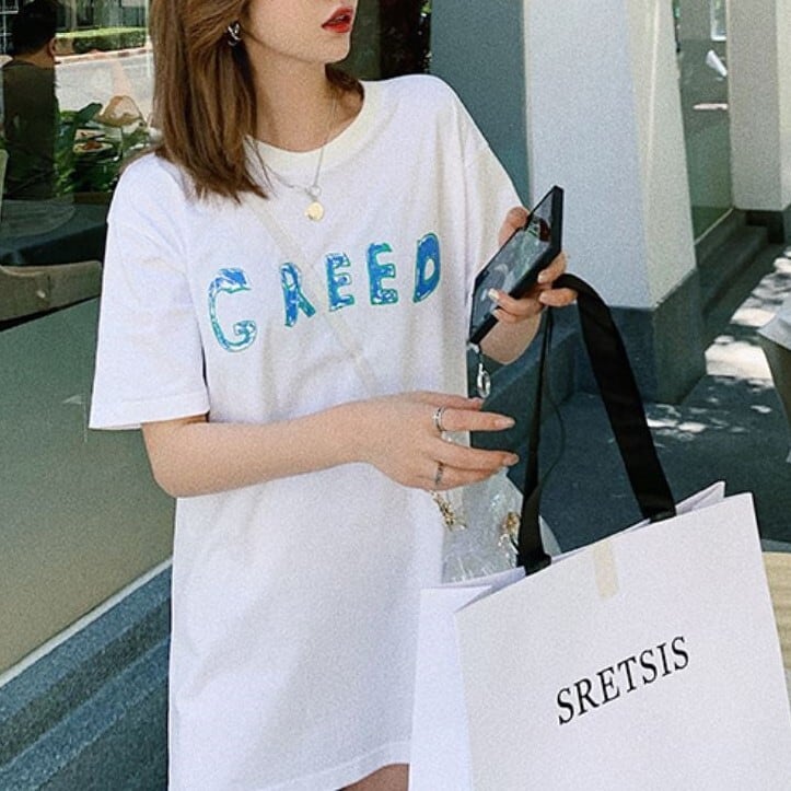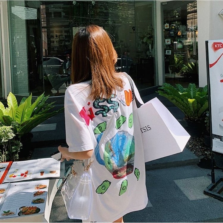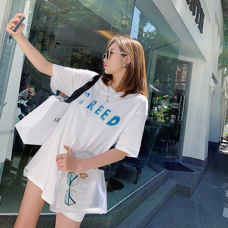 全2色 Tシャツ 半袖 バックプリント ミドル丈 ラウンドネック プルオーバー ロゴ カジュアル お出かけ レジャー デイリー 普段着 ホワイト ブラック