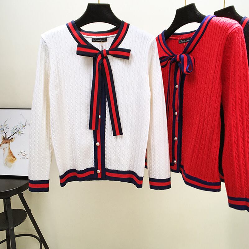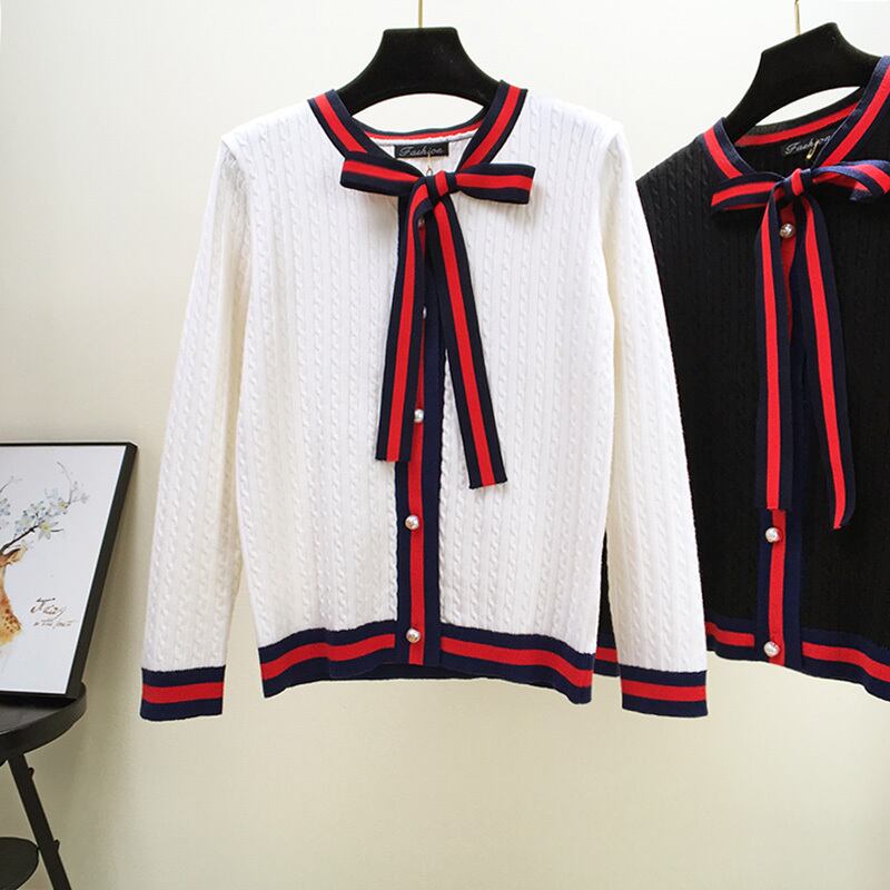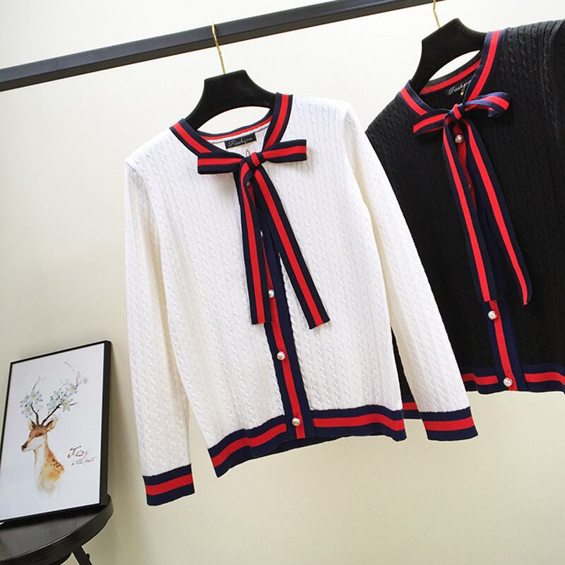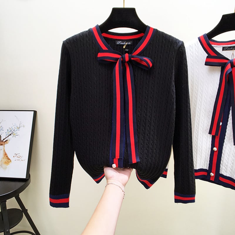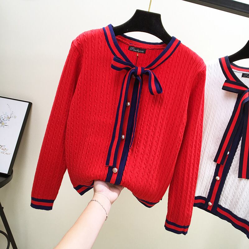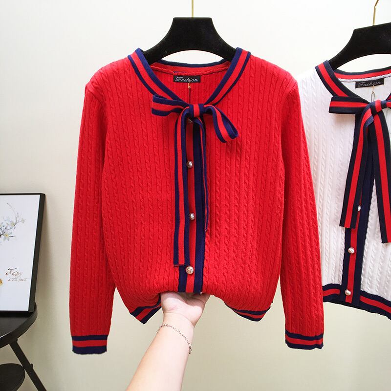 全3色 カーディガン リボンタイ ケーブルニット 長袖 カジュアル お出かけ オフィス デイリー ホワイト レッド ブラック