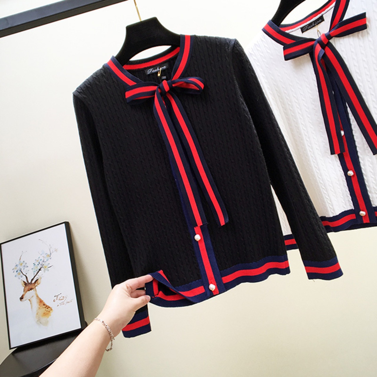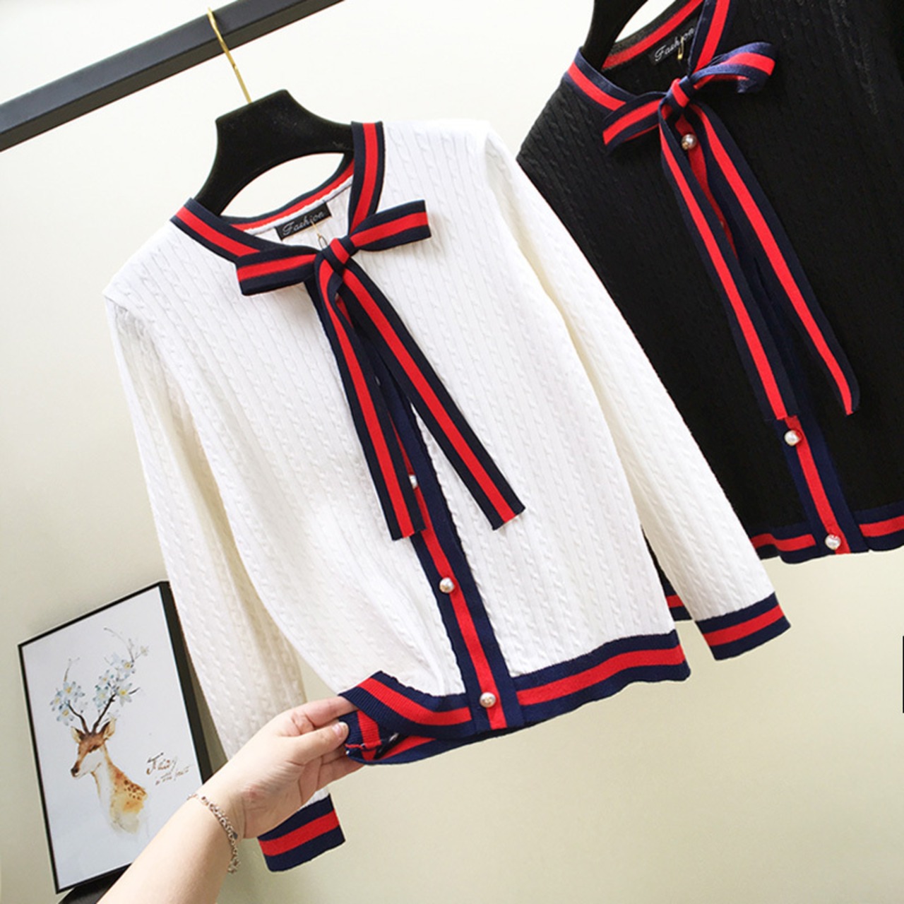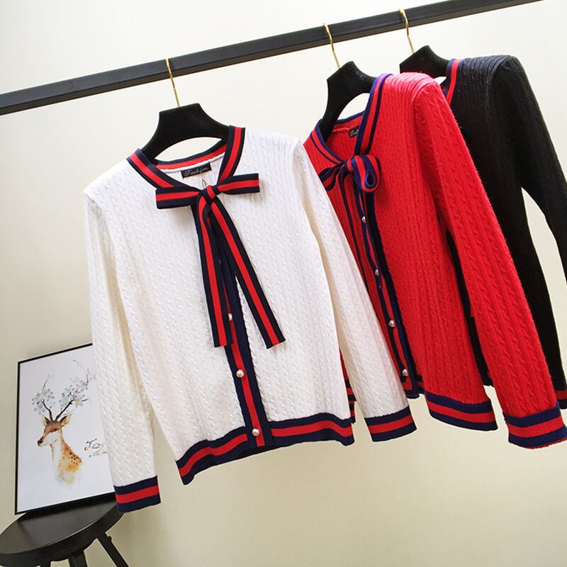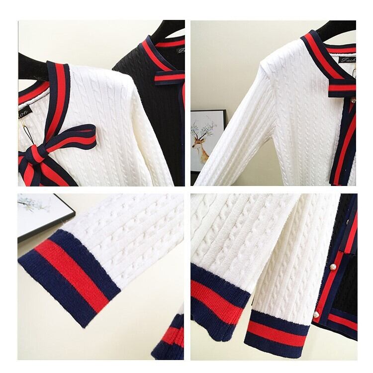 全3色 カーディガン リボンタイ ケーブルニット 長袖 カジュアル お出かけ オフィス デイリー ホワイト レッド ブラック