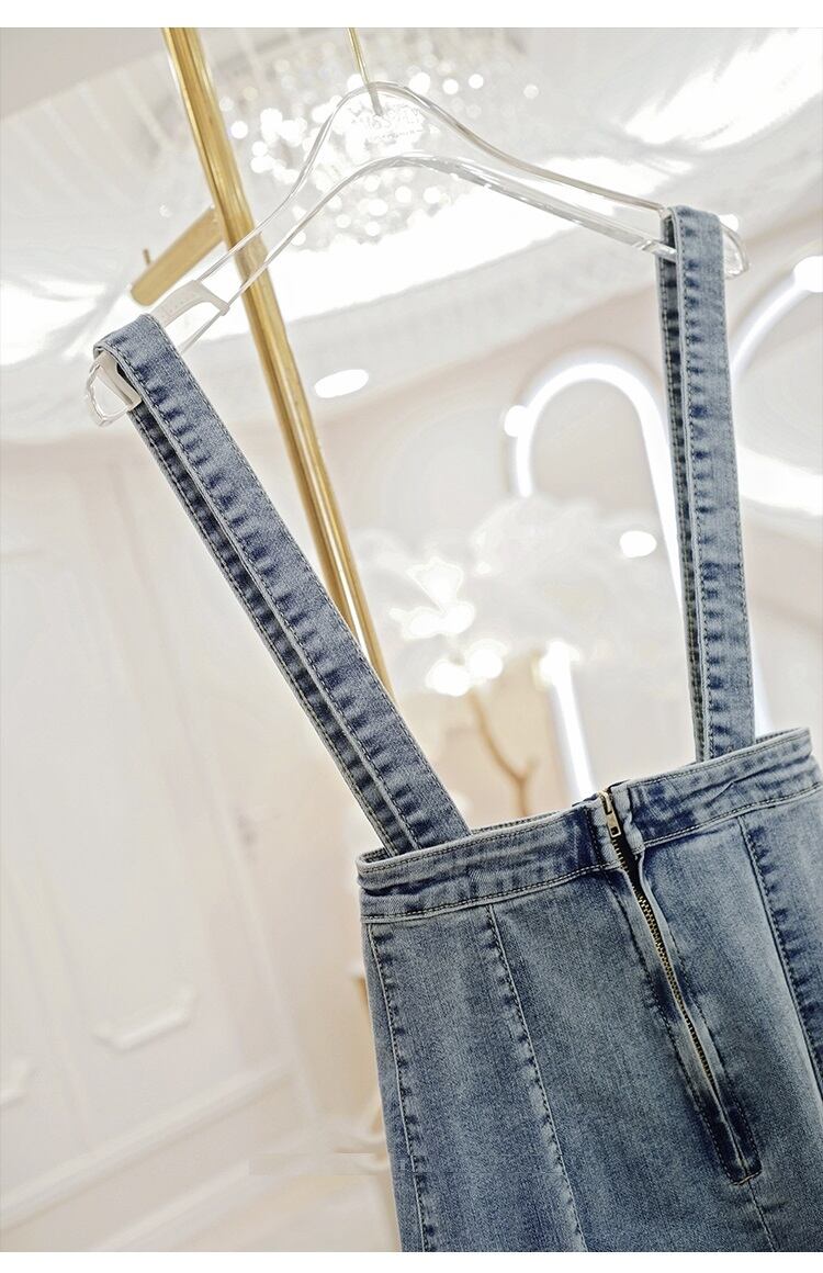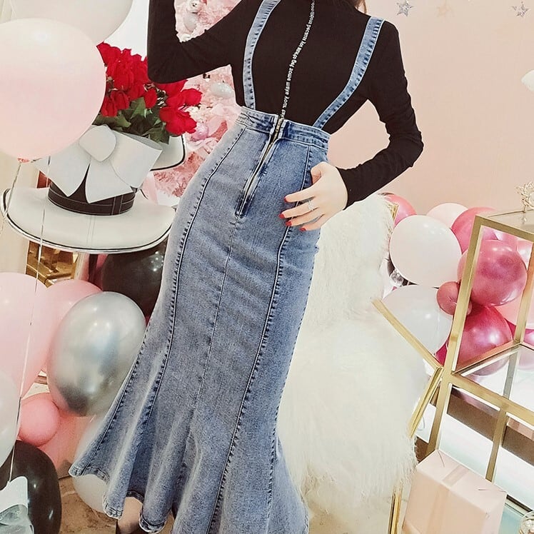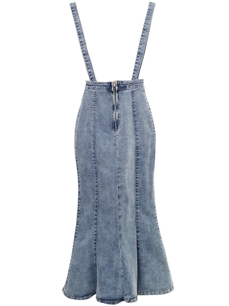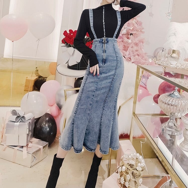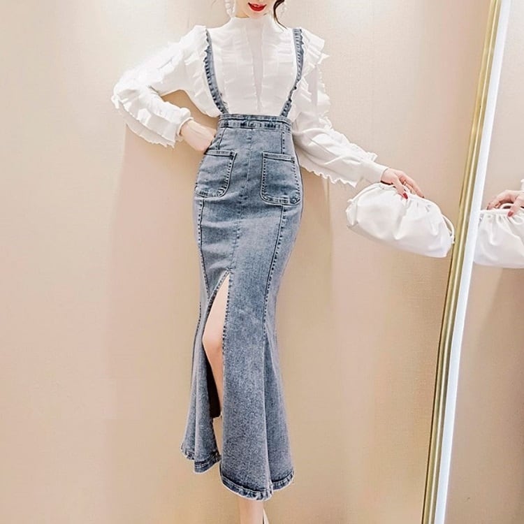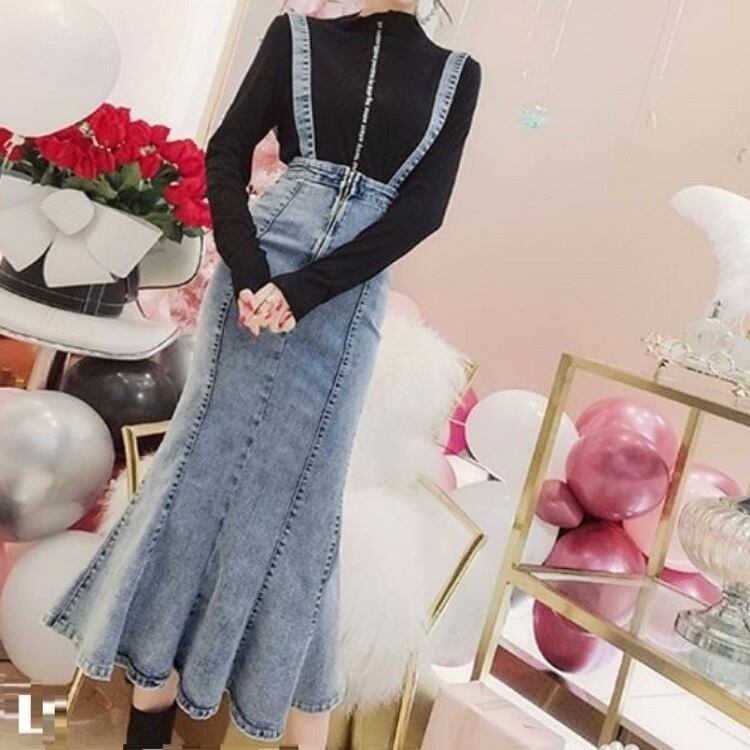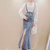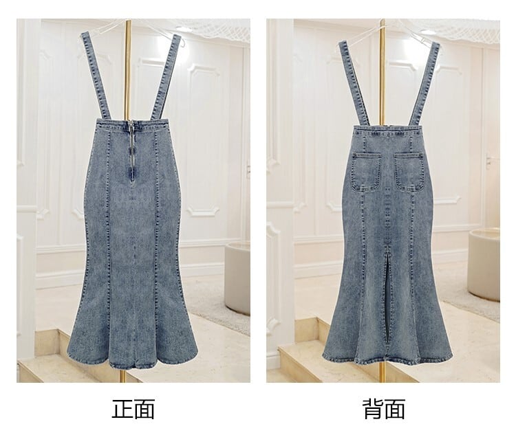 デニムスカート 2WAY ストラップ ミディ丈 マーメイド スリット スリム カジュアル お出かけ デイリー