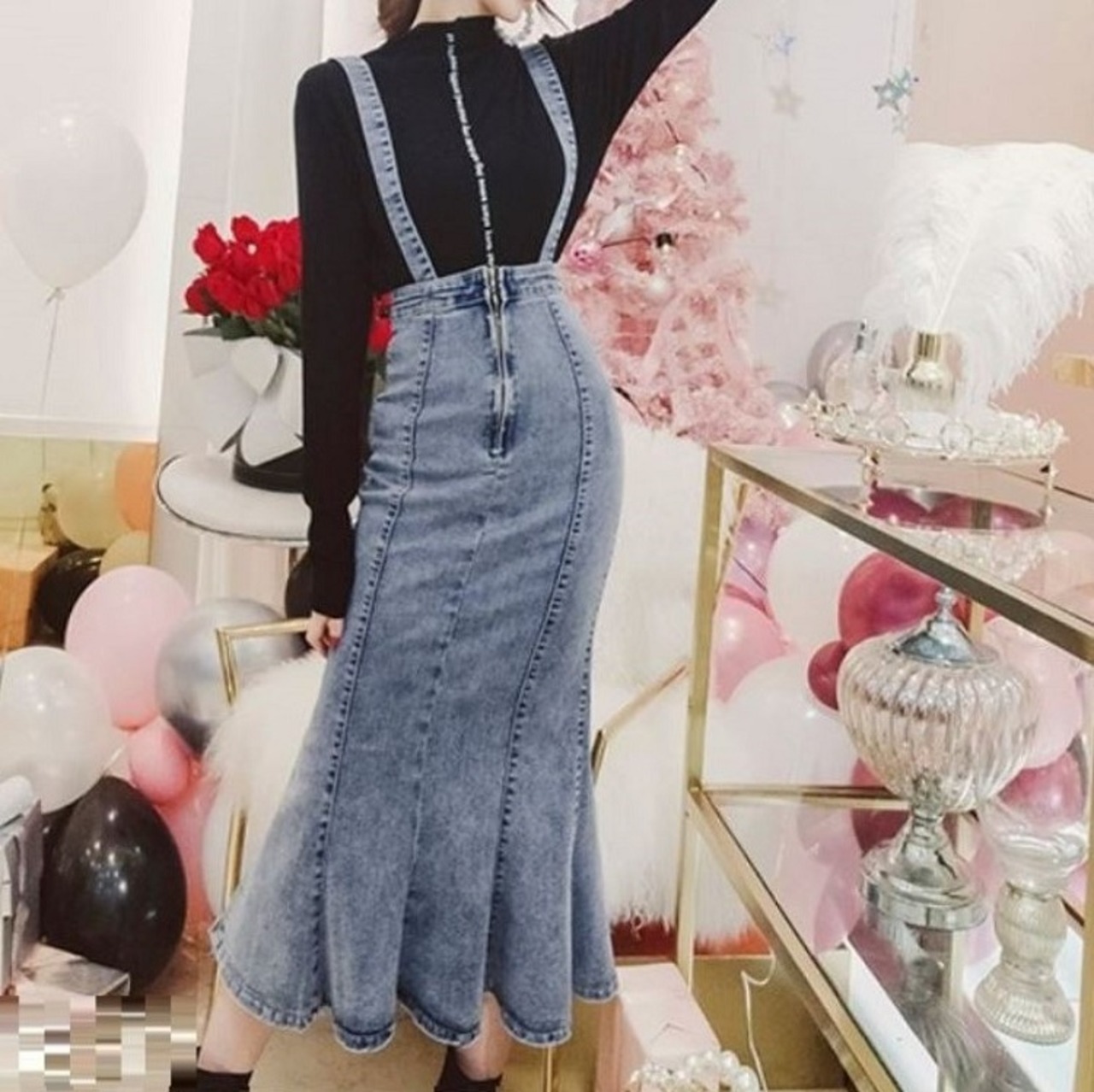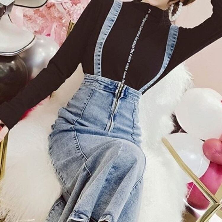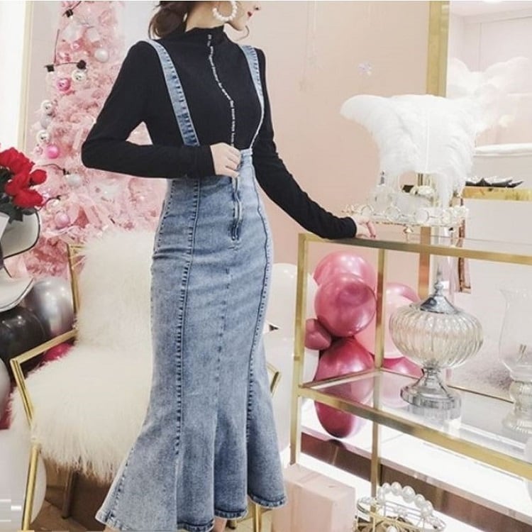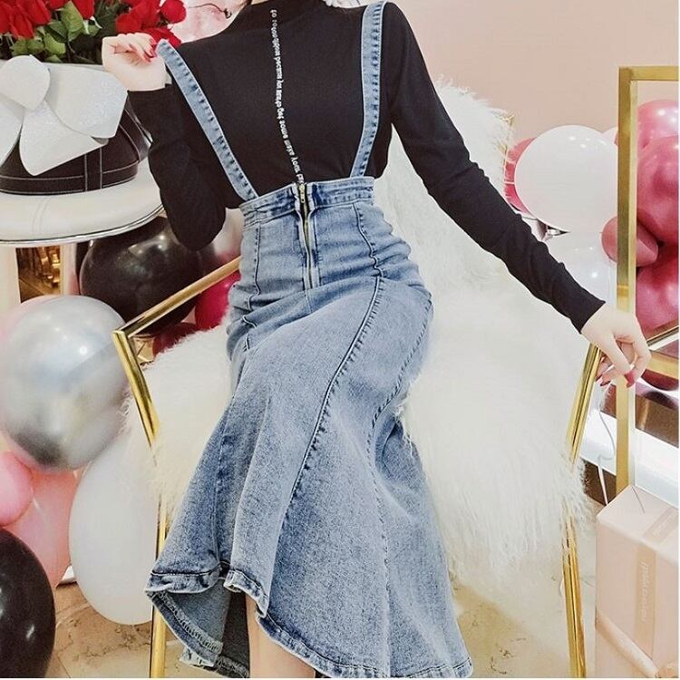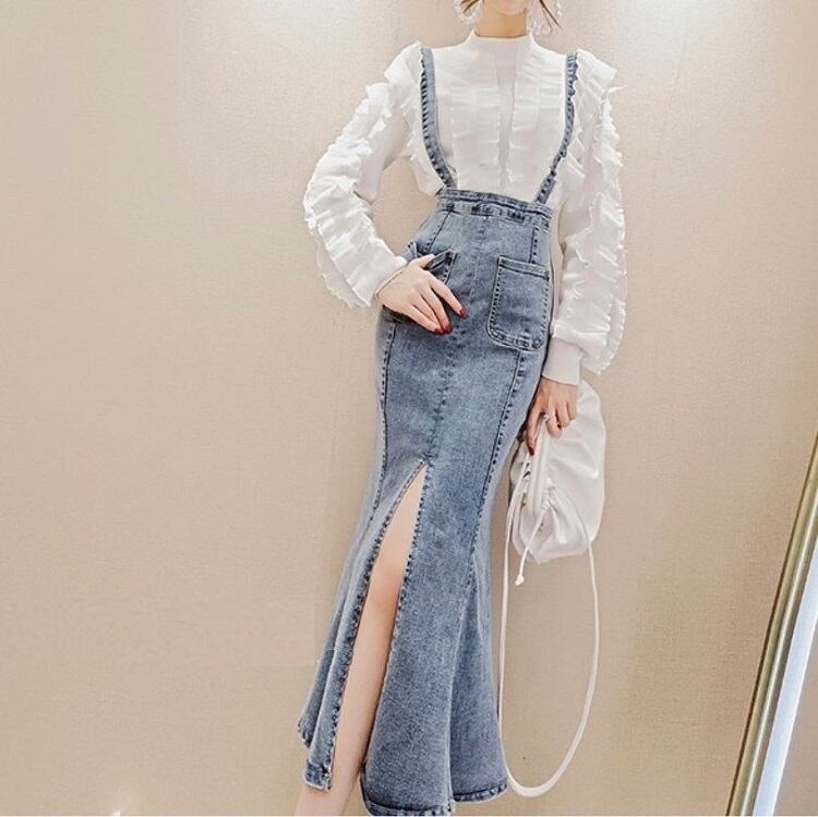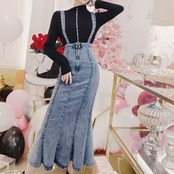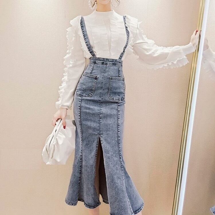 デニムスカート 2WAY ストラップ ミディ丈 マーメイド スリット スリム カジュアル お出かけ デイリー