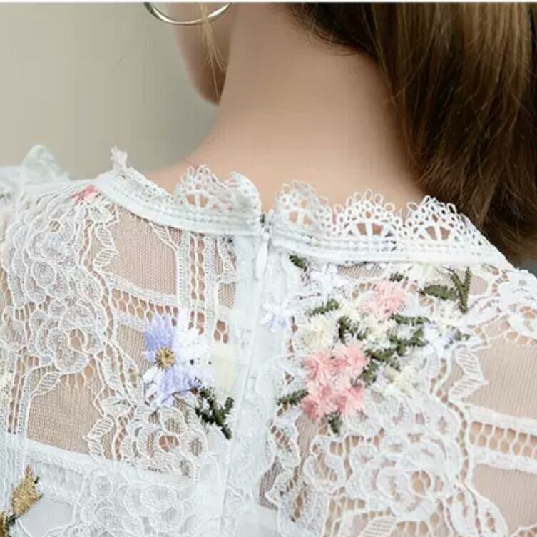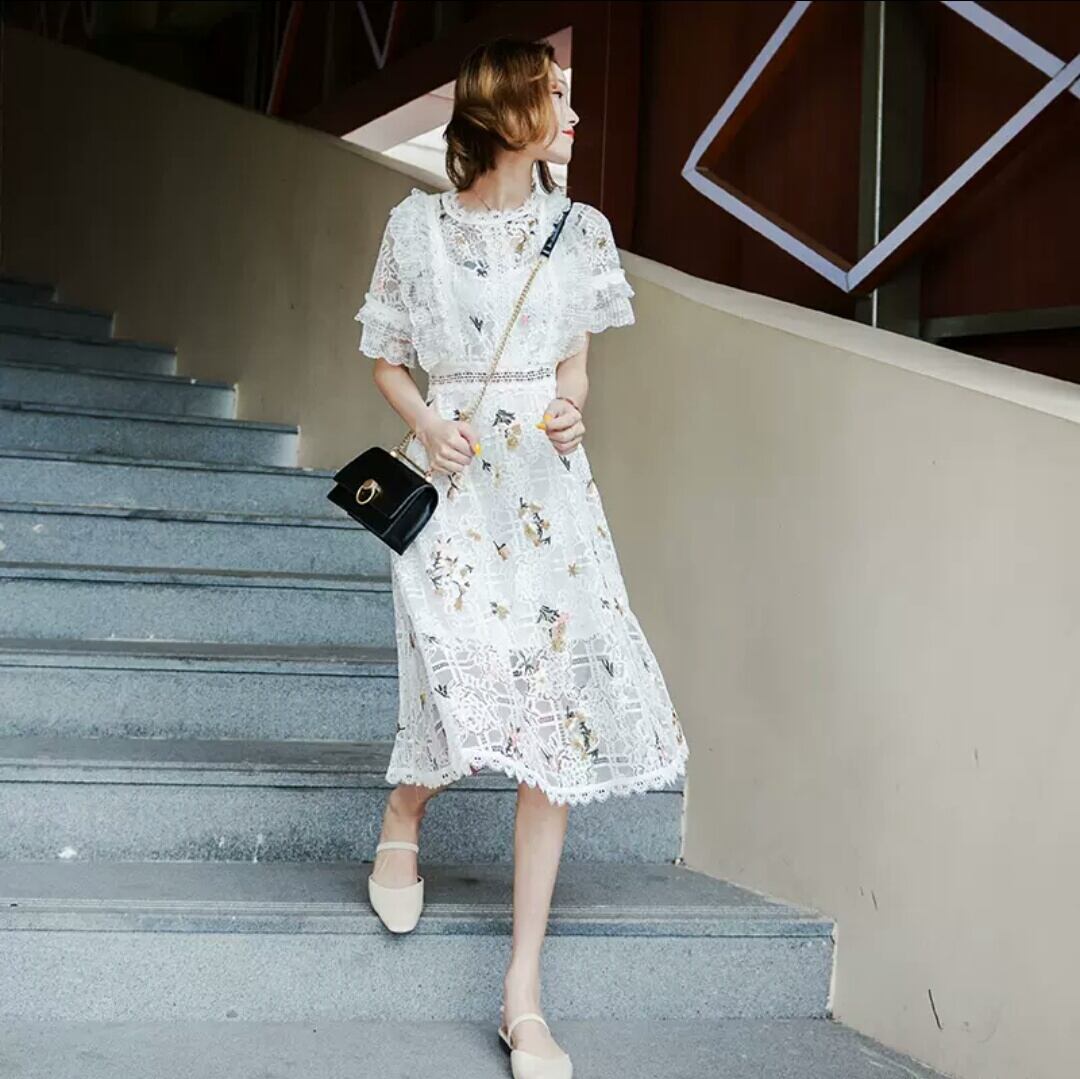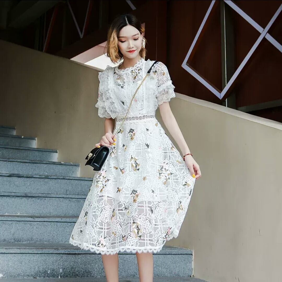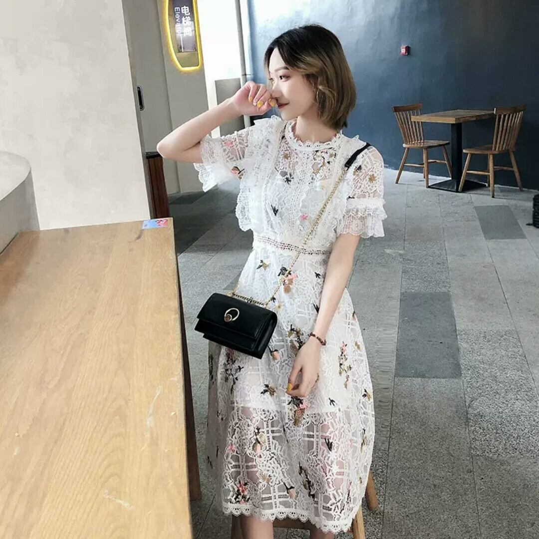 レース 花柄 フラワー 刺繍 半袖 ワンピース ドレス ミドル丈 大人 キレイめ 可愛い 清楚 上品 エレガント お出かけ お買い物 デート 女子会 春 夏 通学 学生 通勤 韓国ファッション
