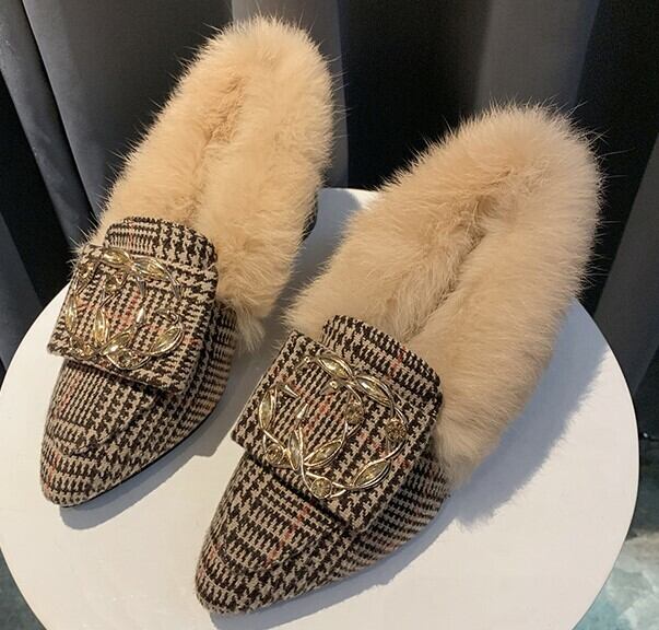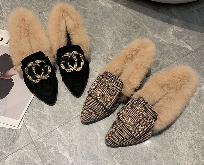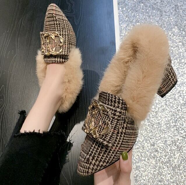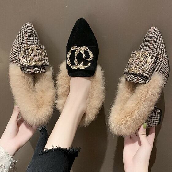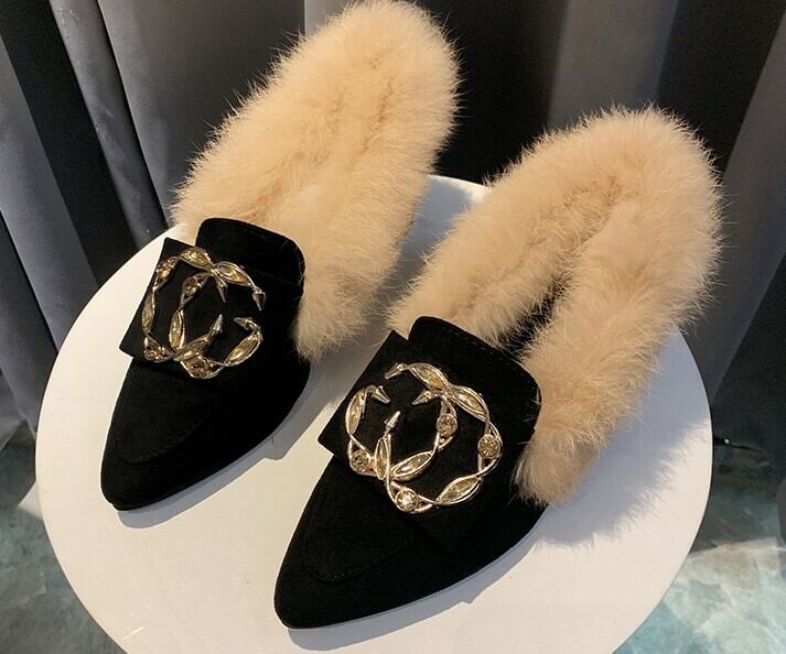 【即納】22.5cm ブラック パンプス ローヒール バックファー ブラック バックル 22.5cm 秋 冬 大人キレイ 大人可愛い 華やか 韓国 オルチャン 小さいサイズ