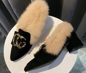 バックスタイルを彩るファーパンプス。
