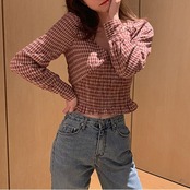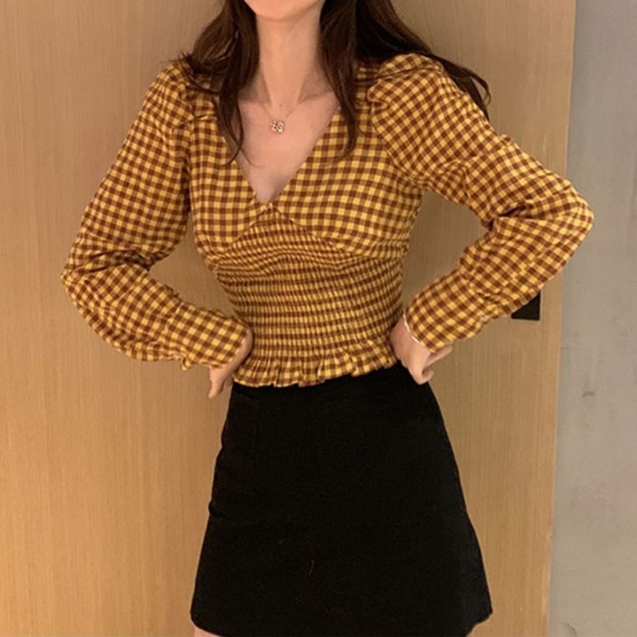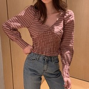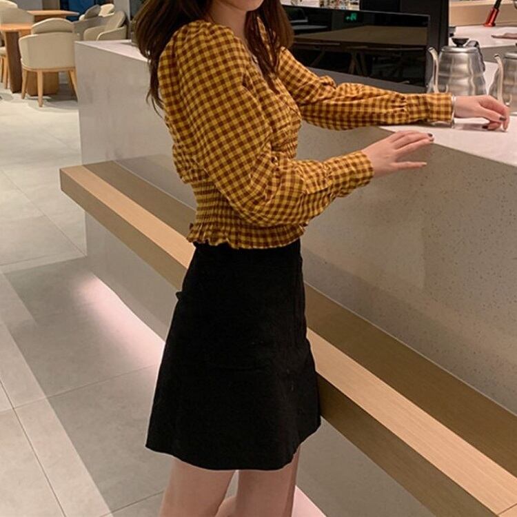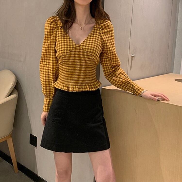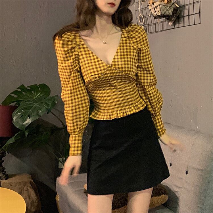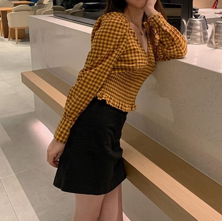 全2色 シャーリングブラウス Vネック チェック ショート丈 長袖 レトロ カジュアル お出かけ デート デイリー レッド イエロー