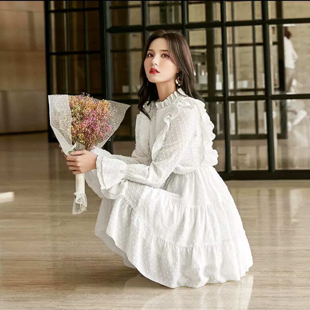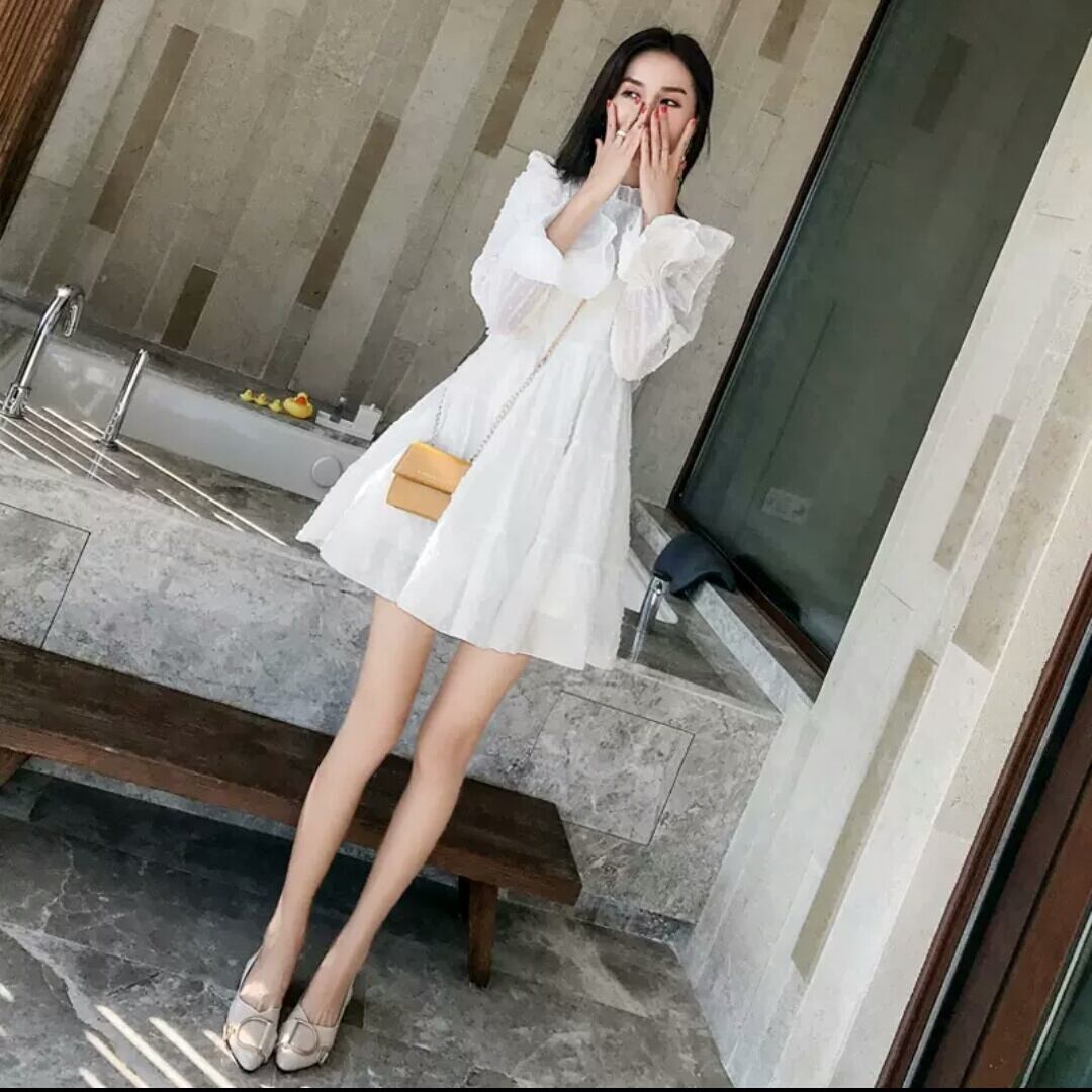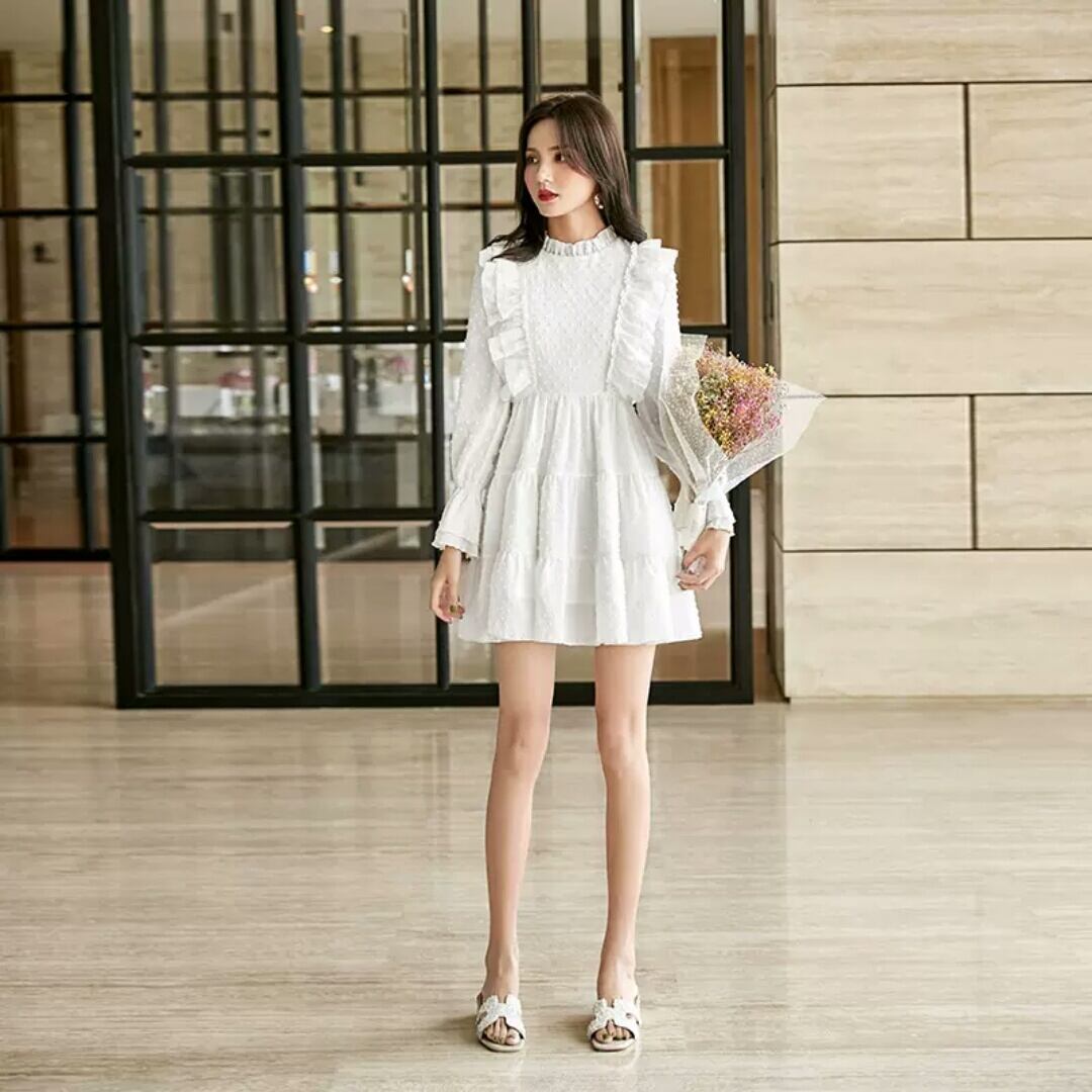 ハイウエスト ワンピース ショート丈 シフォン ミニ丈 大人 可愛い エレガント 上品 シンプル 無地 長袖 お出かけ お買い物 デート 女子会 春 秋 通学 学生 通勤 韓国ファッション