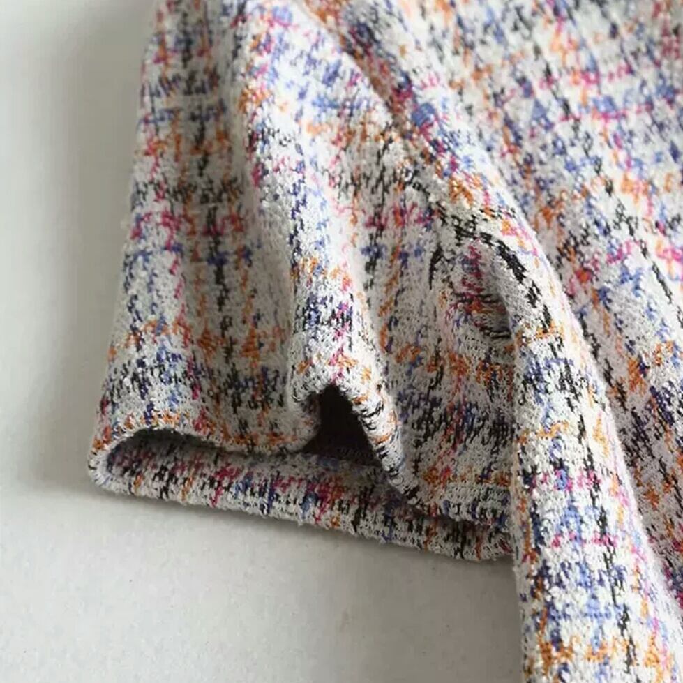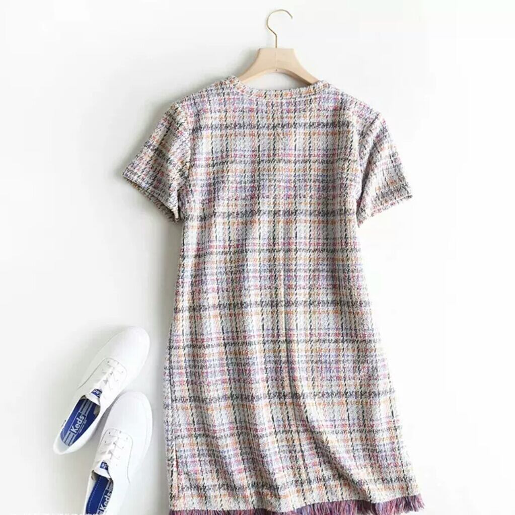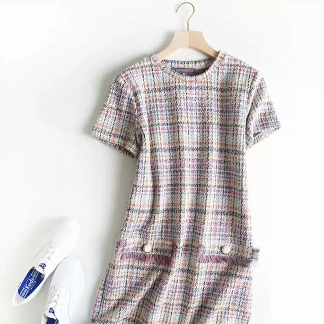 半袖 ラウンドネック チェック柄 明るめ ワンピース フリンジ 大人 可愛い エレガント 上品 キレイめ カジュアル お出かけ お買い物 デート 女子会 春 夏 通学 学生 通勤 韓国ファッション