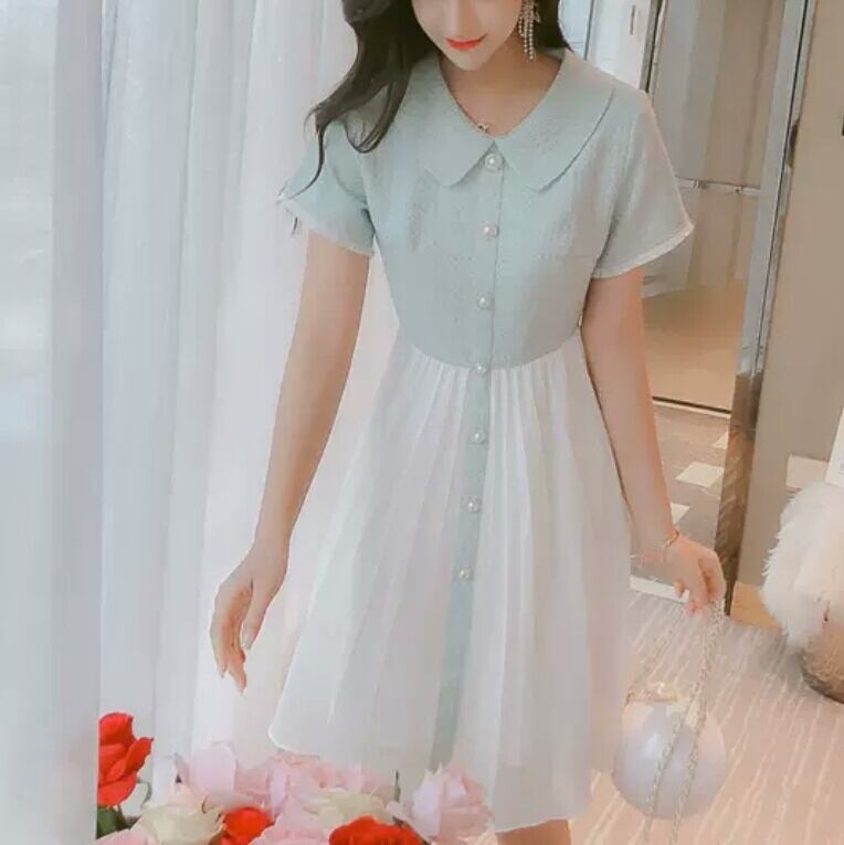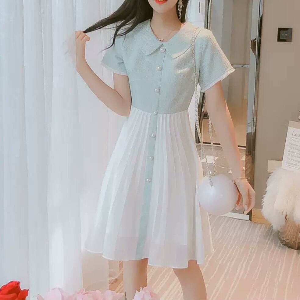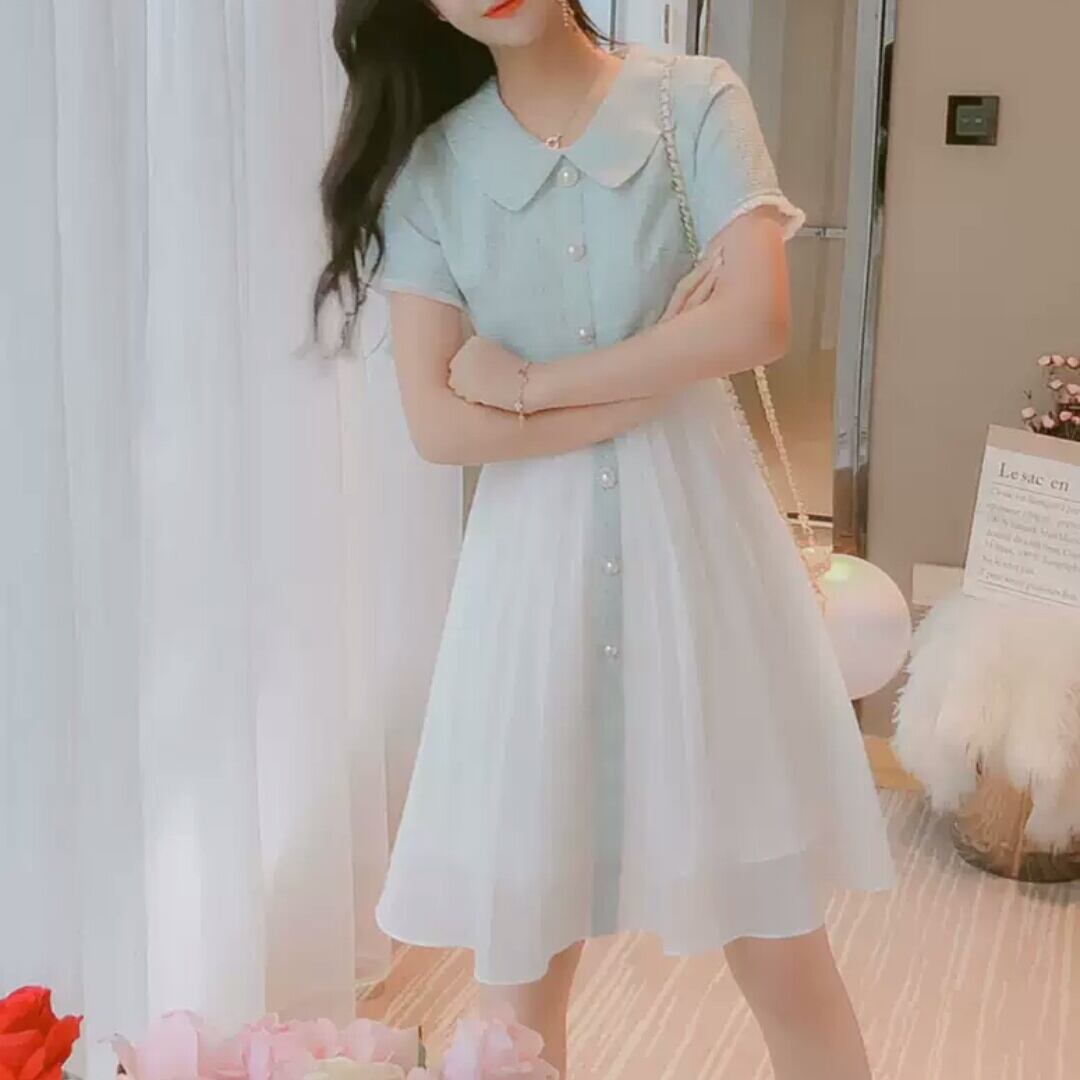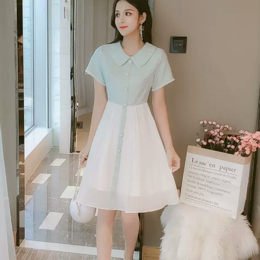 襟つき ショート丈 ふんわり ワンピース ミニ丈 大人 可愛い エレガント 上品 キレイめ ツートーン お出かけ お買い物 デート 女子会 春 夏 通学 学生 通勤 韓国ファッション