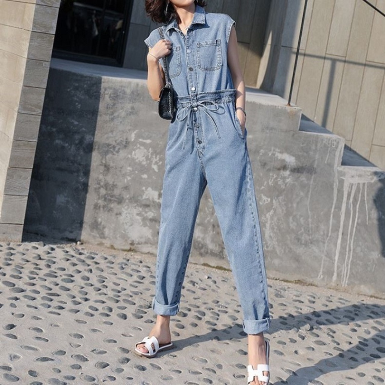デニム ジャンプスーツ オールインワン ノースリーブ アンクル丈 ハイウエスト ウエストリボン カジュアル お出かけ レジャー デイリー