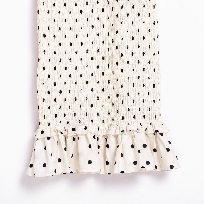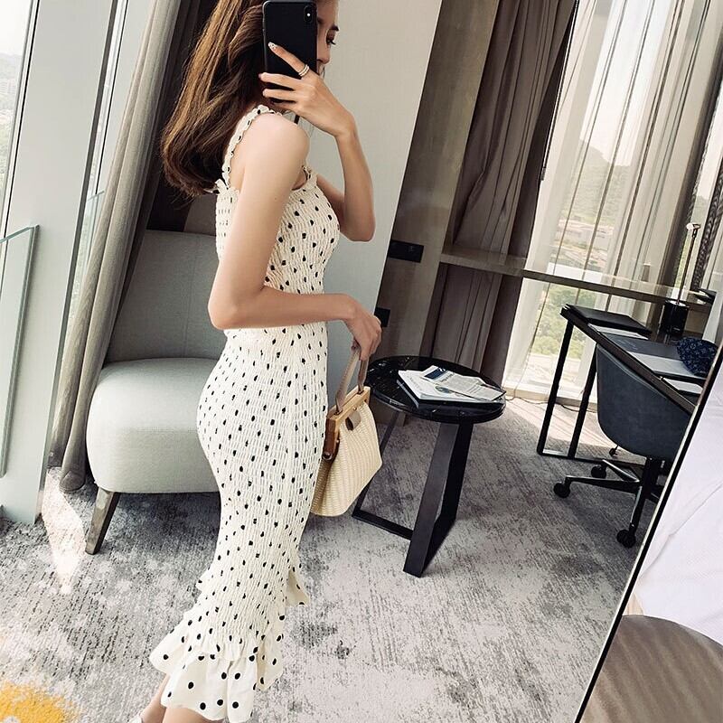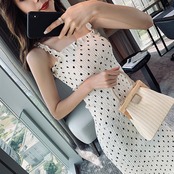 ドット柄とフリルがキュートなキャミソールドレス。