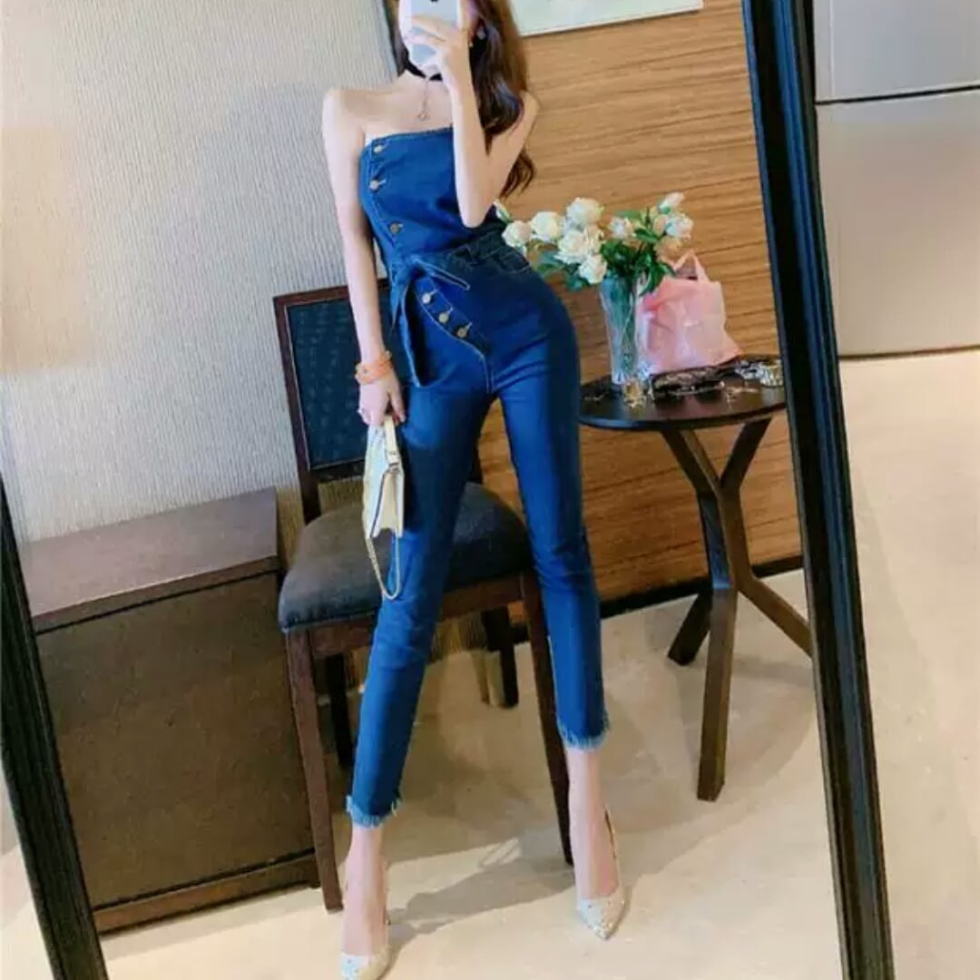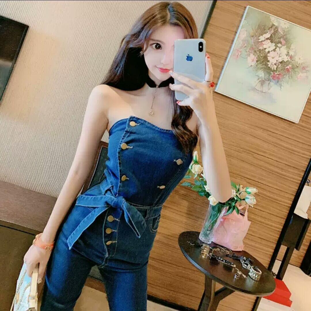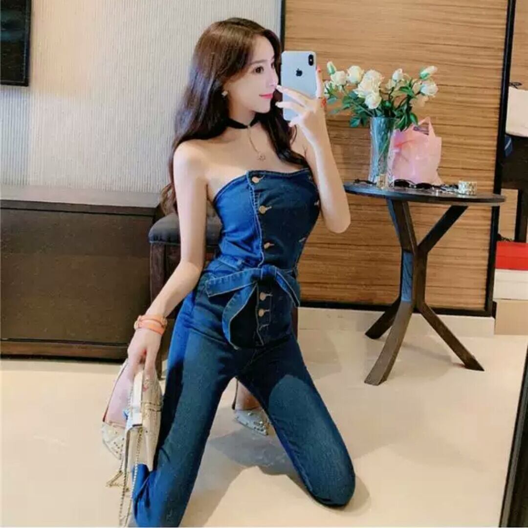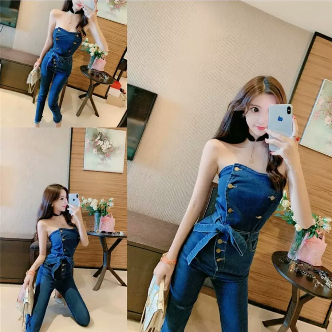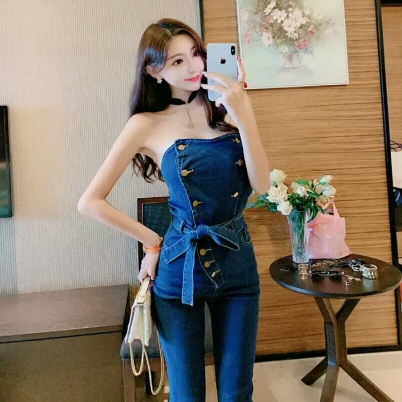 デニム ジャンプスーツ ストラップレス チューブトップ オープンバック セクシー 大人 可愛い エレガント カジュアル お出かけ お買い物 デート 女子会 春 夏 通学 学生 通勤 韓国ファッション